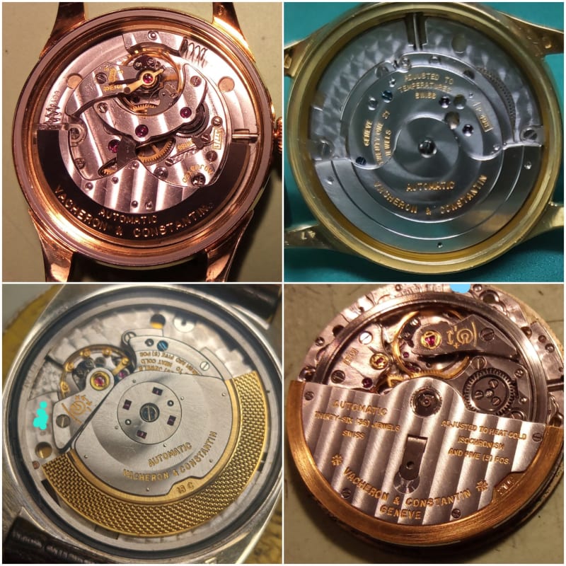 Bottom Right: We can see here the 4th generation of the AP- & VC-automatic movements -- again based on a Jaeger-ebauche, the JLC cal920: the VC cal1020 and the AP cal2020 introduced in 1967. Running on a center bearing with support by ruby on rails at the perimeter of the rotor -- which create the characteristic sound -- it was a super-thin beautiful automatic that made its large footprints in horology (AP Royal Oak ref5402, PP Nautilus ref3700 and many more) and became a classic.