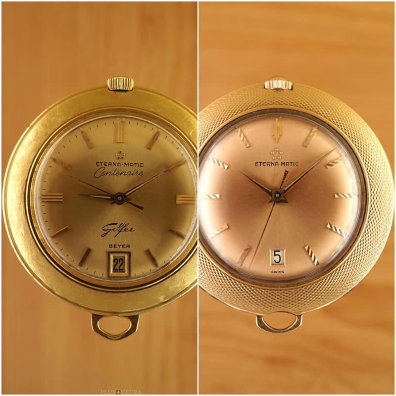 So it took quite a while for some to come around that corner but Eterna understood quite fast, that they presented an important horological milestone and so they decided to make the Golfer-pocketwatch. With the EternaMatic automatic-movement behind a see-through caseback to examine the impressive work of the EternaMatic. Cased in solid gold. And the fact that the biggest and best in horology (ie. Beyer, Zurich) were keen to print their name on the dial of such a watch, when they sold it, indicates that these were very important icons during that era: the 1950s and 1960s.