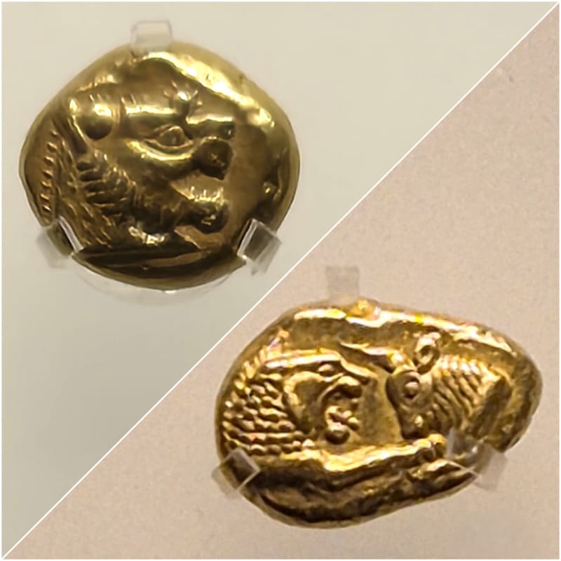 The Start of a Merry-Go-Round that takes Everyone with it; the Killer of All Debts, Public (!) & Private: The 1st Coin (top / left) Minted in the Ancient Kingdom Lydia from Electrum (natural alloy of Gold & Silver) approx 2'700y ago (<650BC). The 1st Coin (bottom / right) minted from Gold by the Lydian King Kroisos approx 550BC.