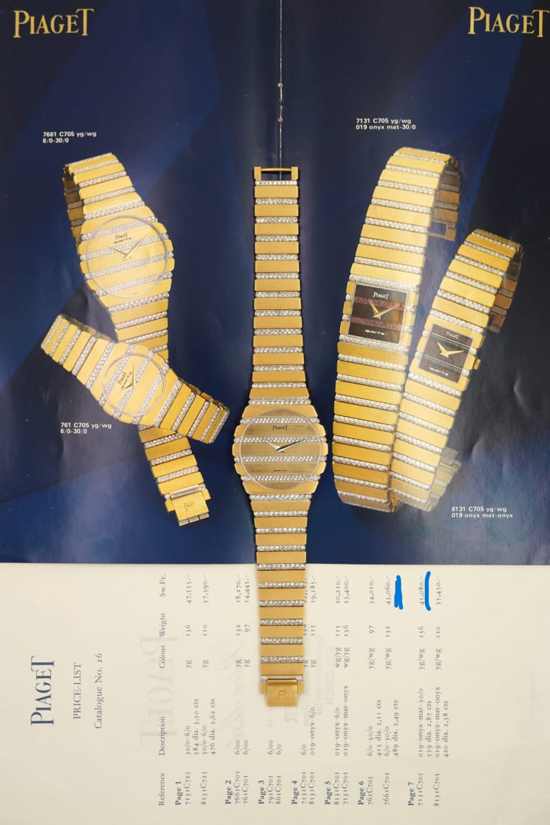 The center-page of the 1982-Piaget catalogue was set for the Zebras: a round men- & women-version and a rectangular men- & women-version of the Piaget Polo in yellowgold with whitegold interlinks set with approx 400 to 500 brilliant-cut diamonds -- each, of course. Not only positioned prominently in the catalogue but also on the top of the price-list in 1982: CHF43'060 for the round Jumbo (7661C705) and even CHF45'080 for the rectangular Jumbo (7131C705). A translation of this price to its equivalent more than 40y later is not easy but would exceed CHF150'000 in 2025, for sure.