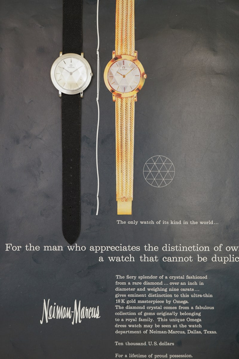 In 1959 Omega made a piece-unique with a faceted crystal from a 9ct-diamond -- see the Neiman-Marcus- / Omega-magazine advertisement -- and in the same year they started to make similar faceted crystals from sapphire: The 1959-introduced Omega Damier "Star-Watch", ref14741. And it was not only a special and horological important watch but also one of their most exclusive and most expensive back-then.