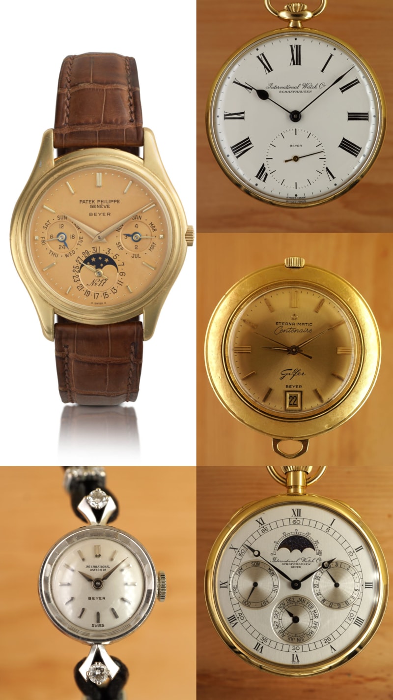 Just a few years before the Patek Calendar wristwatch was sold by Beyer they proudly marked a similar impressive IWC Calendar pocketwatch with their now-popular doublesignature "BEYER" (~1980, bottom-right).