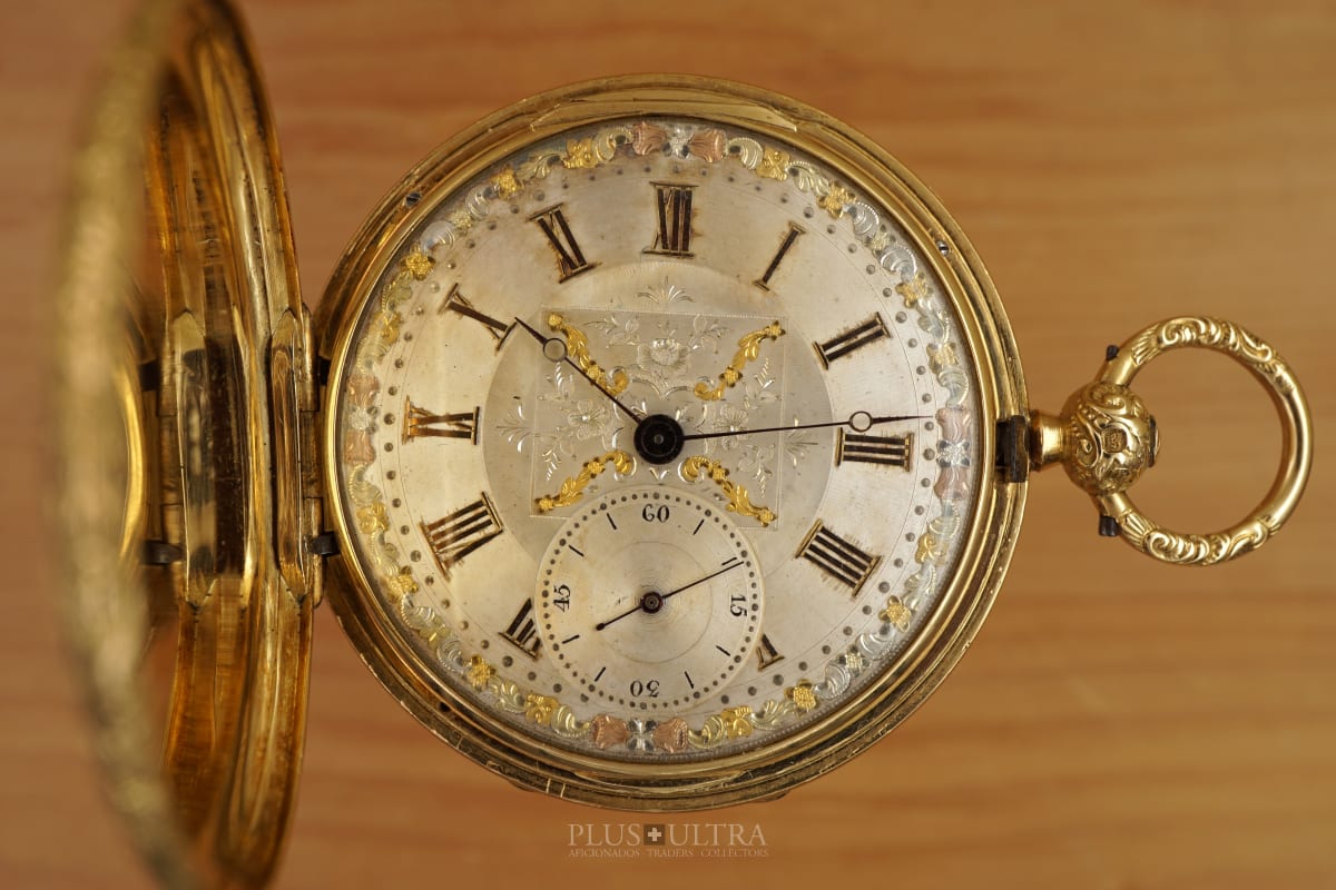 We can date this full-hunter pocketwatch to 1842 according to the London hallmark in the 18K-case; and this makes this watch a late artefact of the master, just before his colleague Charles Frodsham took over his shop in 84 Strand, London after J. R. Arnolds death in 1843. The case is lavish decorated with floral-decoration as is the dial coming with this timepiece. Additional to the floral golden dial this watch comes with another very classic supplementary original white dial with black printed roman numerals and "Arnold 84 Strand London, 209X" printed -- also in excellent condition as the watch overall.
