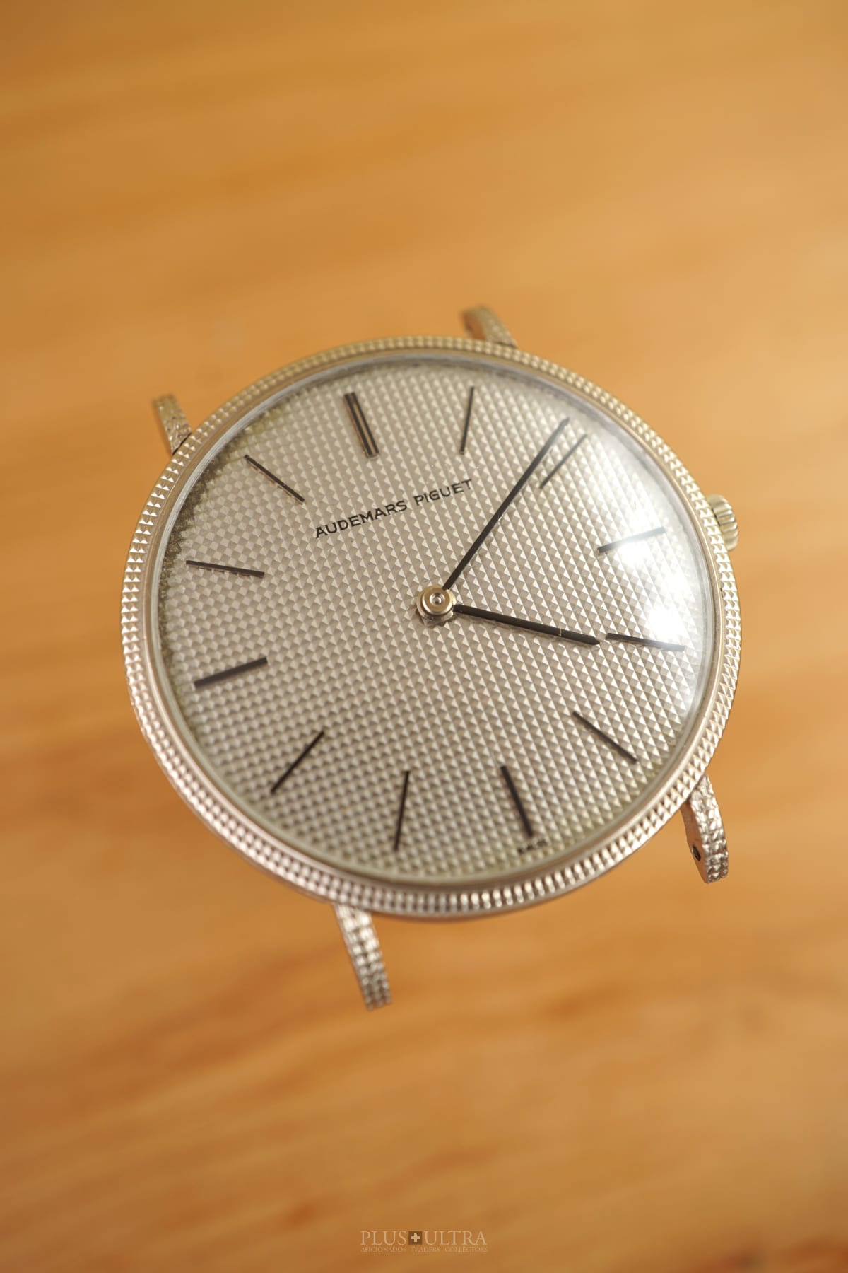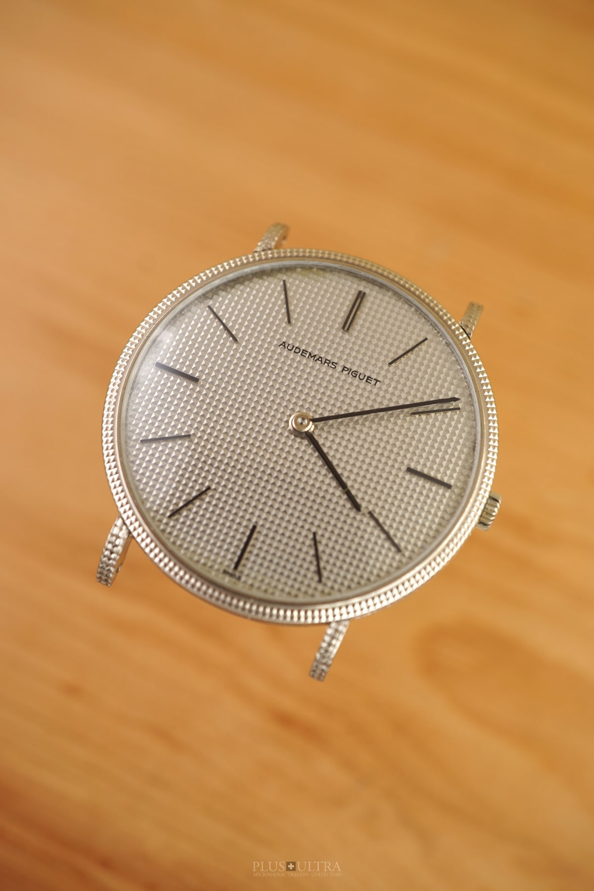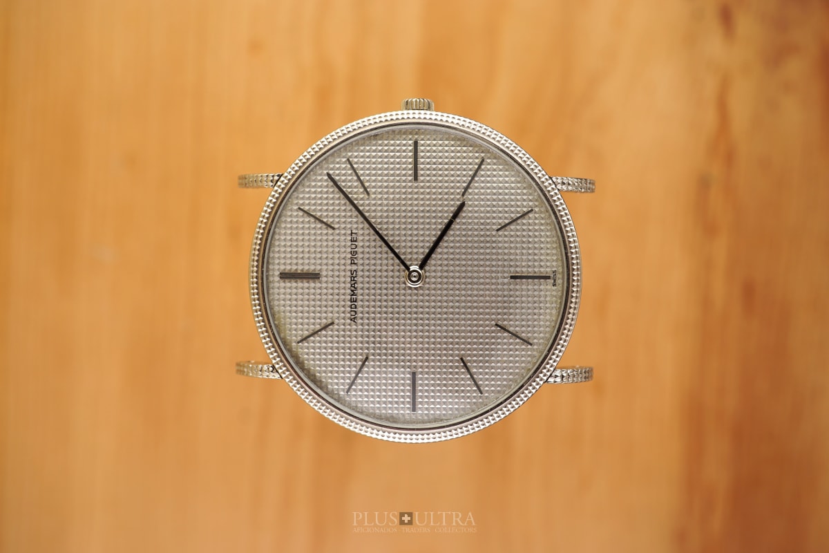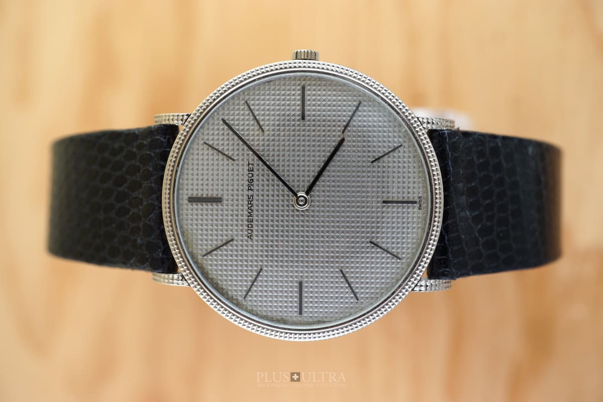The Hobnail-Grail: Characteristic and deep guilloche-finish on the case (33.5mm, made by Eggly & Cie for AP), on the dial and on the lugs as well -- a Audemars Classic in the round Calatrava-style and unbeaten appearance. We date the watch to (approx) 1975 according to our books and research and it appears to be in excellent and -- as it seems -- unpolished condition, making this 18K-whitegold example of a beautiful classic even rarer.