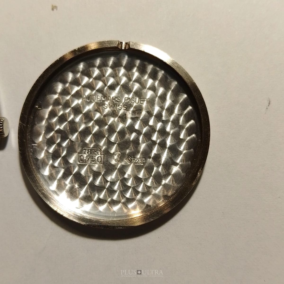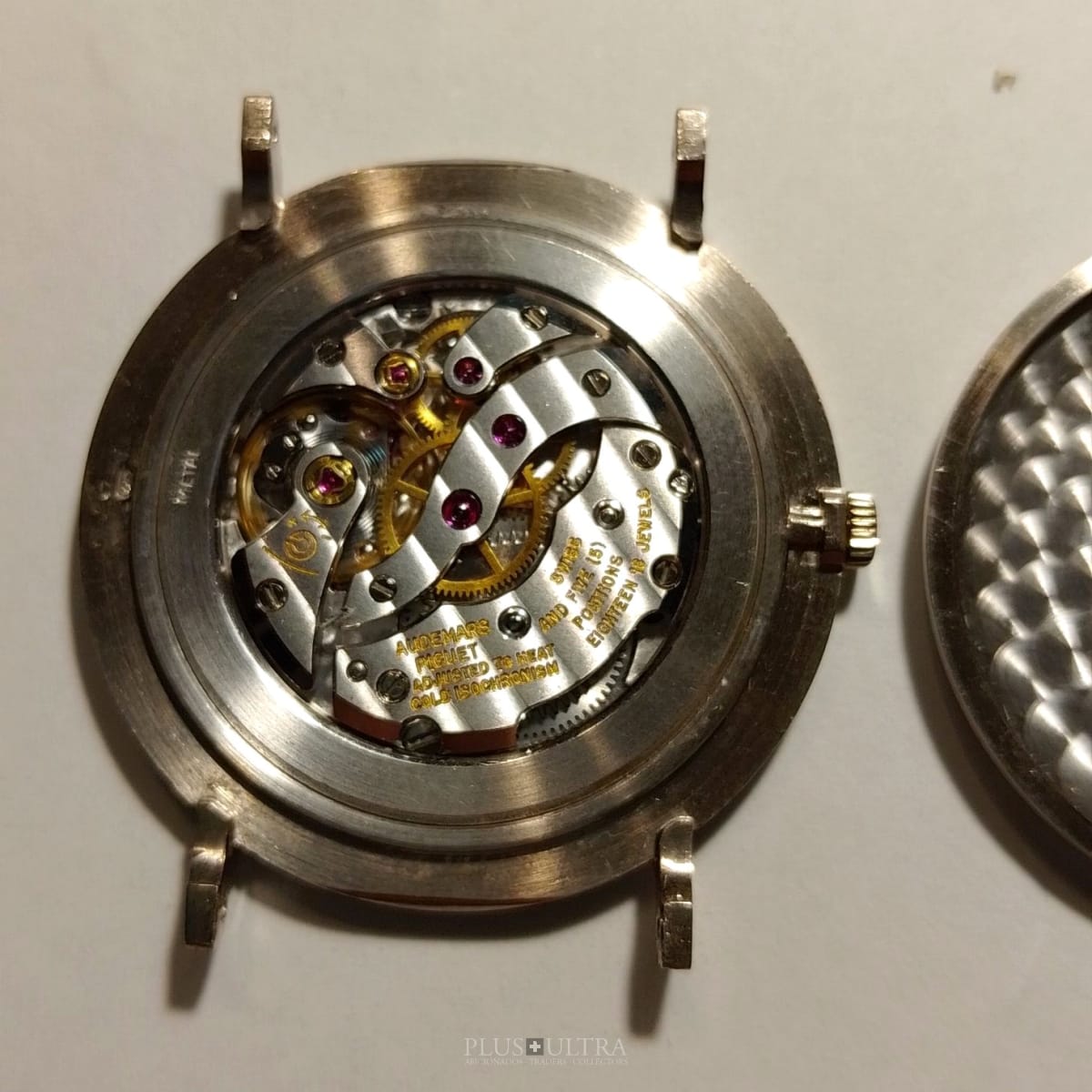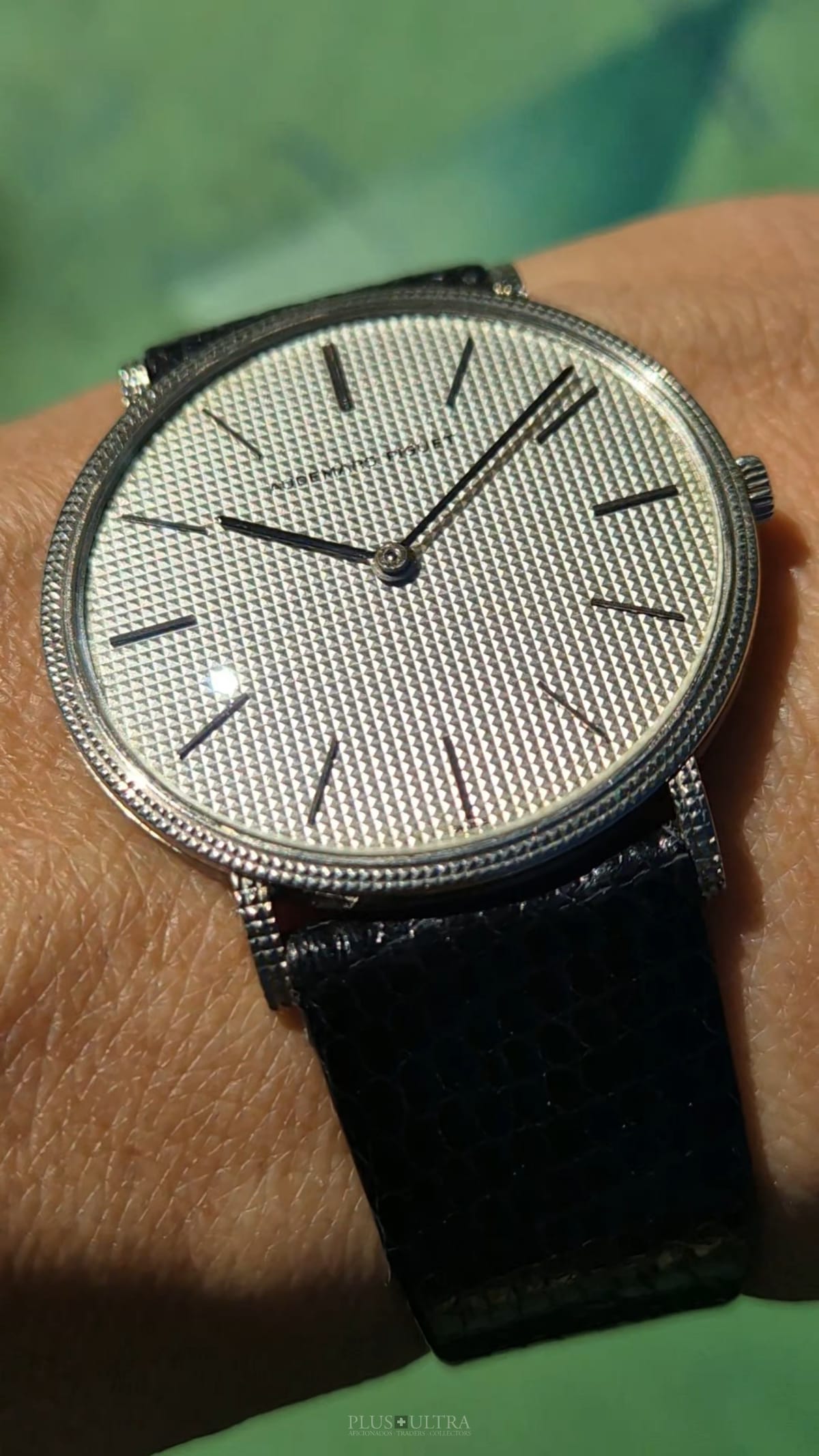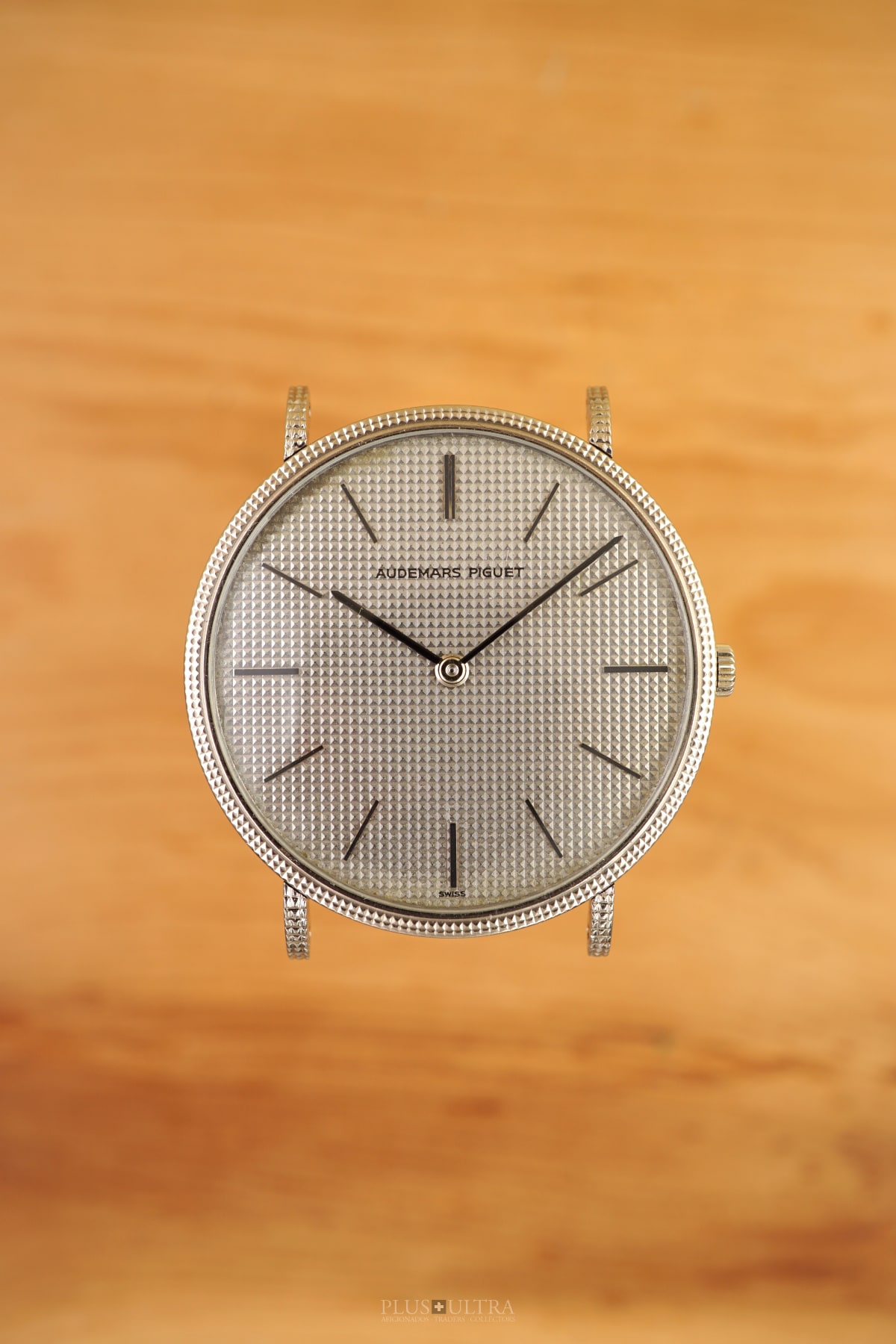 The Hobnail-Grail: Characteristic and deep guilloche-finish on the case (33.5mm, made by Eggly & Cie for AP), on the dial and on the lugs as well -- a Audemars Classic in the round Calatrava-style and unbeaten appearance. We date the watch to (approx) 1975 according to our books and research and it appears to be in excellent and -- as it seems -- unpolished condition, making this 18K-whitegold example of a beautiful classic even rarer.