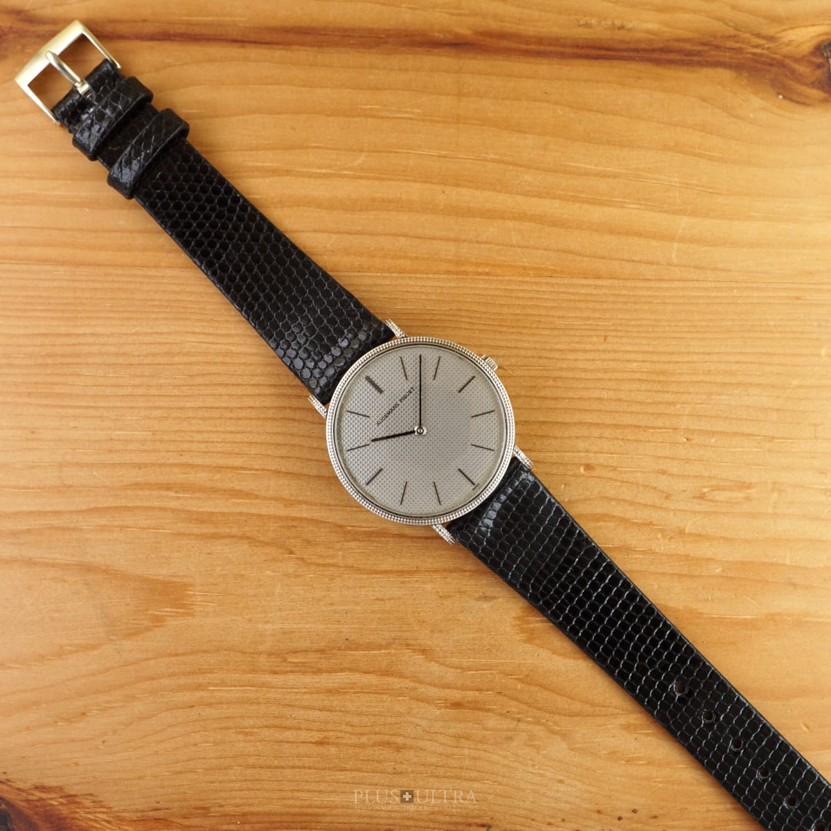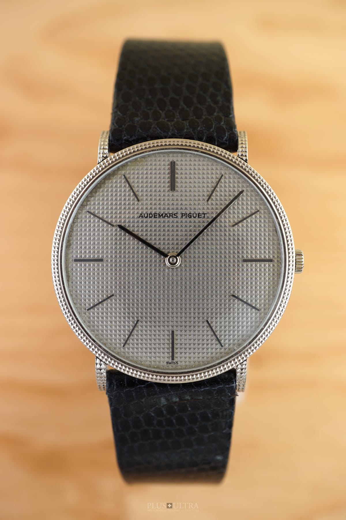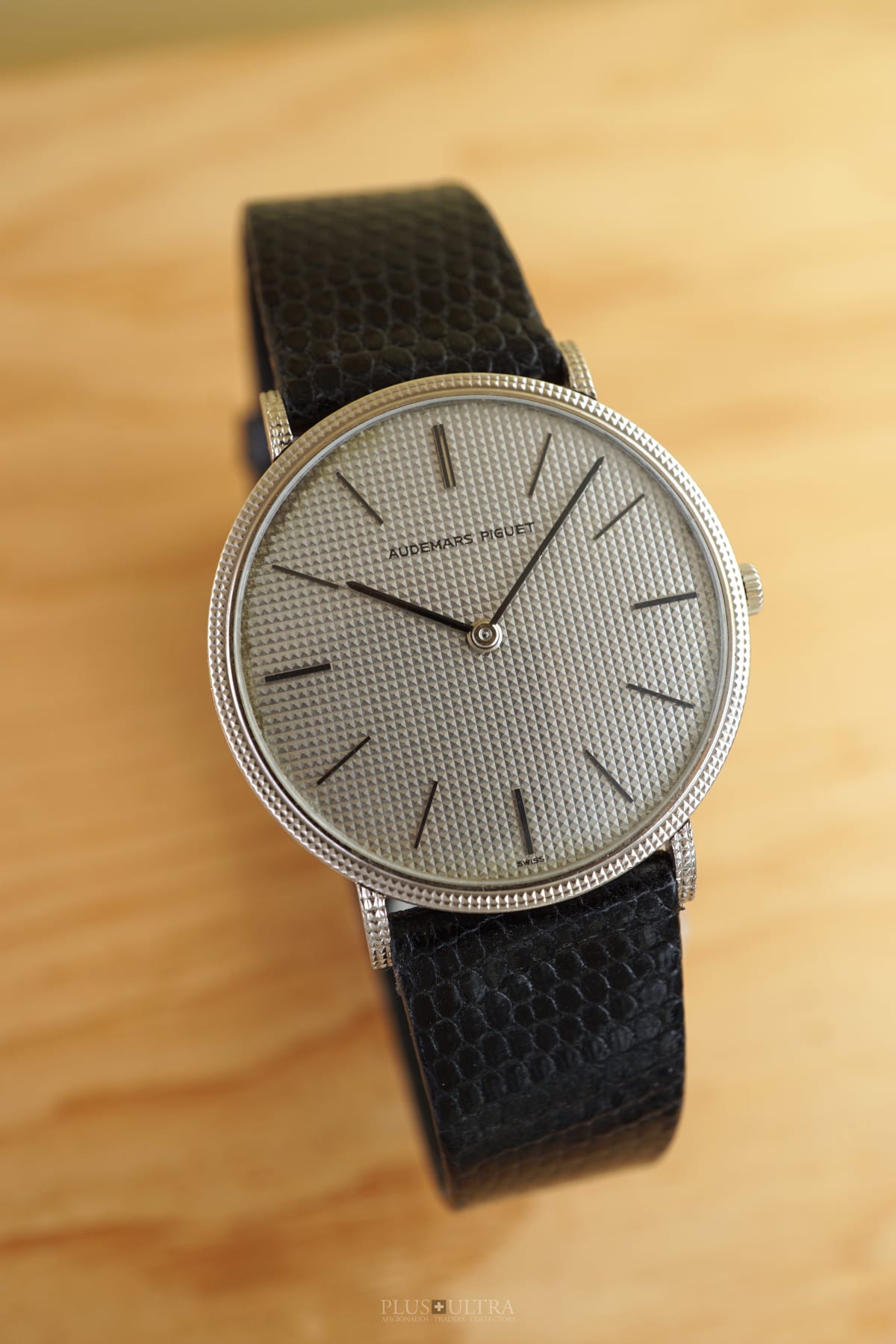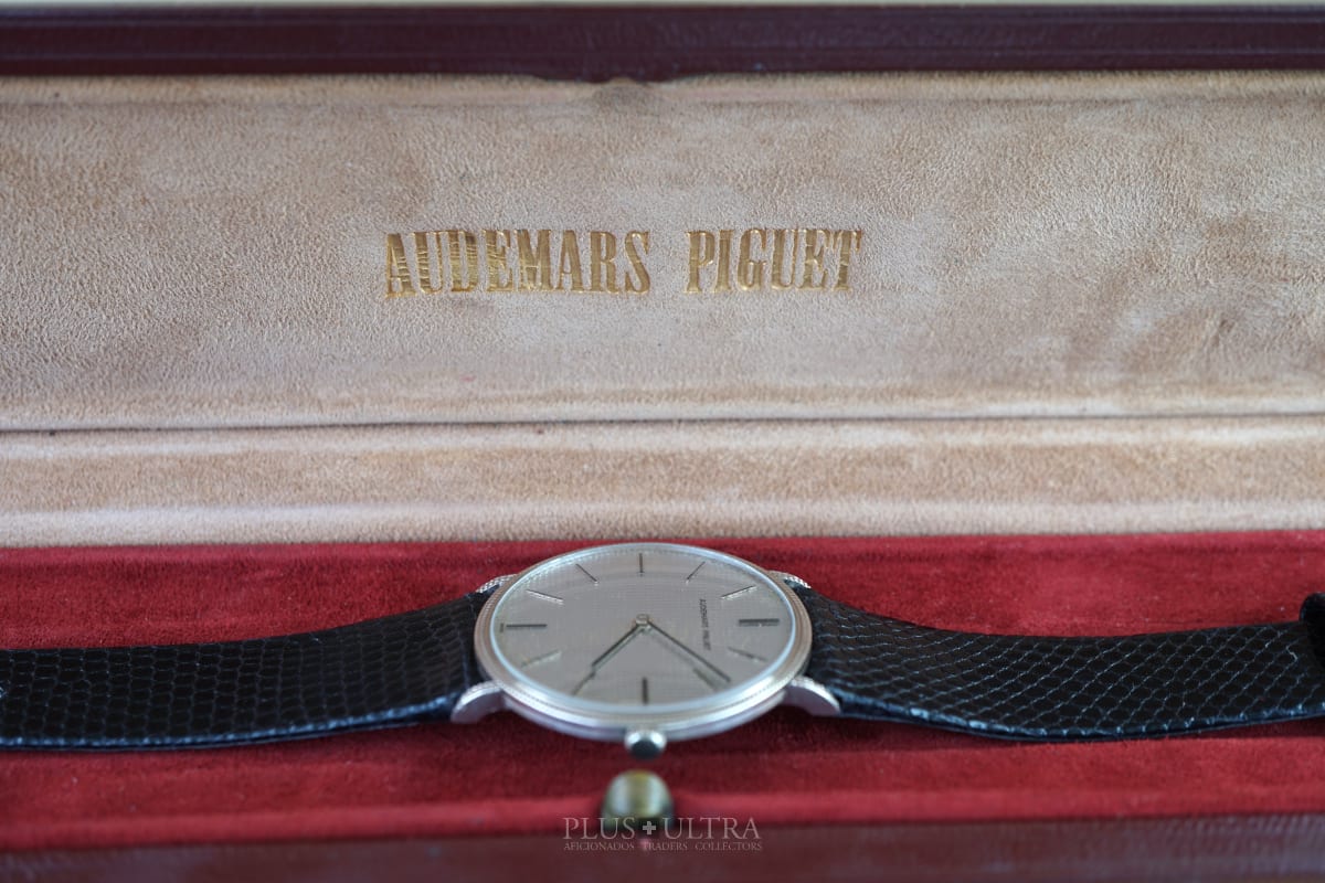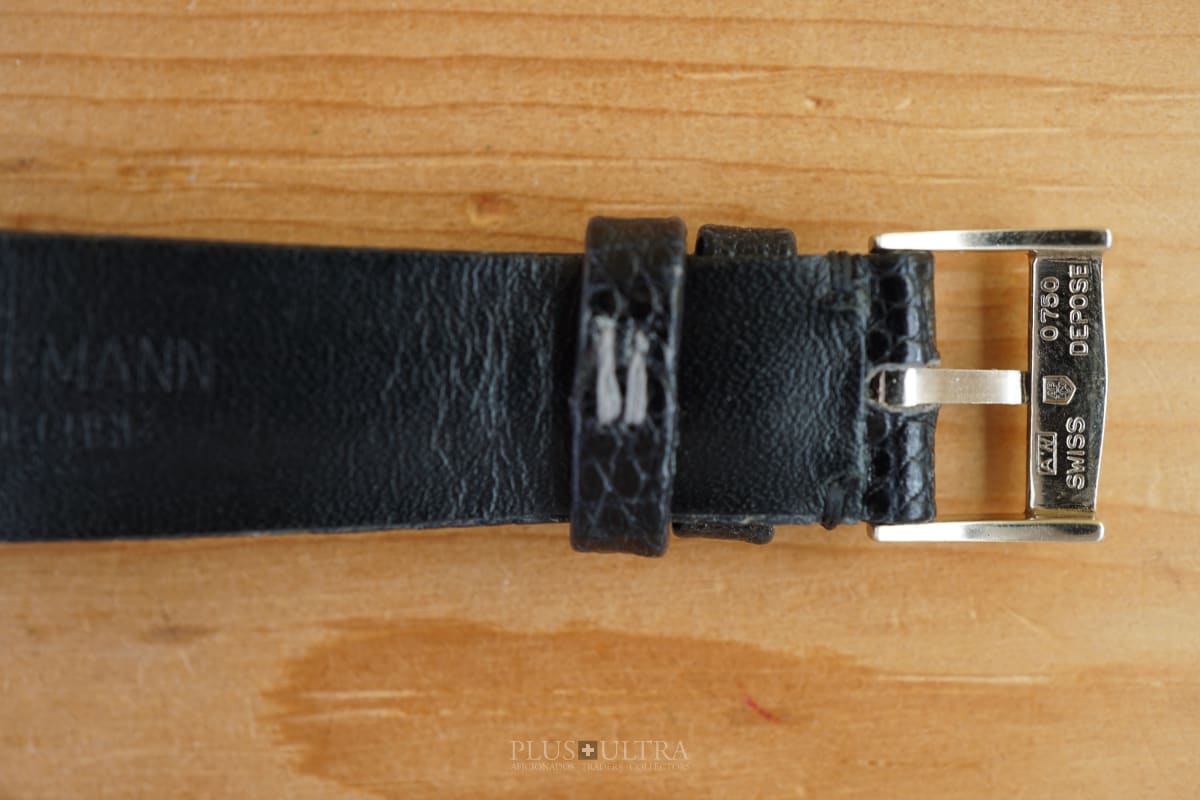 The manual AP cal2001 (serialnumber 151'XXX) was cleaned and is running fine and precise. We present it with its fitted AP-box and a AP-buckle in 18K-whitegold that is connected by a black high quality lizardskin-strap to the 18K-whitegold case.
