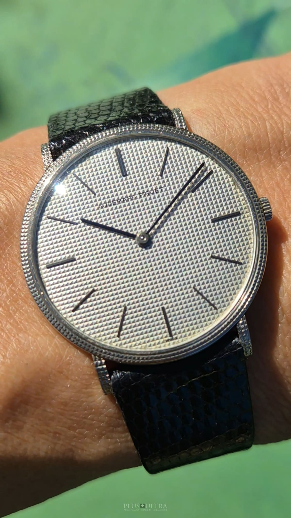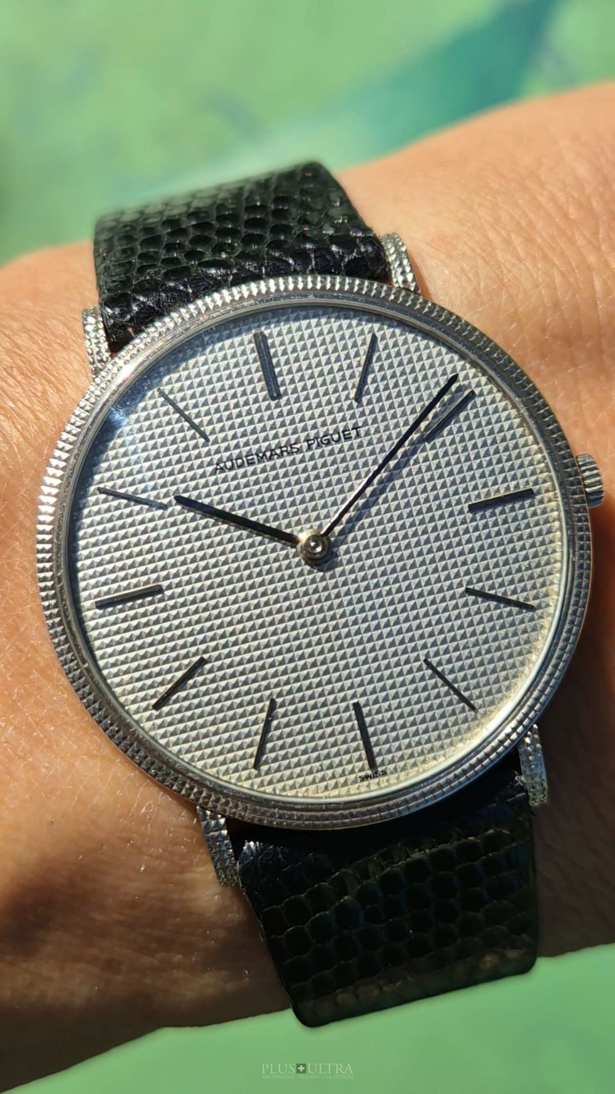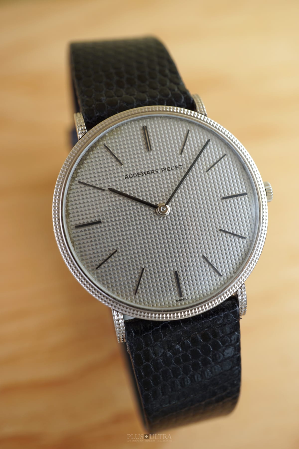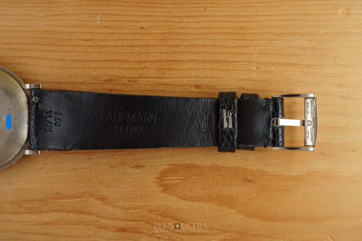 The manual AP cal2001 (serialnumber 151'XXX) was cleaned and is running fine and precise. We present it with its fitted AP-box and a AP-buckle in 18K-whitegold that is connected by a black high quality lizardskin-strap to the 18K-whitegold case.