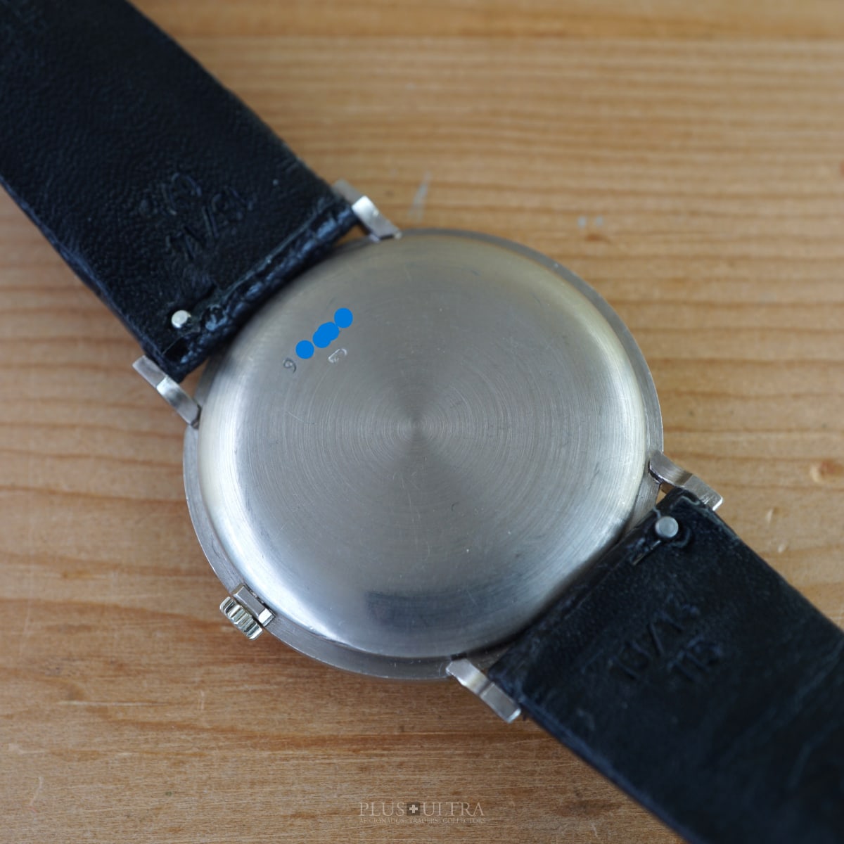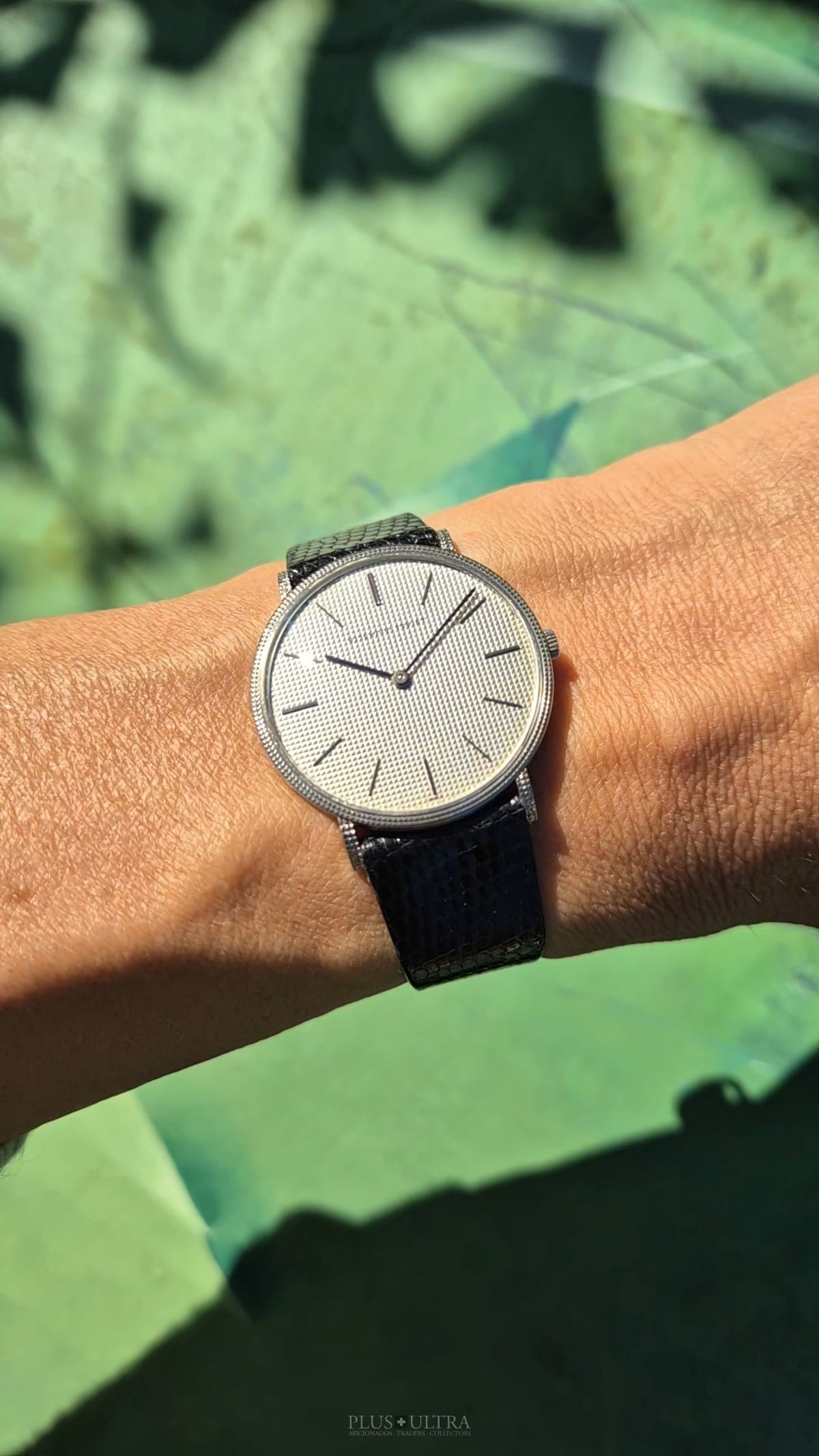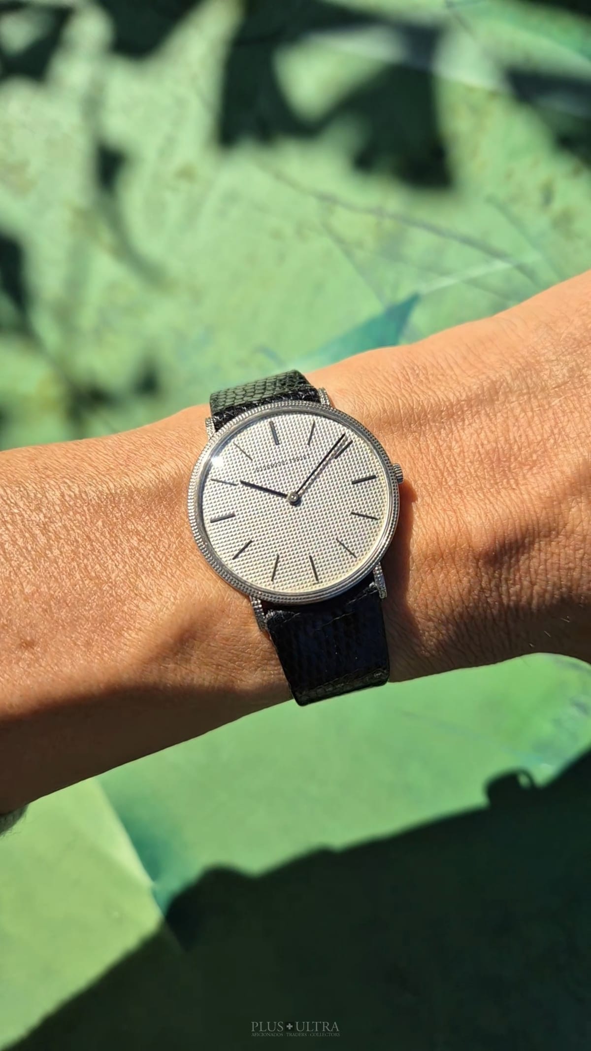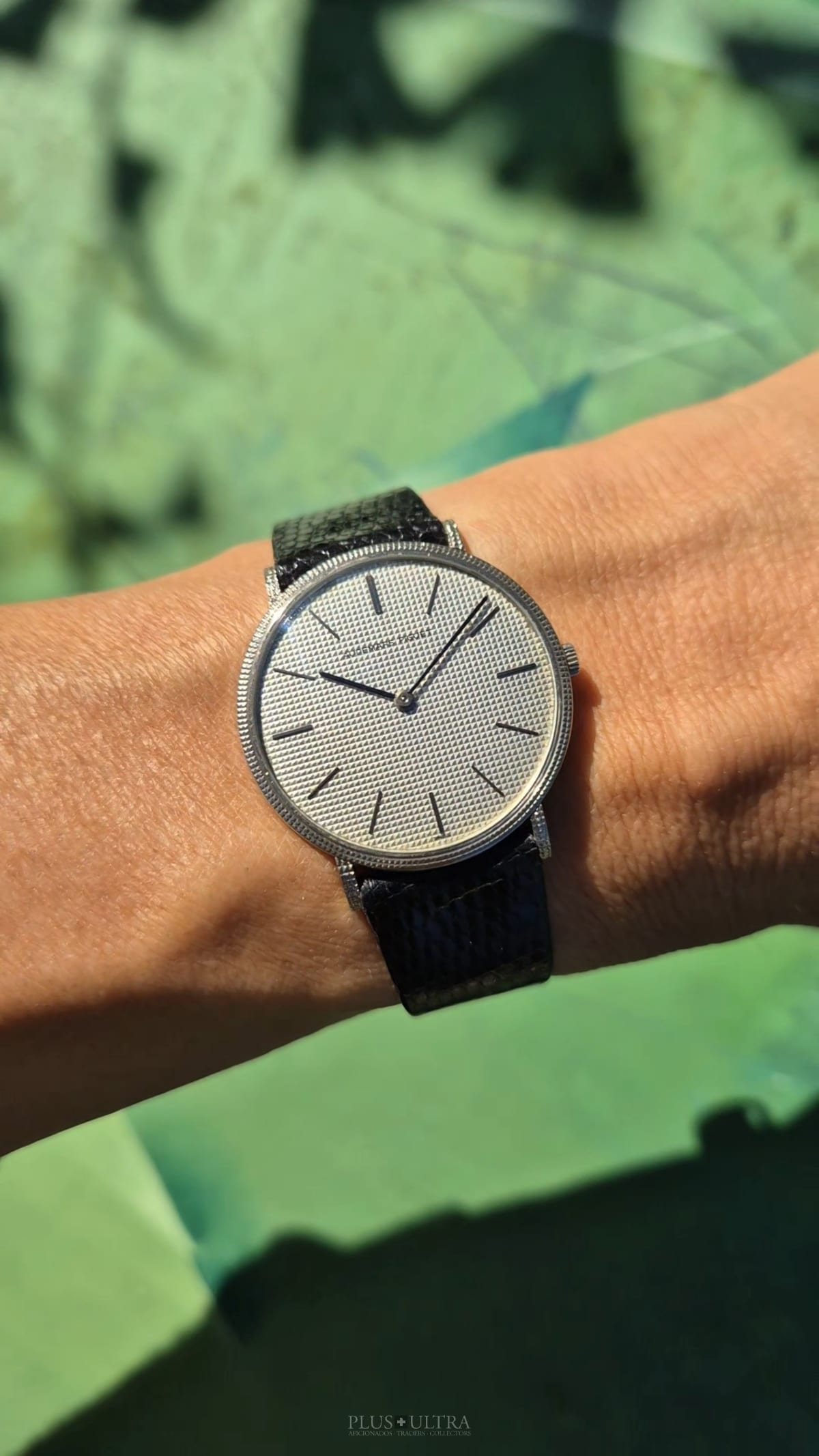 The manual AP cal2001 (serialnumber 151'XXX) was cleaned and is running fine and precise. We present it with its fitted AP-box and a AP-buckle in 18K-whitegold that is connected by a black high quality lizardskin-strap to the 18K-whitegold case.