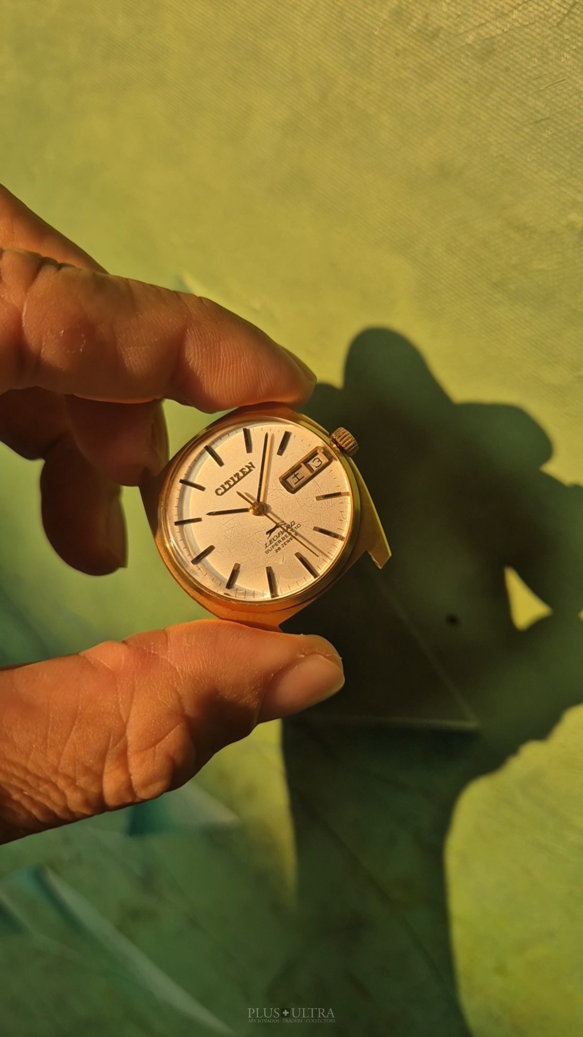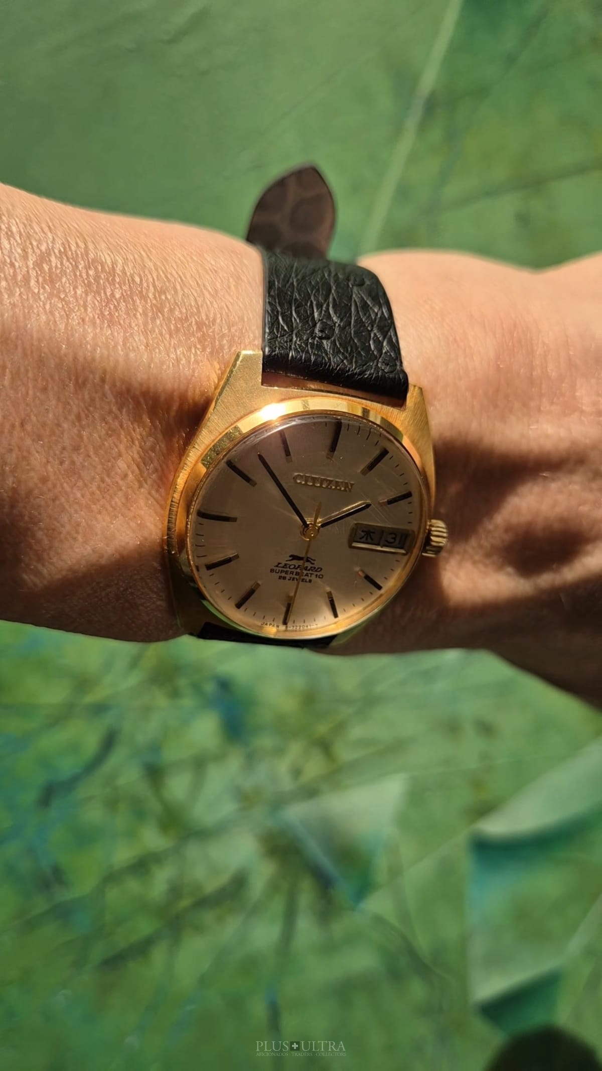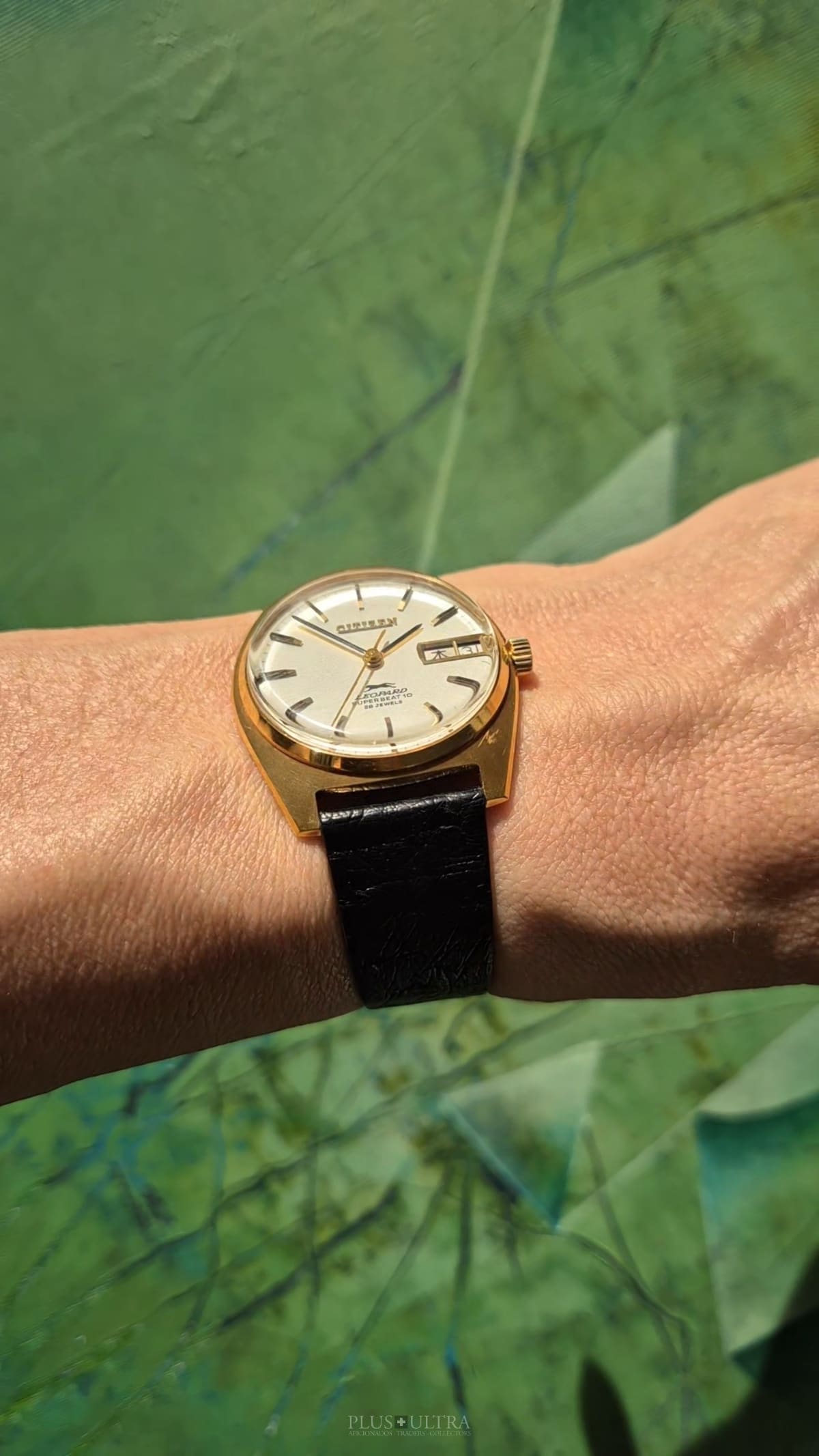 Made in Dec 1970 as indicated by the serialnumber stamped on the caseback and Citizens finest in 1970. The Citizen cal7230 has a seconds-hack feature and a daydate-mechanism; it is running flawless & precise on 5Hz -- the hibeat-frequency that is also used by Rolex' in its new cal7135 since 2025. Yes, high frequency-mechanicals were quite a thing more than 50y ago but fell victim to the upcoming electronics. First presented by Girard Perregaux in 1966 in their GyroMatic cal32A then used by many others (Ulysse Nardin, Seiko, Omega, Longines, Eterna etc) in their best mechanical-movements with its almost sweeping seconds-hand.