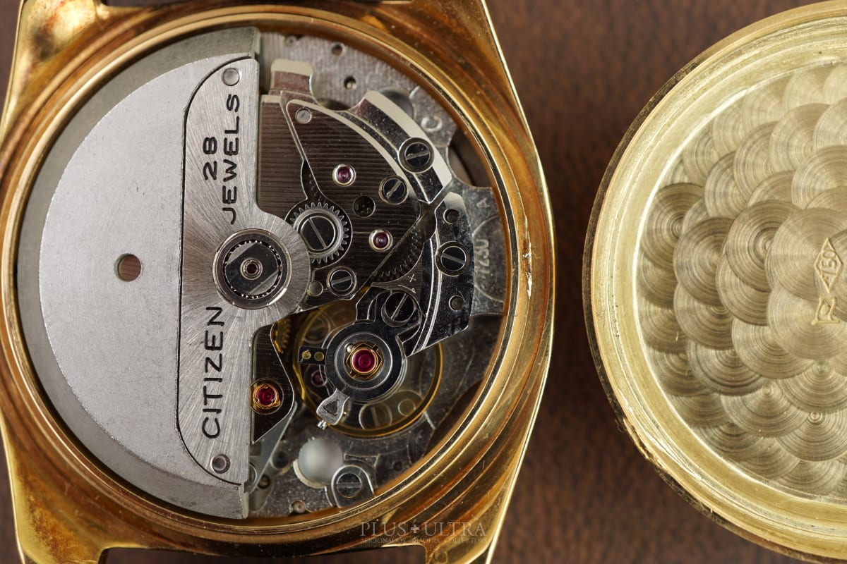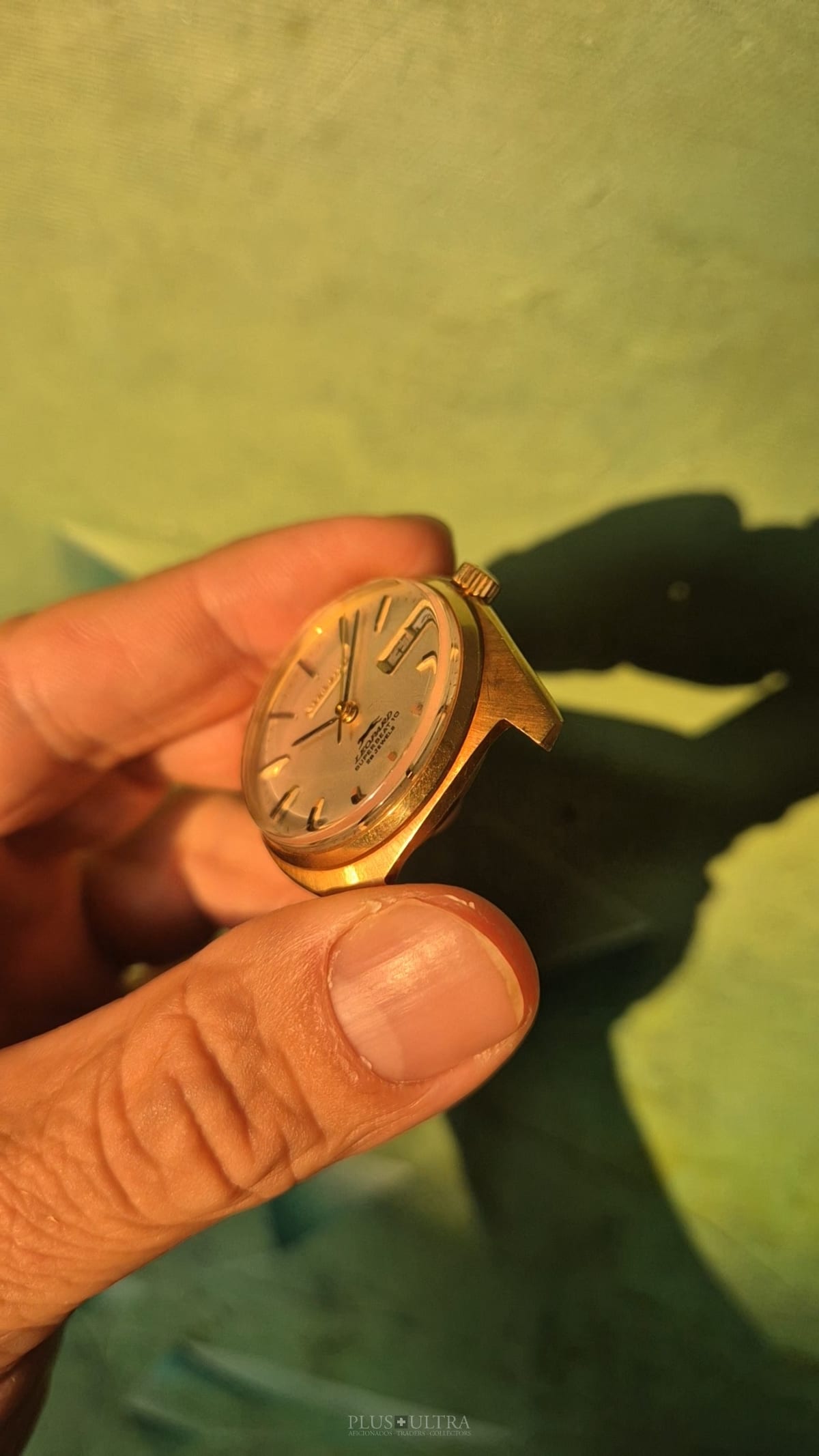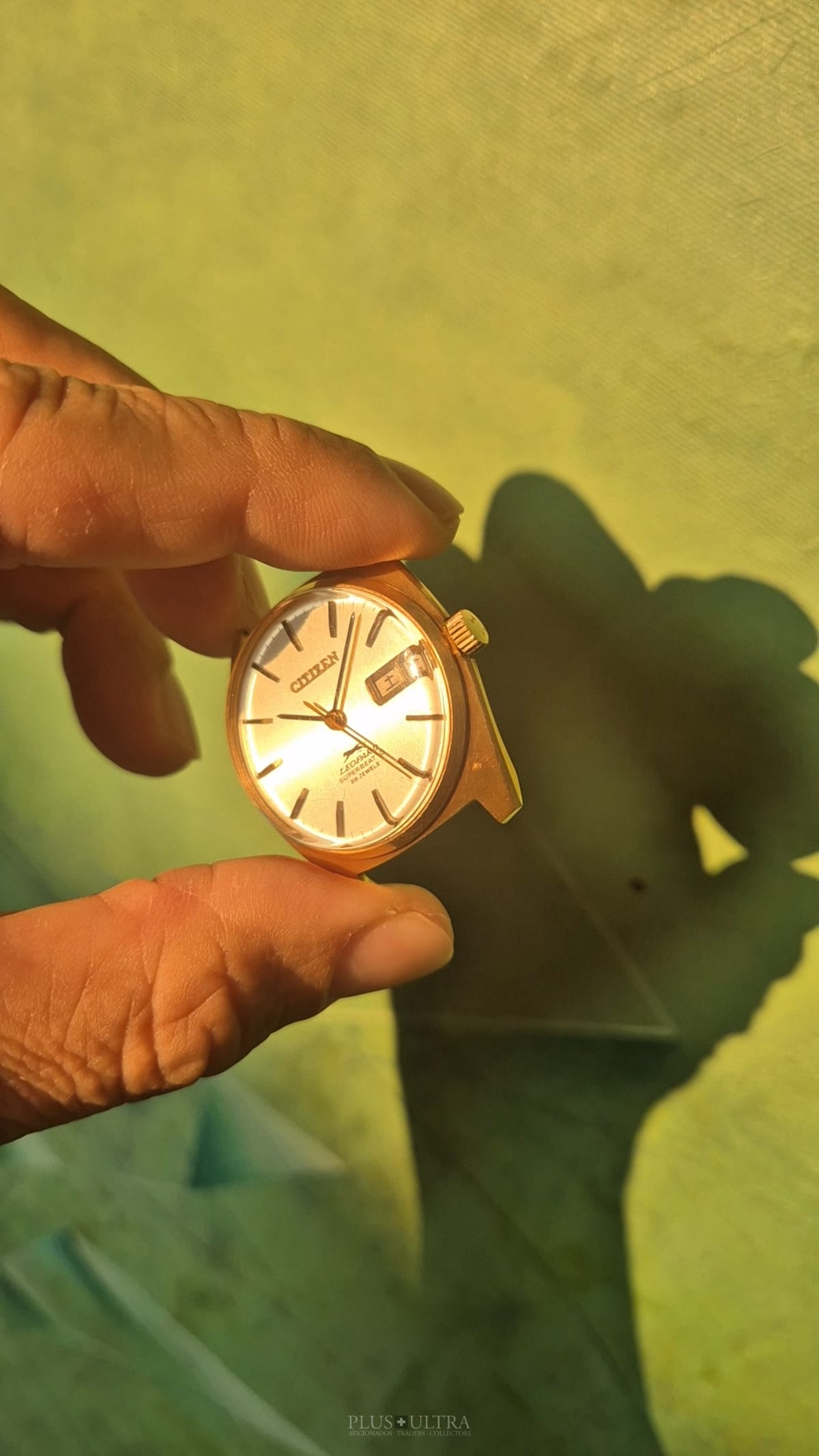 Made in Dec 1970 as indicated by the serialnumber stamped on the caseback and Citizens finest in 1970. The Citizen cal7230 has a seconds-hack feature and a daydate-mechanism; it is running flawless & precise on 5Hz -- the hibeat-frequency that is also used by Rolex' in its new cal7135 since 2025. Yes, high frequency-mechanicals were quite a thing more than 50y ago but fell victim to the upcoming electronics. First presented by Girard Perregaux in 1966 in their GyroMatic cal32A then used by many others (Ulysse Nardin, Seiko, Omega, Longines, Eterna etc) in their best mechanical-movements with its almost sweeping seconds-hand.