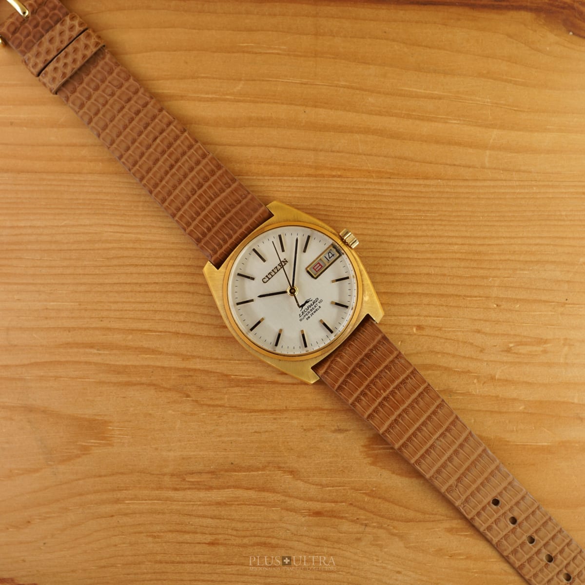 The Leopard SuperBeat 10 was approximately two times as expensive as the very fine adjusted Glorious Citizen (GC) and is one of the rarest vintage Citizen. Heavy solid-gold tonneau-shaped case (34mm without crown * 37.5mm lug-to-lug) with its original sunburst finish. The dial is of high quality and original in every aspect as well; beautiful preserved and a joy to look at, with its blacked minutes- & hours-hand and indexes (faceted) and the applied CITIZEN-logo.