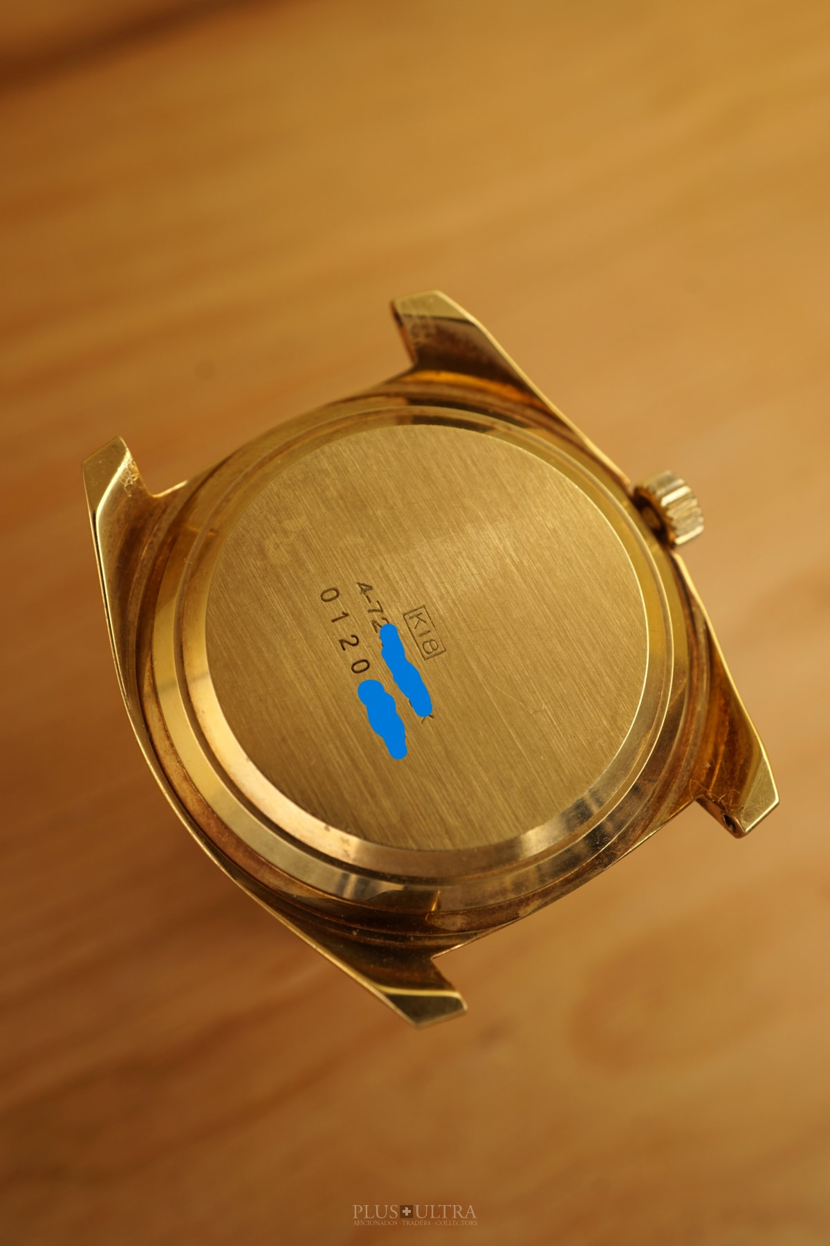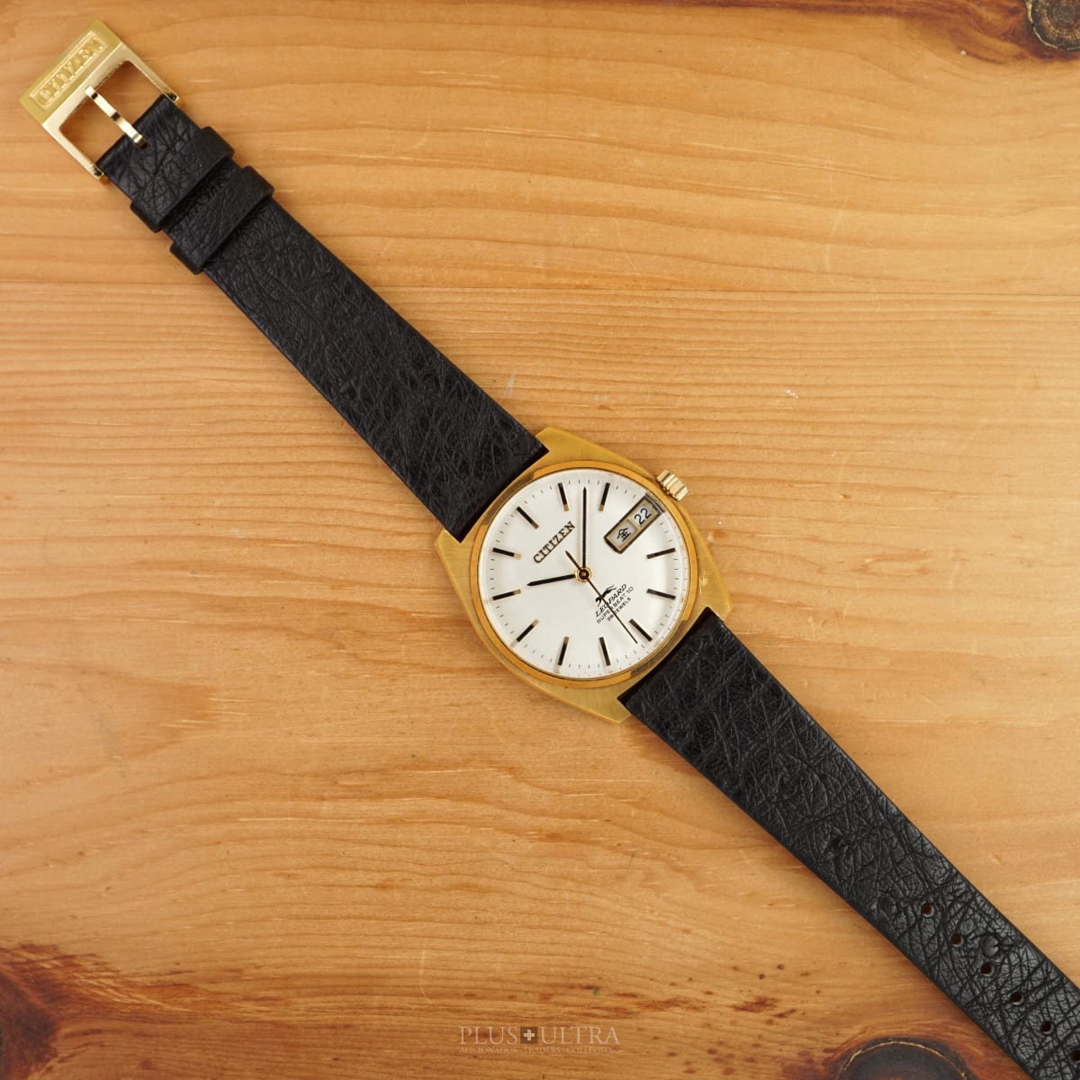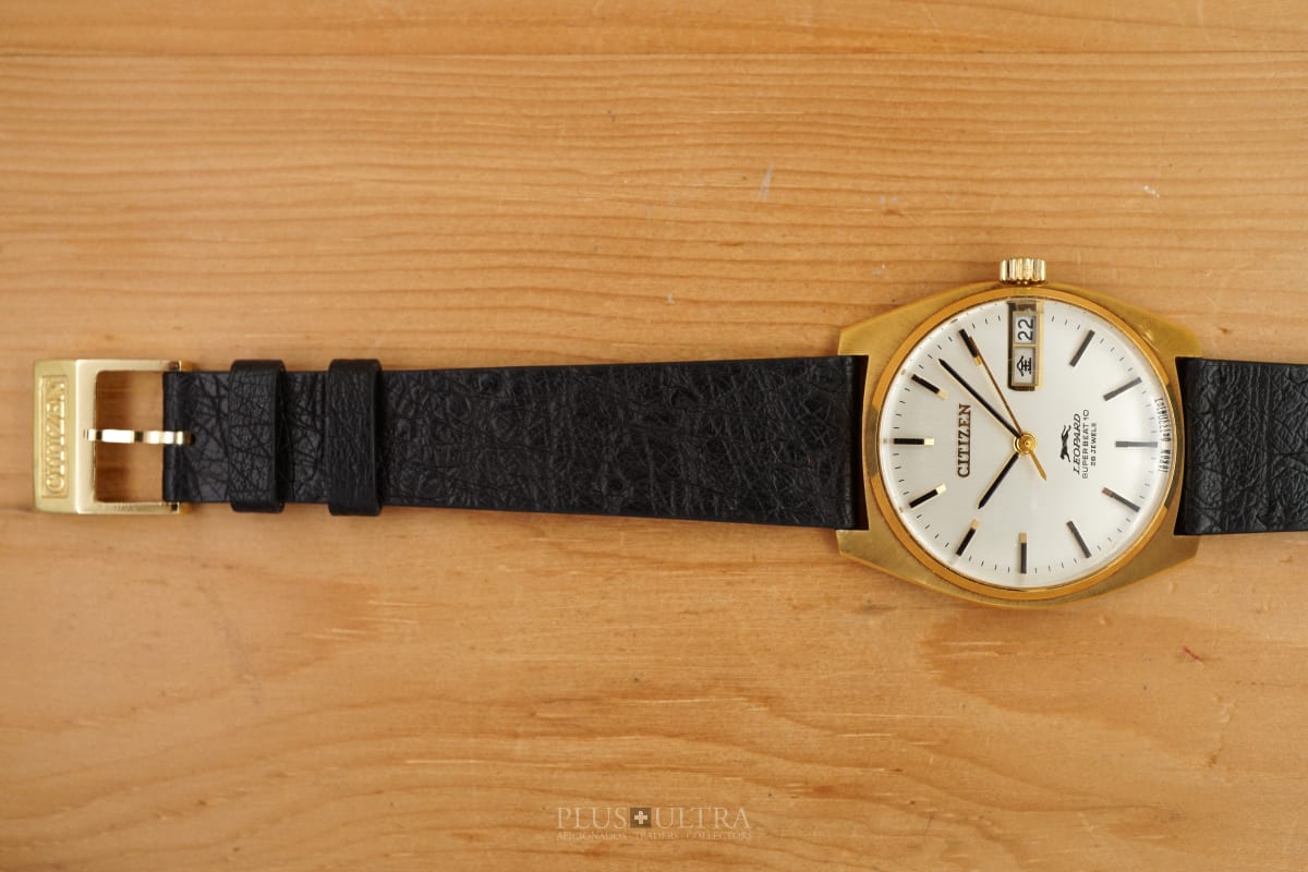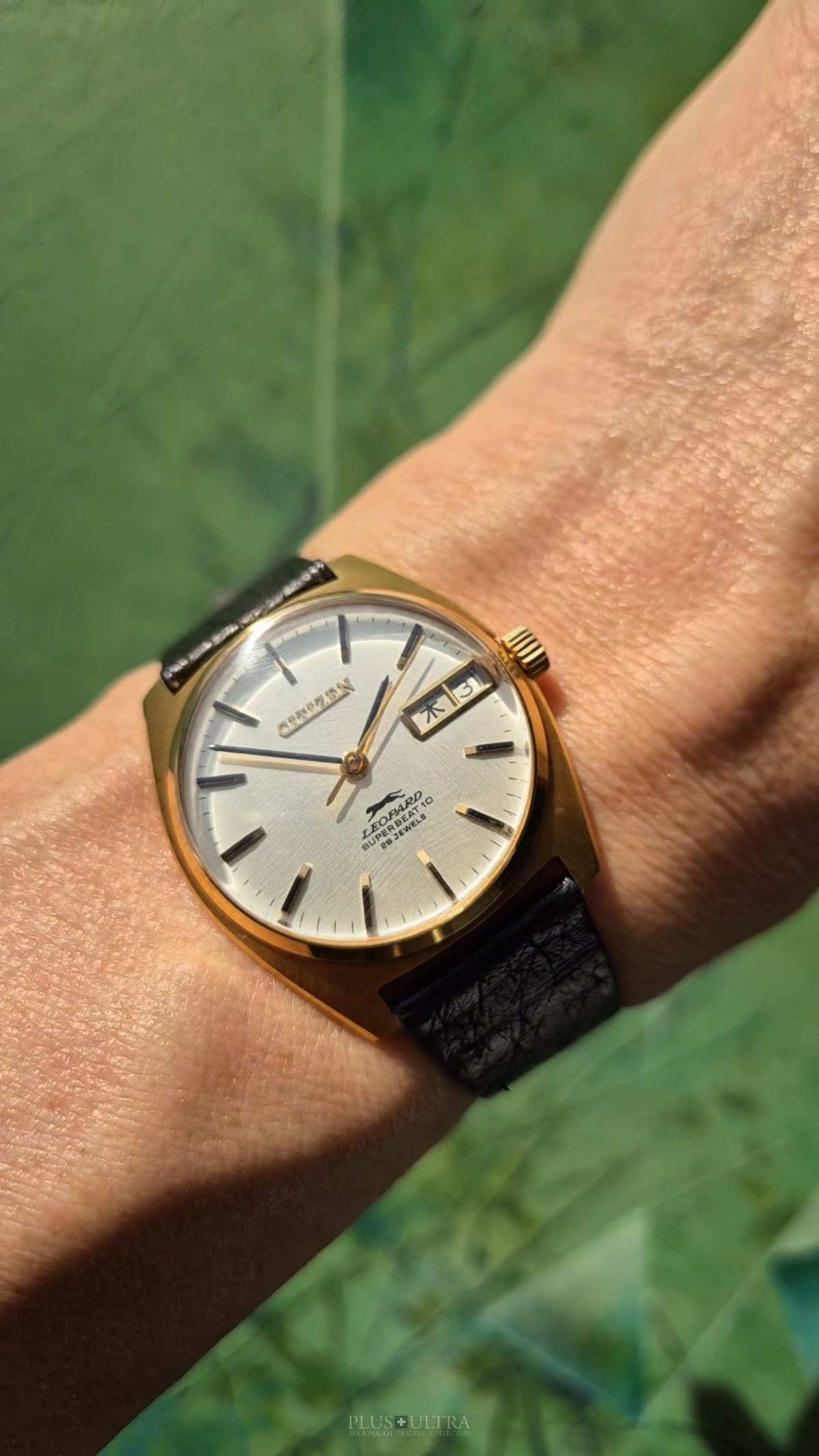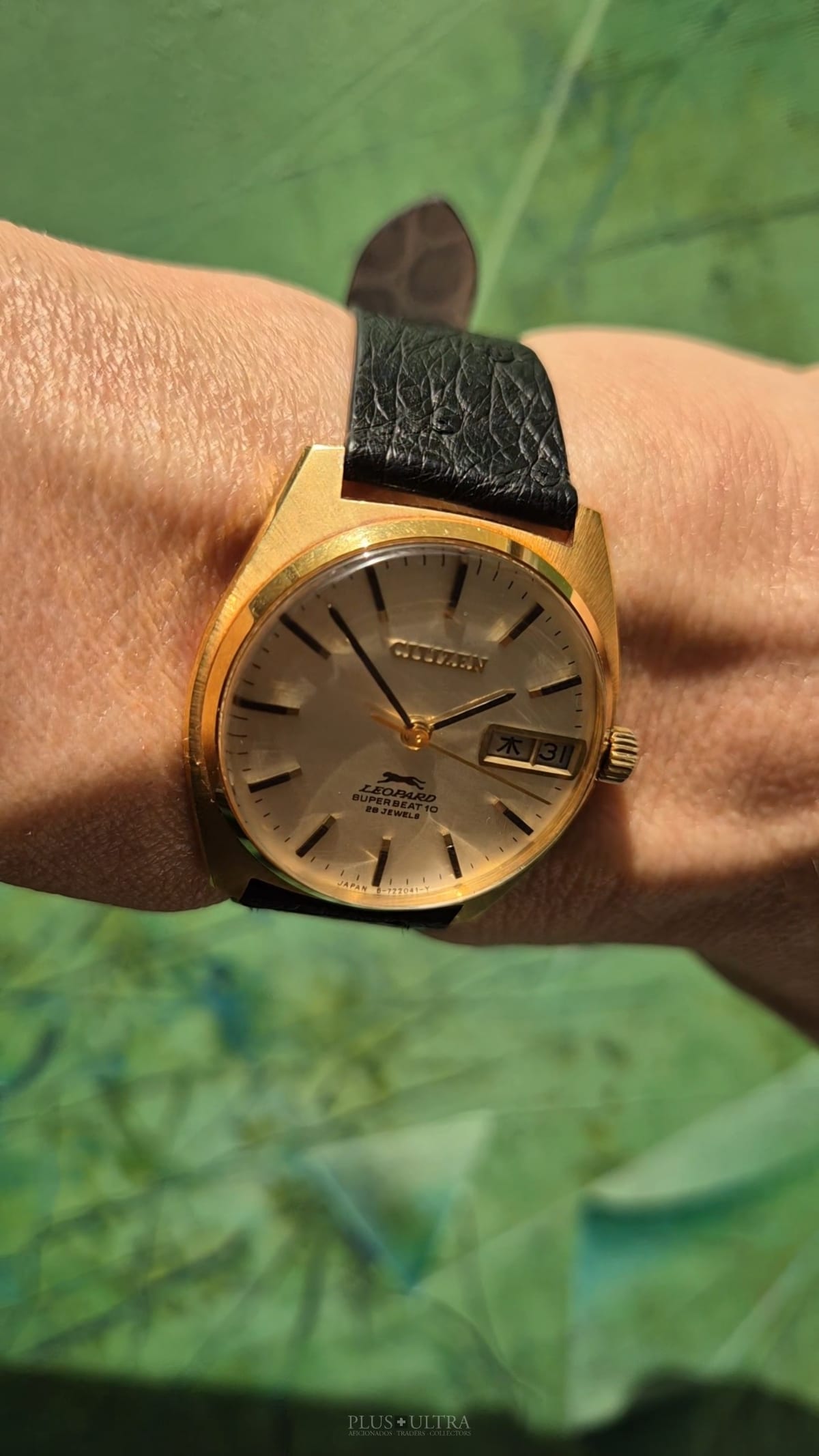 The Leopard SuperBeat 10 was approximately two times as expensive as the very fine adjusted Glorious Citizen (GC) and is one of the rarest vintage Citizen. Heavy solid-gold tonneau-shaped case (34mm without crown * 37.5mm lug-to-lug) with its original sunburst finish. The dial is of high quality, is original in every aspect as well; beautiful preserved and a joy to look at, with its blacked minutes- & hours-hand and indexes (faceted) and the applied CITIZEN-logo.