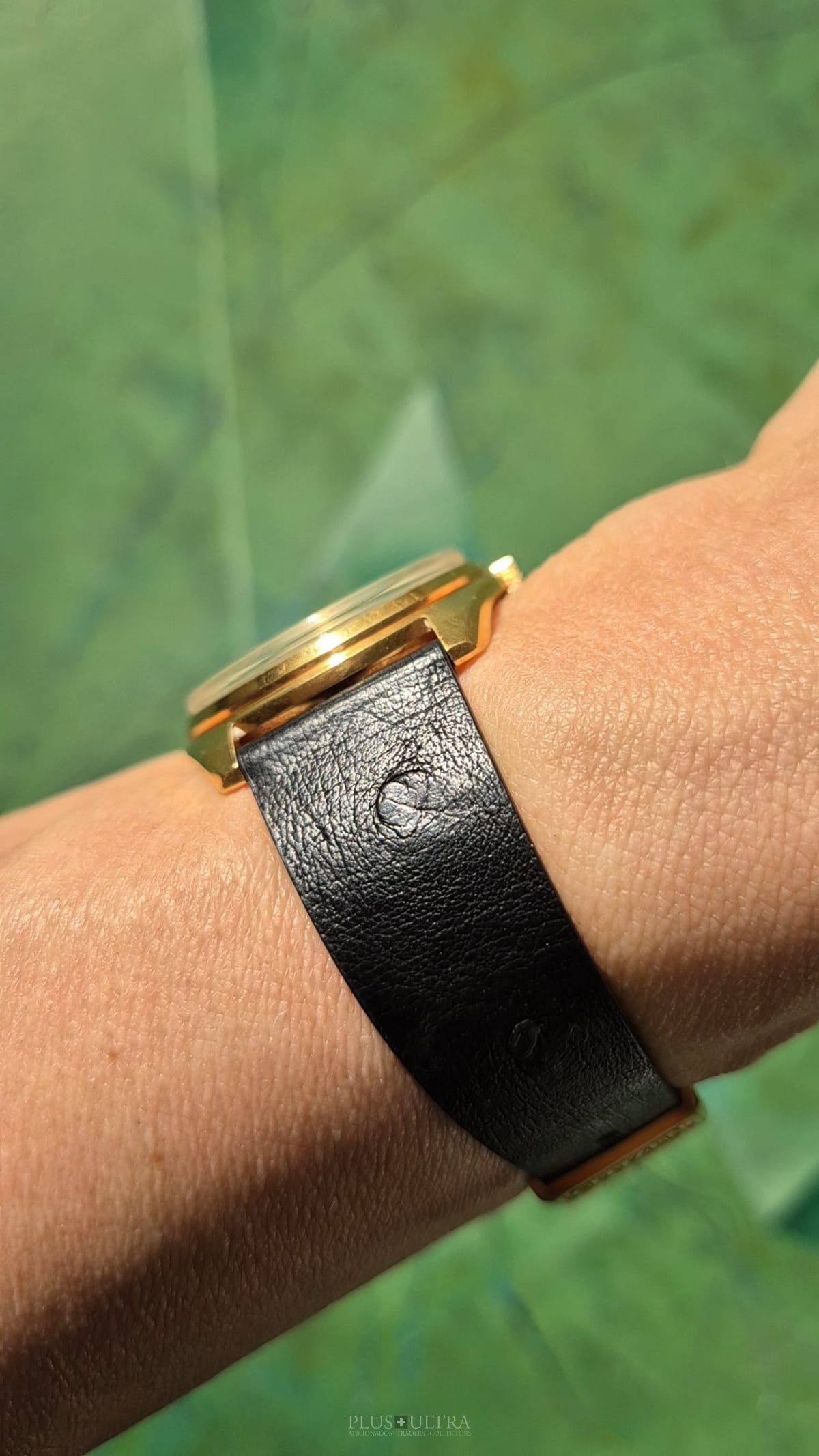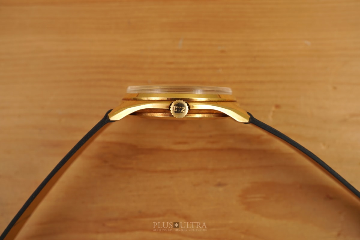 It was serviced and is in technically and optically very good condition. Delivered with a high-quality Ostrich-strap (black), that repeats the color of the hour-indexes & hands.