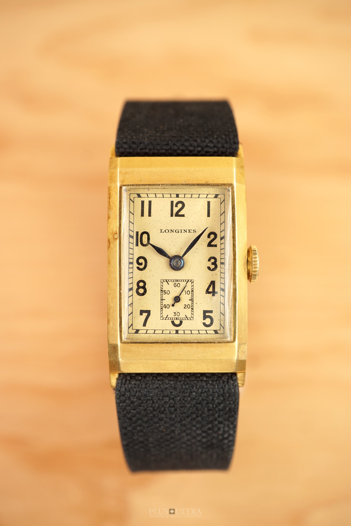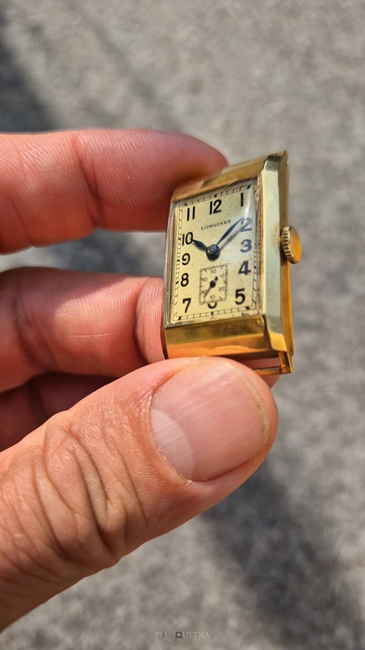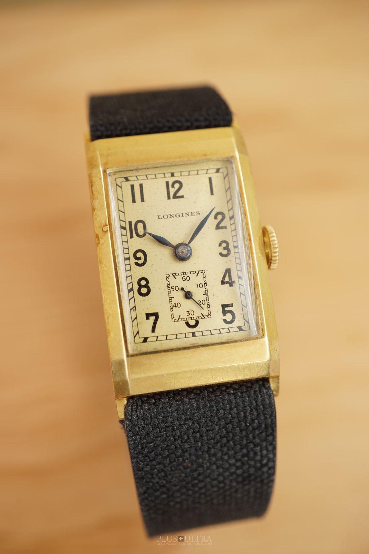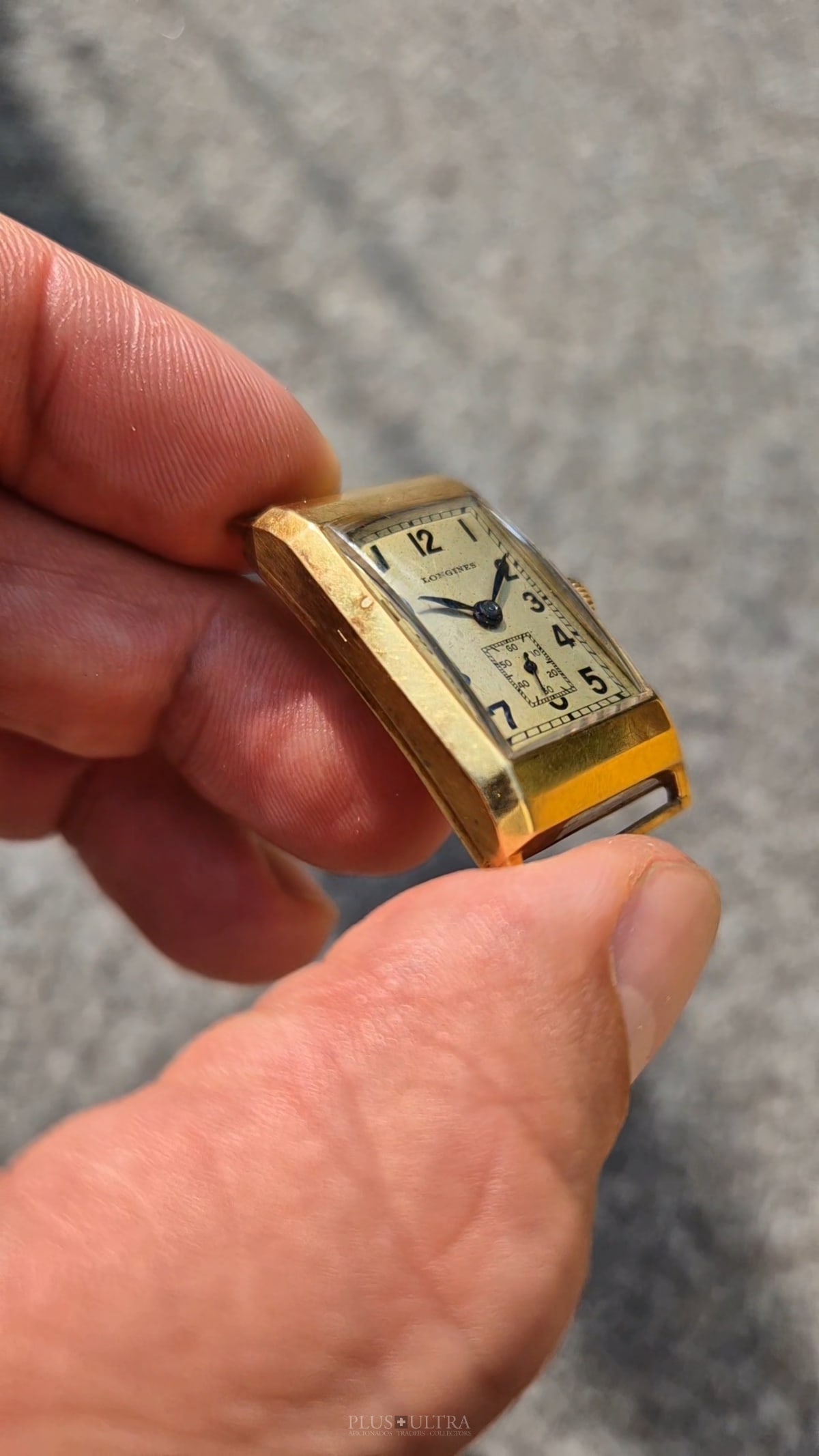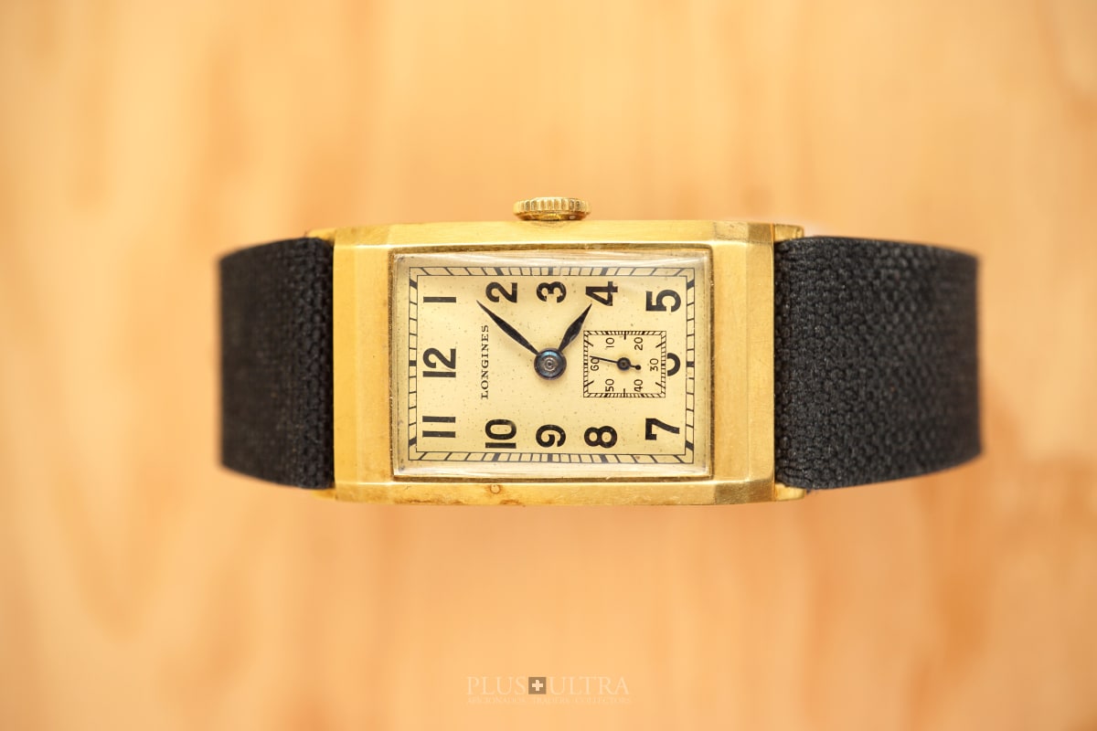 Rare 18K-yellowgold execution of the elongated case (20*36mm) with form-movement Longines cal25.17 (small second) in very good condition, with some oxidation on the dial but besides this very few signs of use and age: the case even shows the hallmark on the 9o'clock-flank and the Key[2] inside case-back indicates the beautiful case was made by Baumgartner for Longines. The domed crystal is original as is every other part of this almost 90y old timepiece.