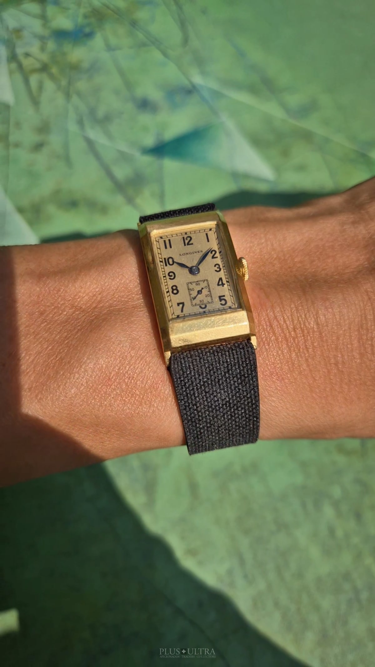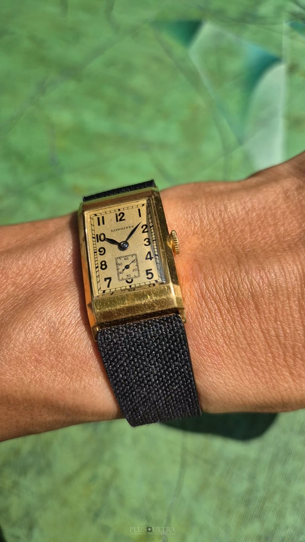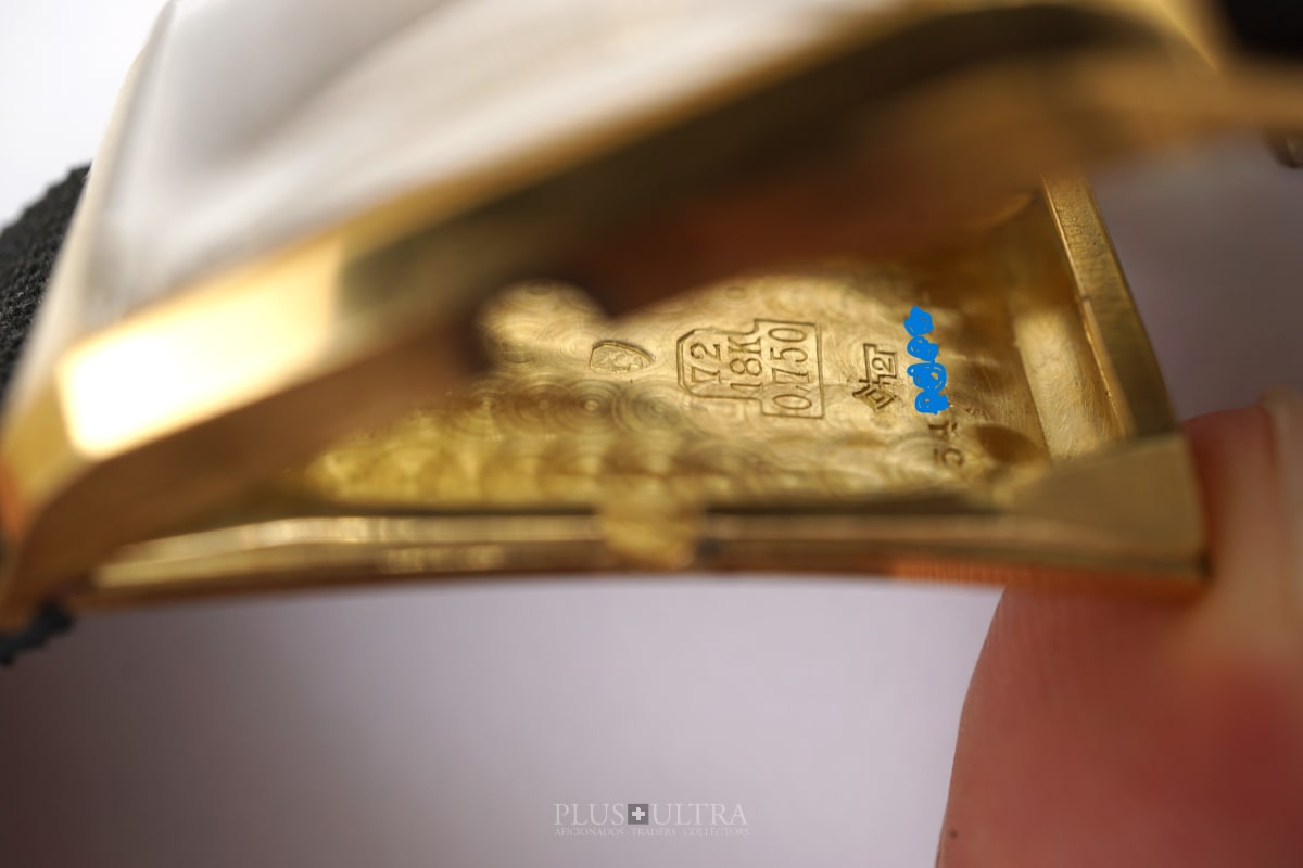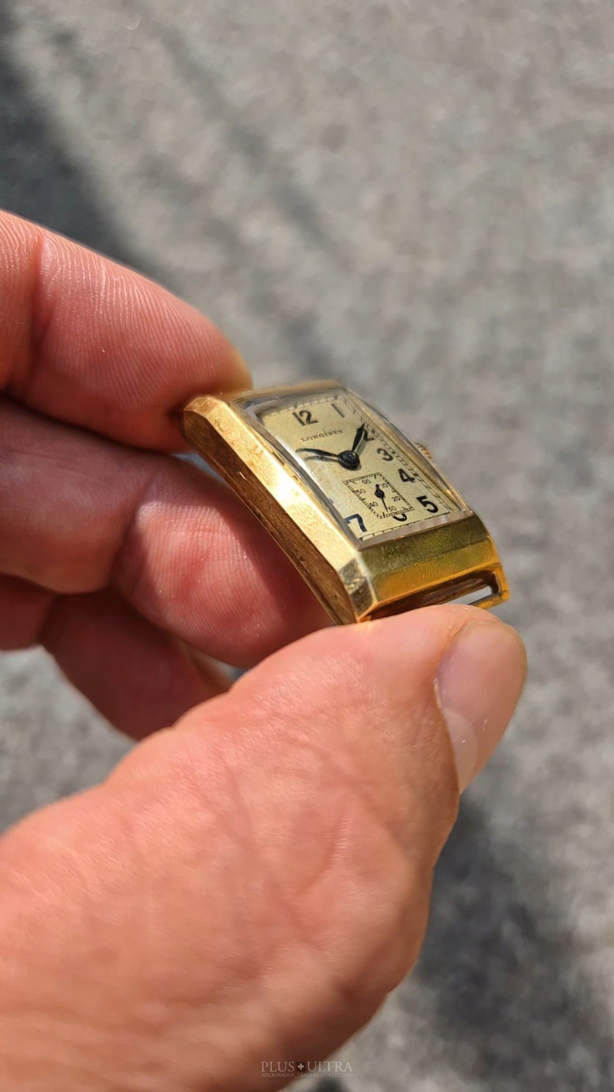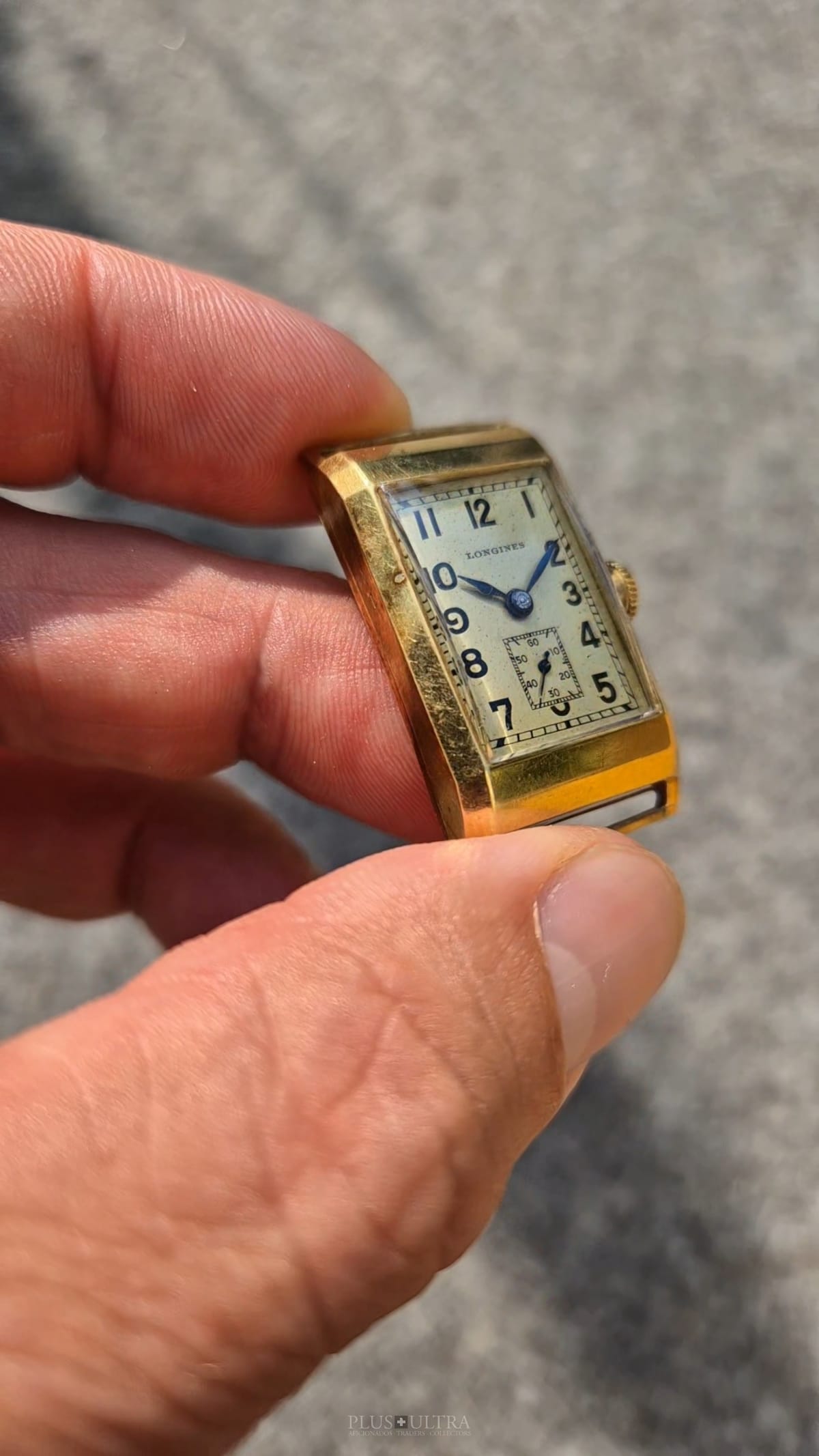 Rare 18K-yellowgold execution of the elongated case (20*36mm) with form-movement Longines cal25.17 (small second) in very good condition, with some oxidation on the dial but besides this very few signs of use and age: the case even shows the hallmark on the 9o'clock-flank and the Key[2] inside case-back indicates the beautiful case was made by Baumgartner for Longines. The domed crystal is original as is every other part of this almost 90y old timepiece.