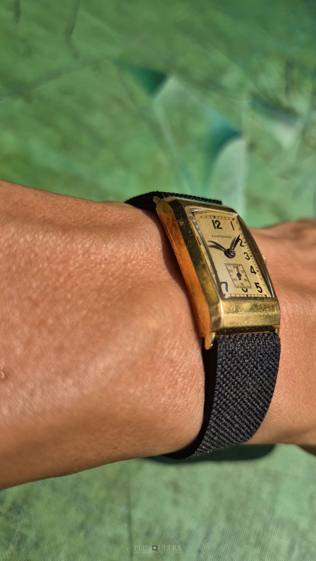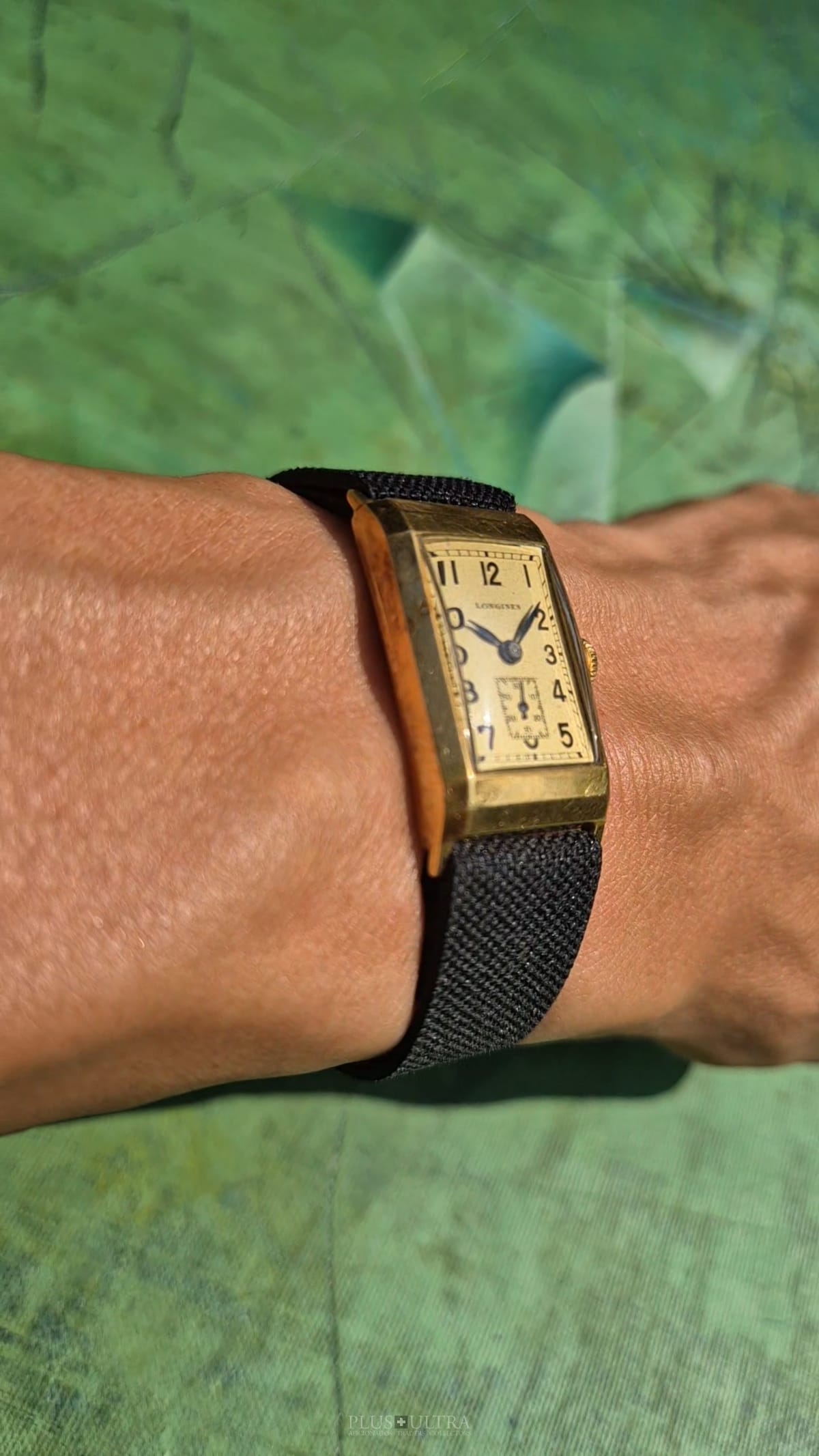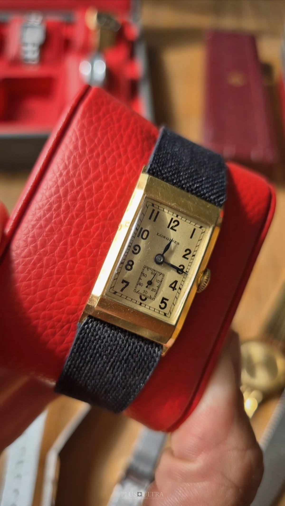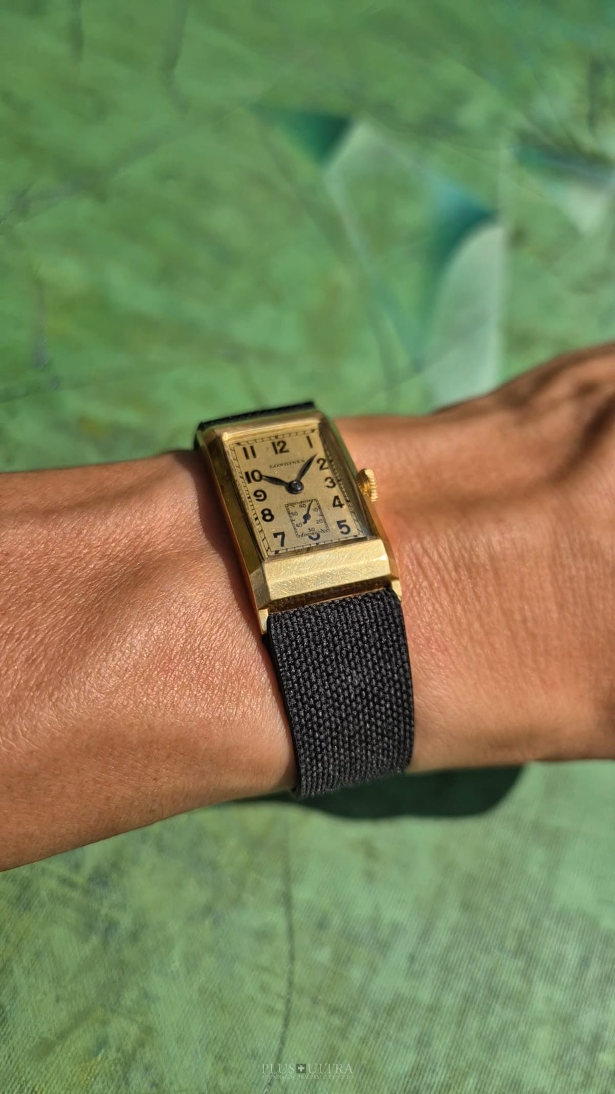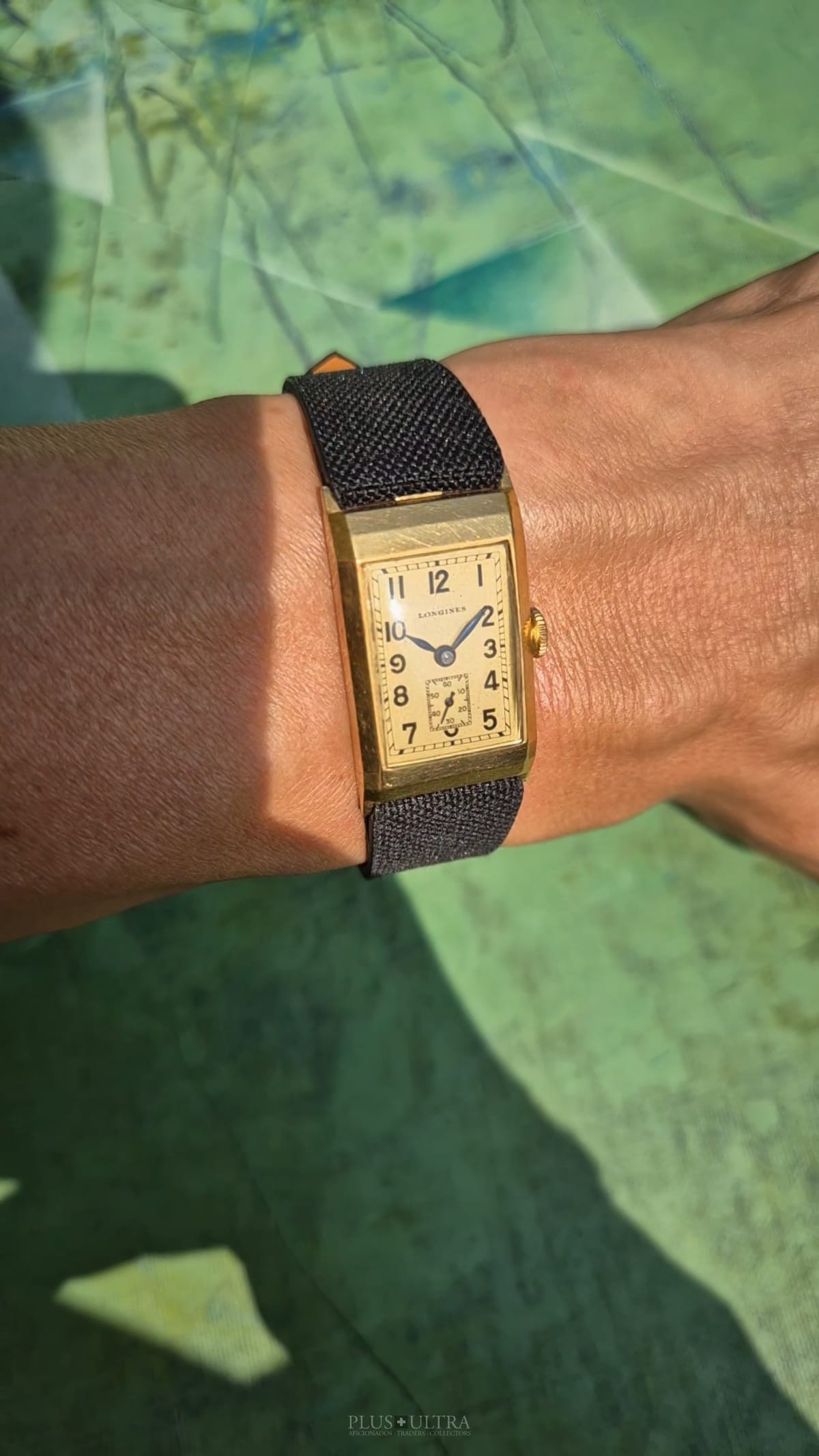 Rare 18K-yellowgold execution of the elongated case (20*36mm) with form-movement Longines cal25.17 (small second) in very good condition, with some oxidation on the dial but besides this very few signs of use and age: the case even shows the hallmark on the 9o'clock-flank and the Key[2] inside case-back indicates the beautiful case was made by Baumgartner for Longines. The domed crystal is original as is every other part of this almost 90y old timepiece.