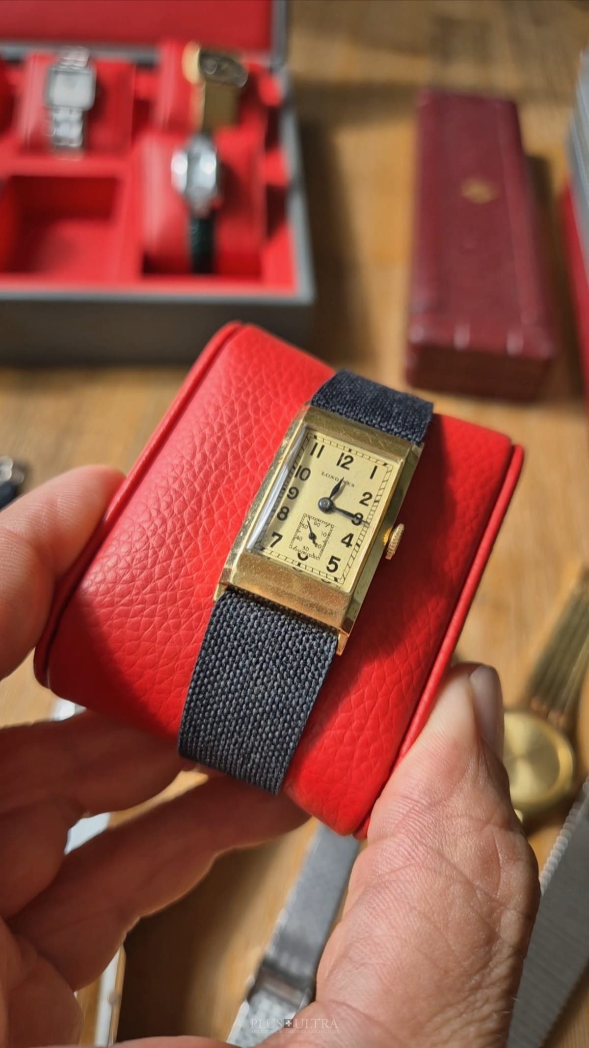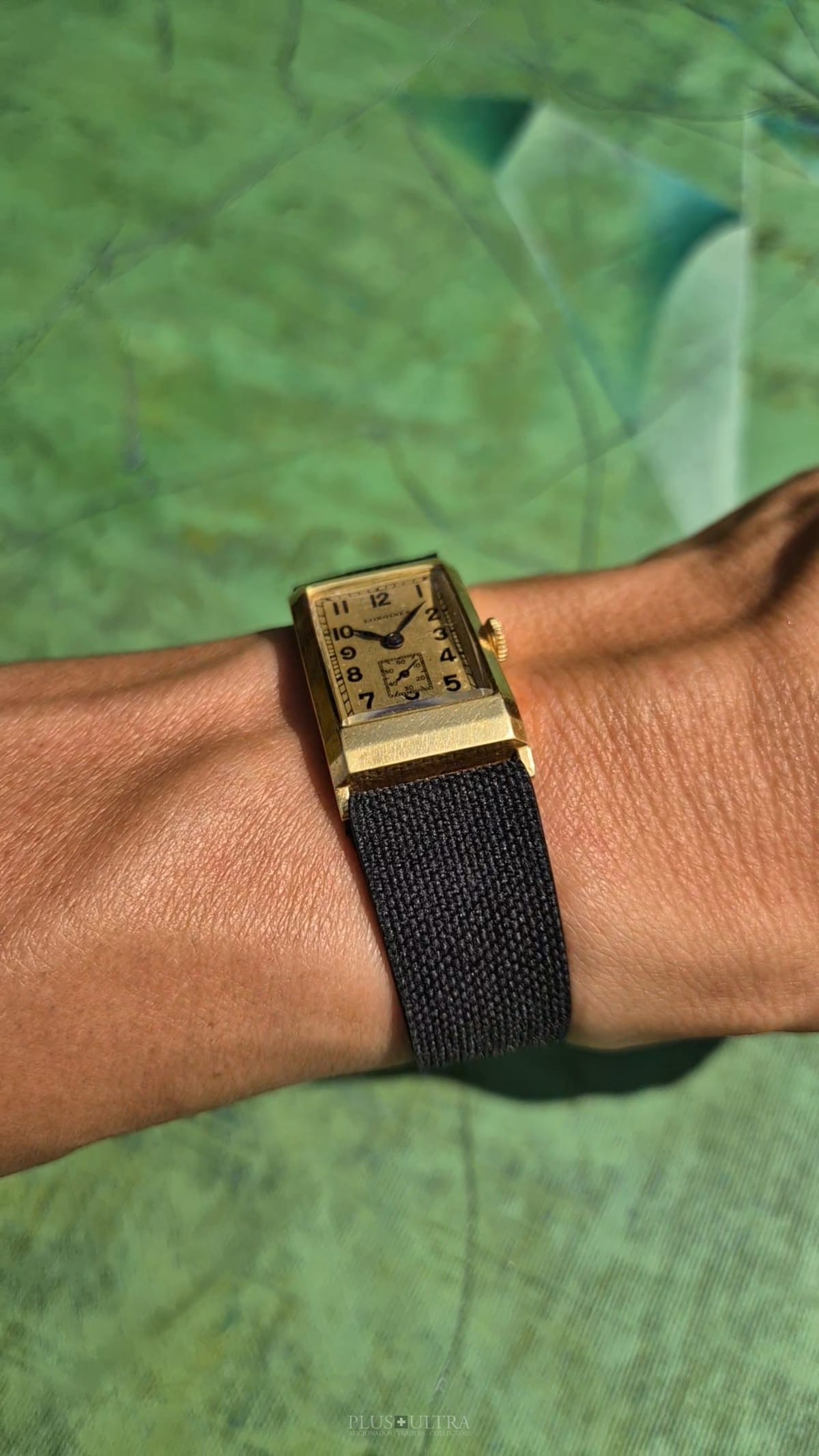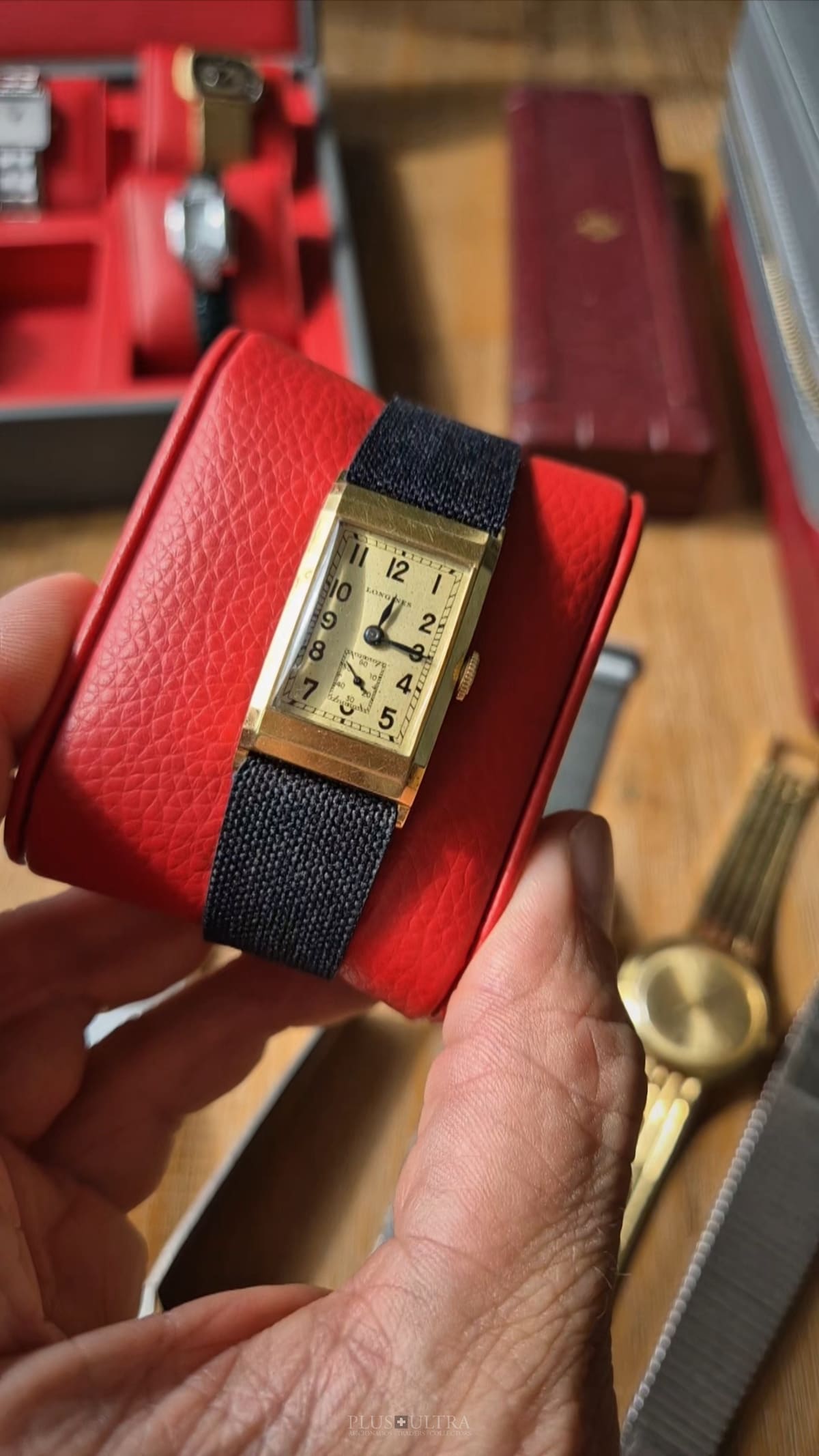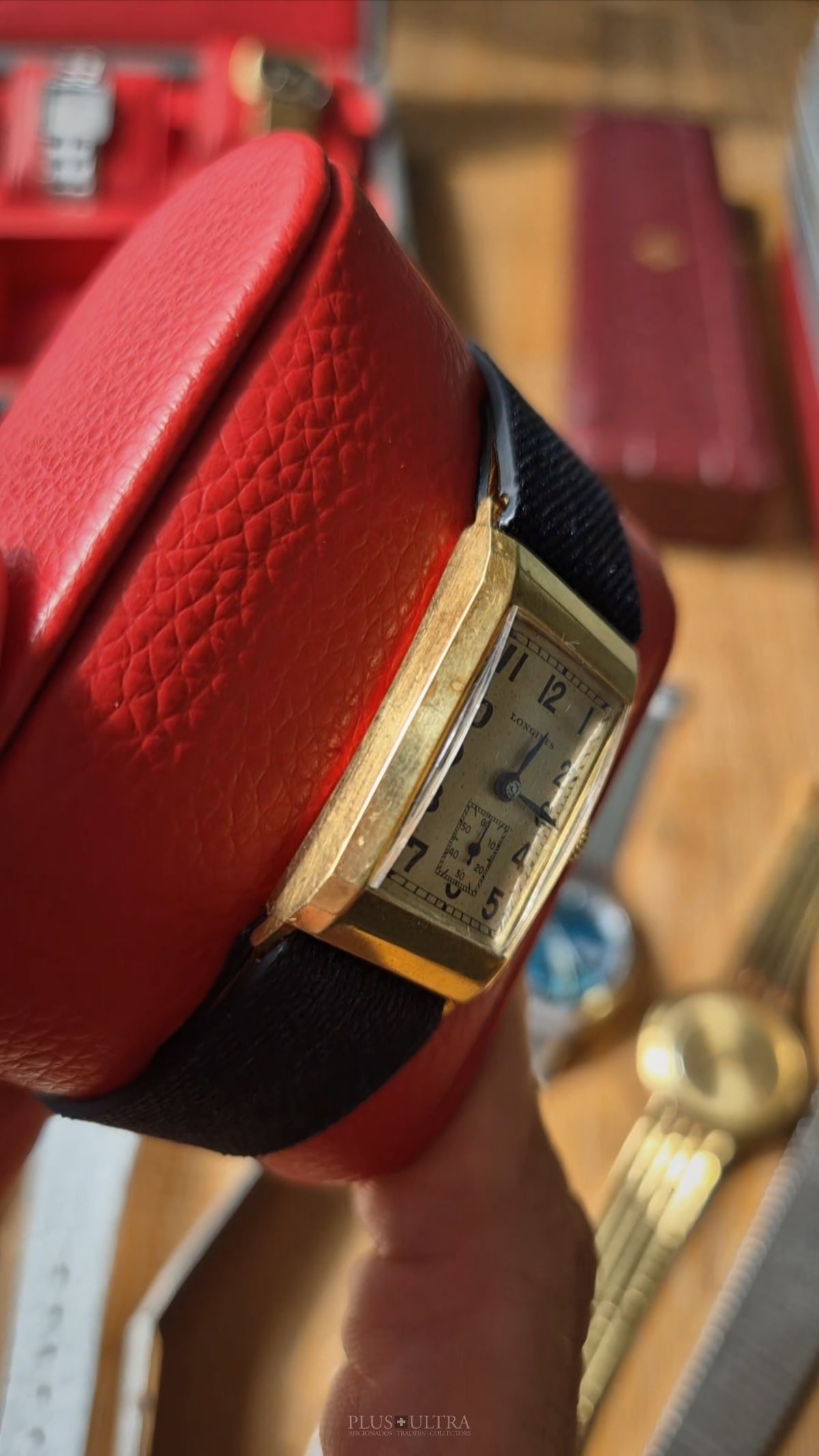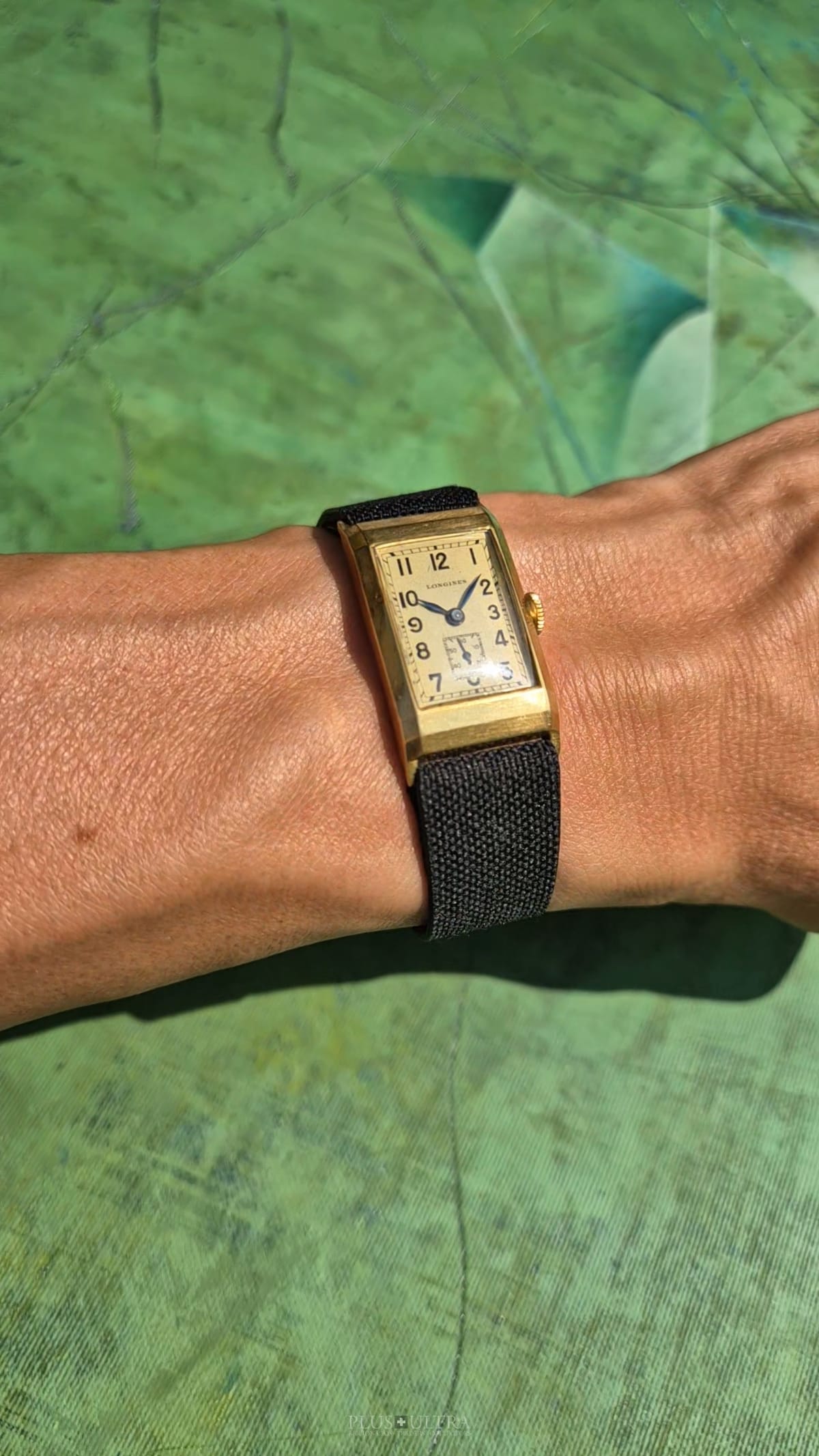 Rare 18K-yellowgold execution of the elongated case (20*36mm) with form-movement Longines cal25.17 (small second) in very good condition, with some oxidation on the dial but besides this very few signs of use and age: the case even shows the hallmark on the 9o'clock-flank and the Key[2] inside case-back indicates the beautiful case was made by Baumgartner for Longines. The domed crystal is original as is every other part of this almost 90y old timepiece.