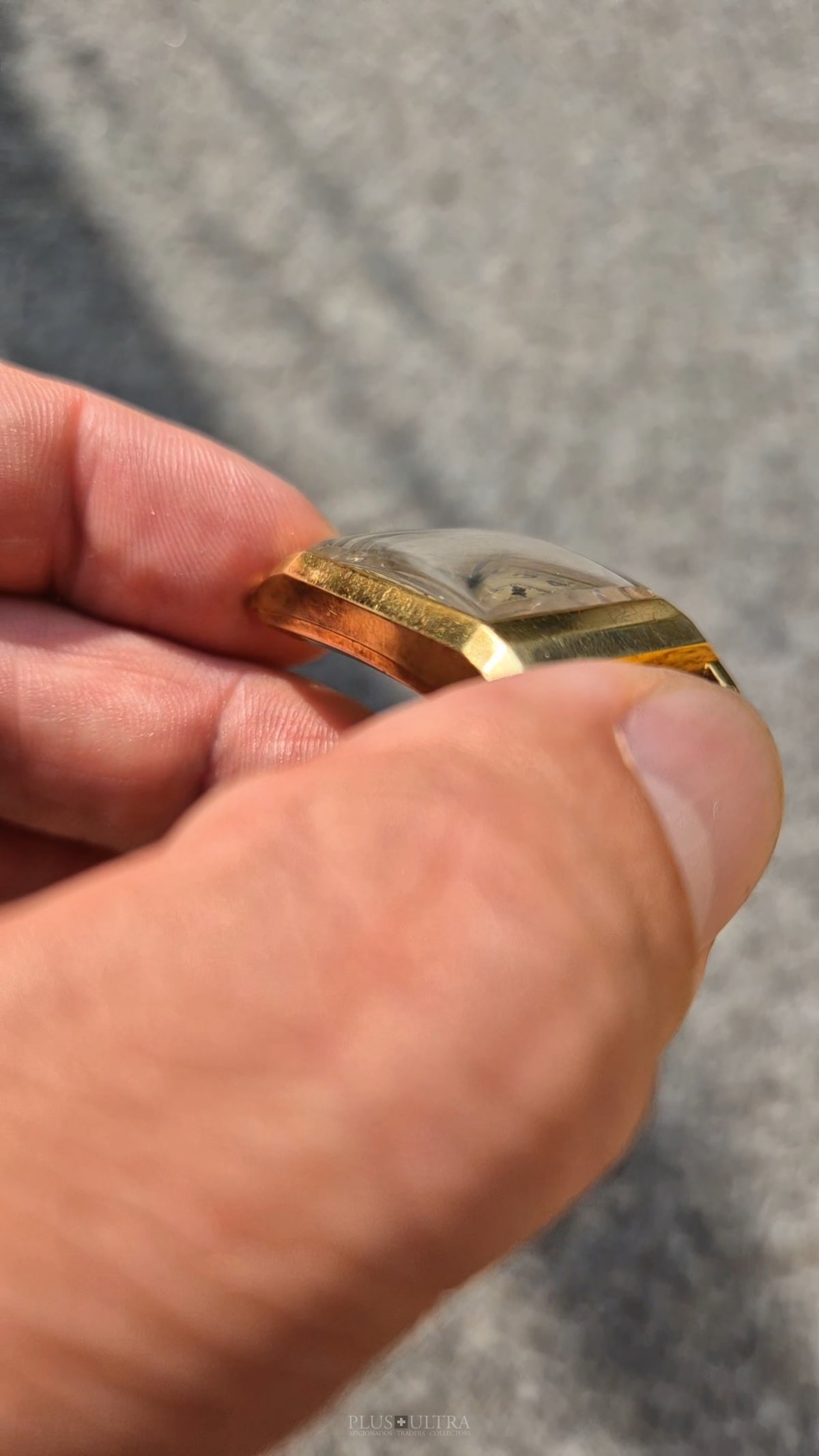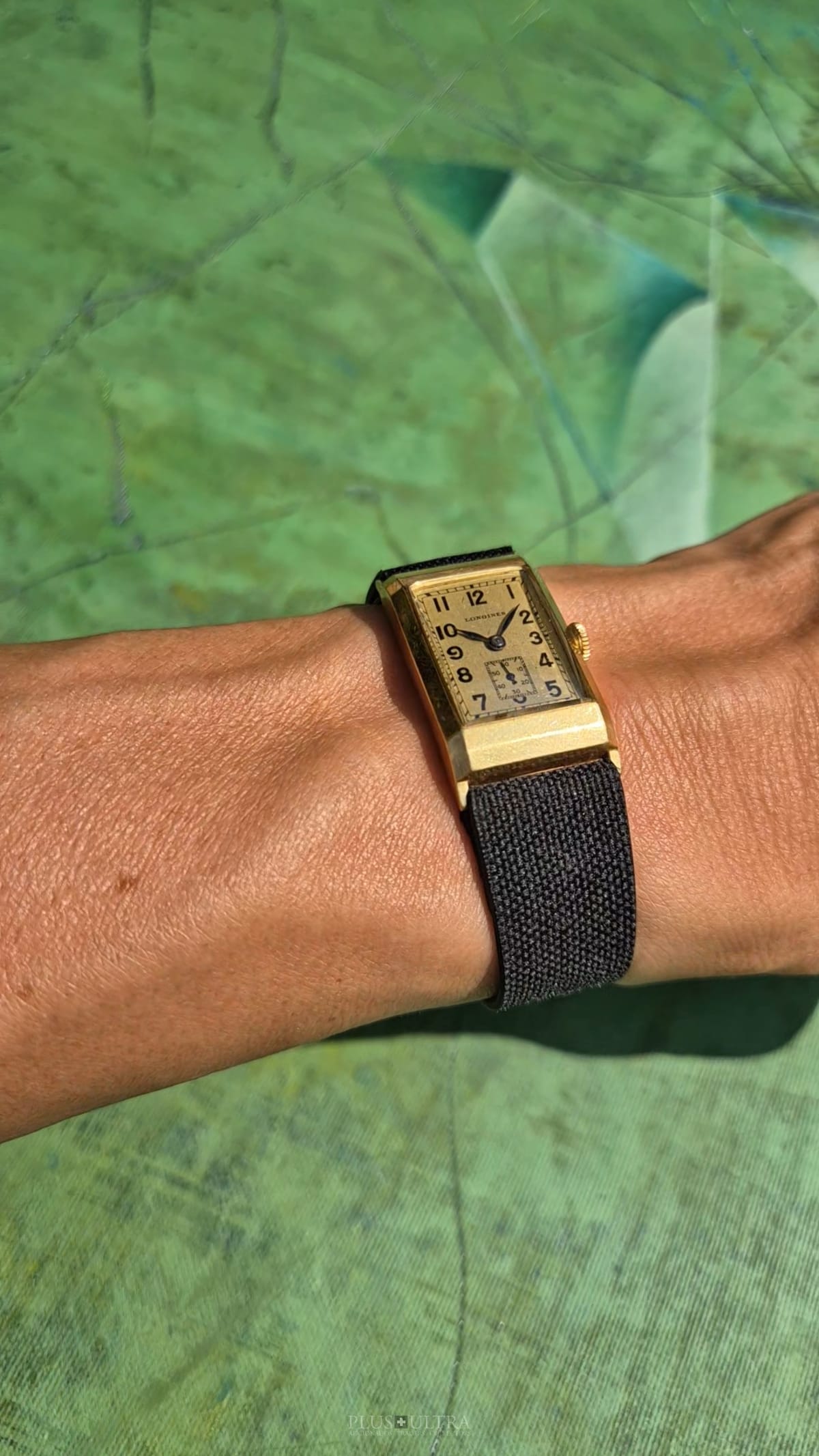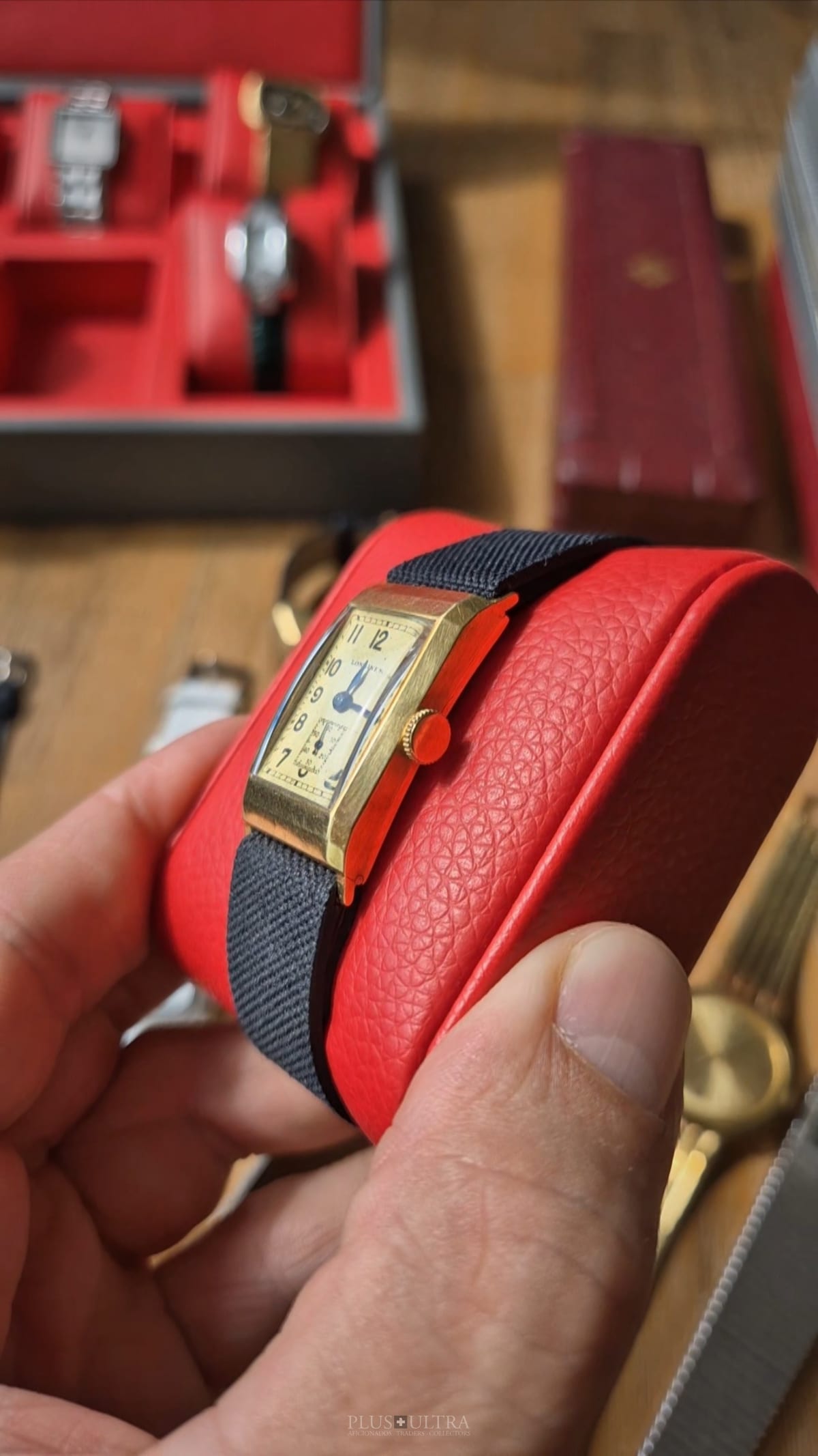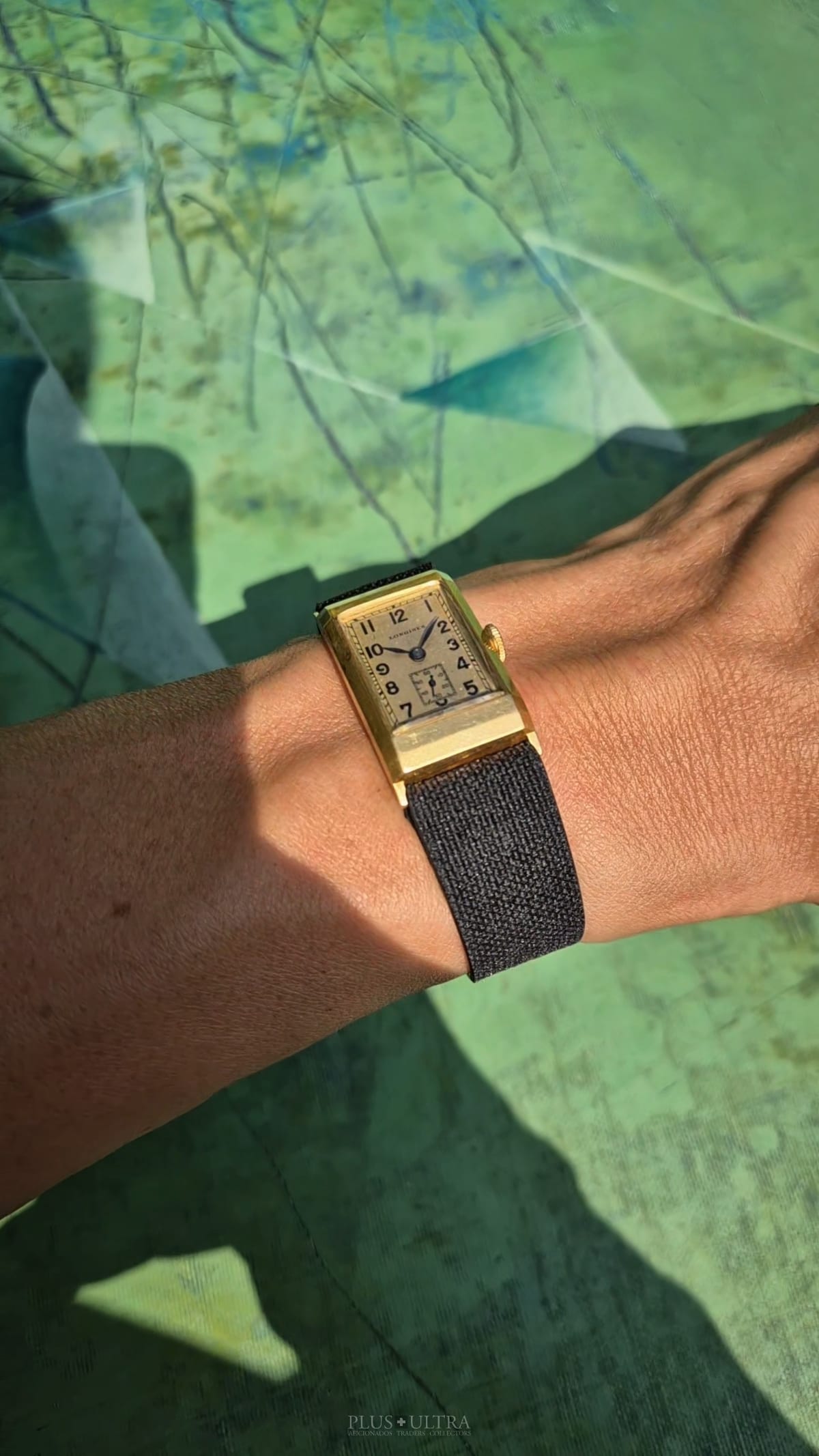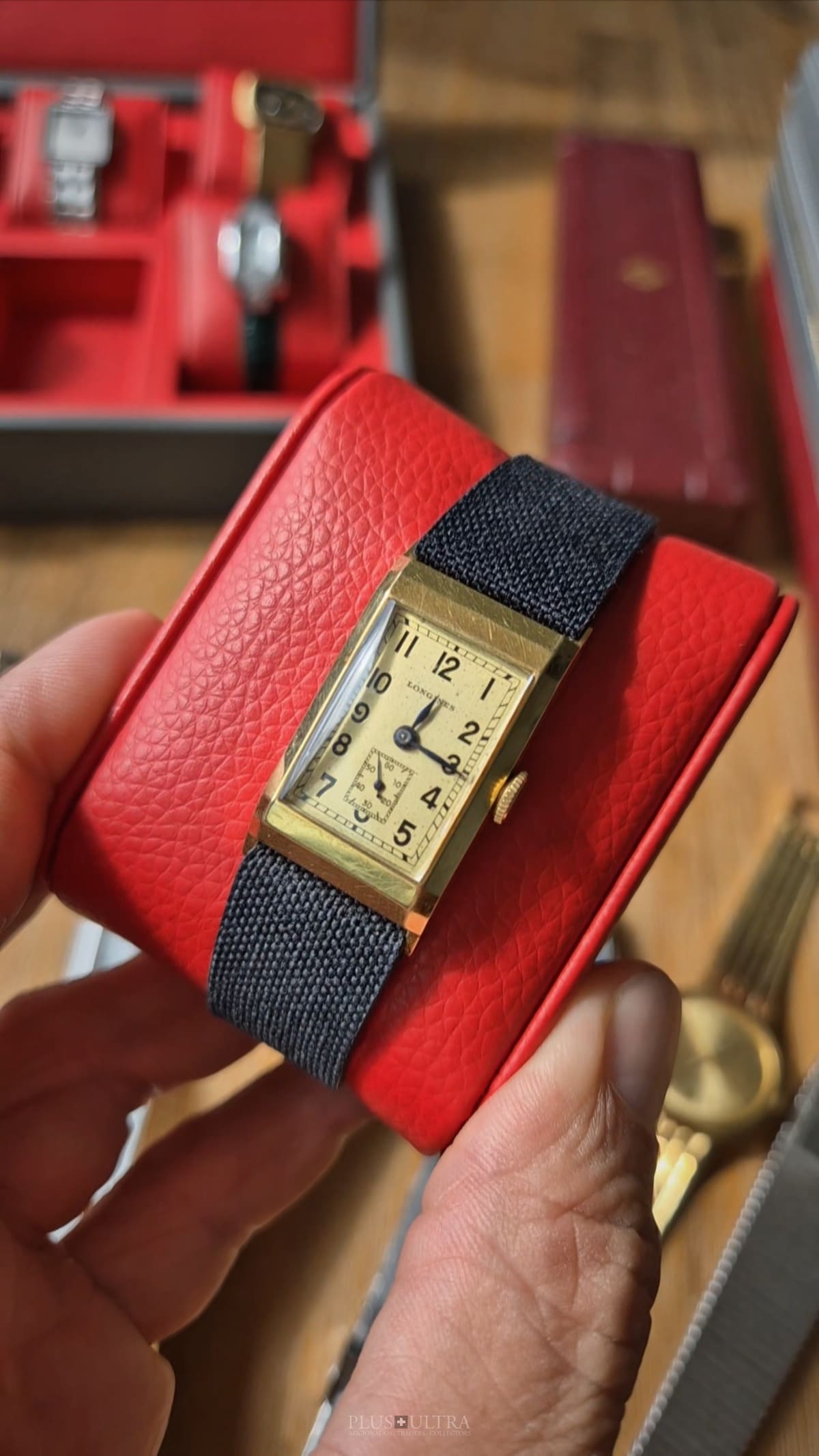 Rare 18K-yellowgold execution of the elongated case (20*36mm) with form-movement Longines cal25.17 (small second) in very good condition, with some oxidation on the dial but besides this very few signs of use and age: the case even shows the hallmark on the 9o'clock-flank and the Key[2] inside case-back indicates the beautiful case was made by Baumgartner for Longines. The domed crystal is original as is every other part of this almost 90y old timepiece.