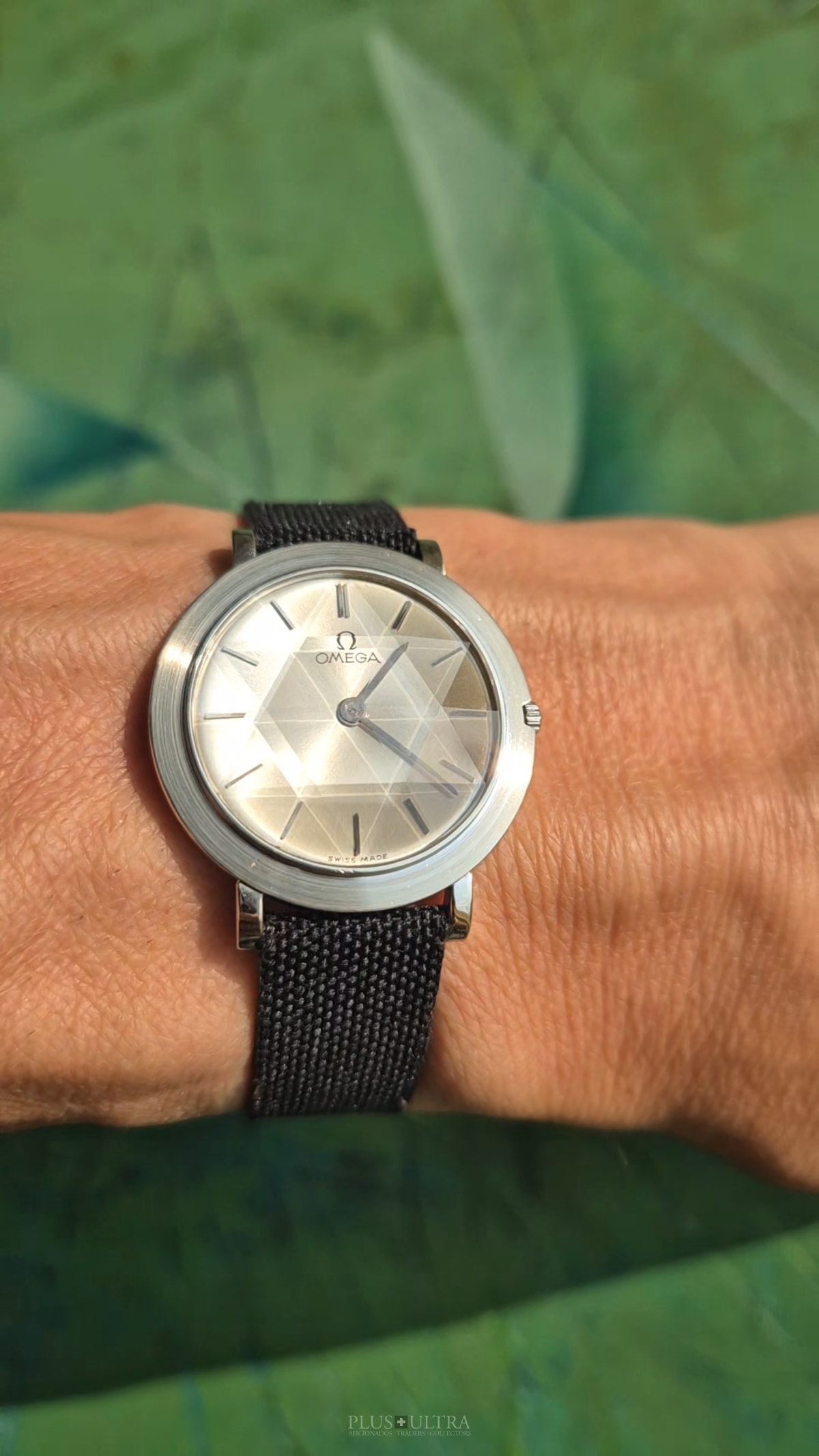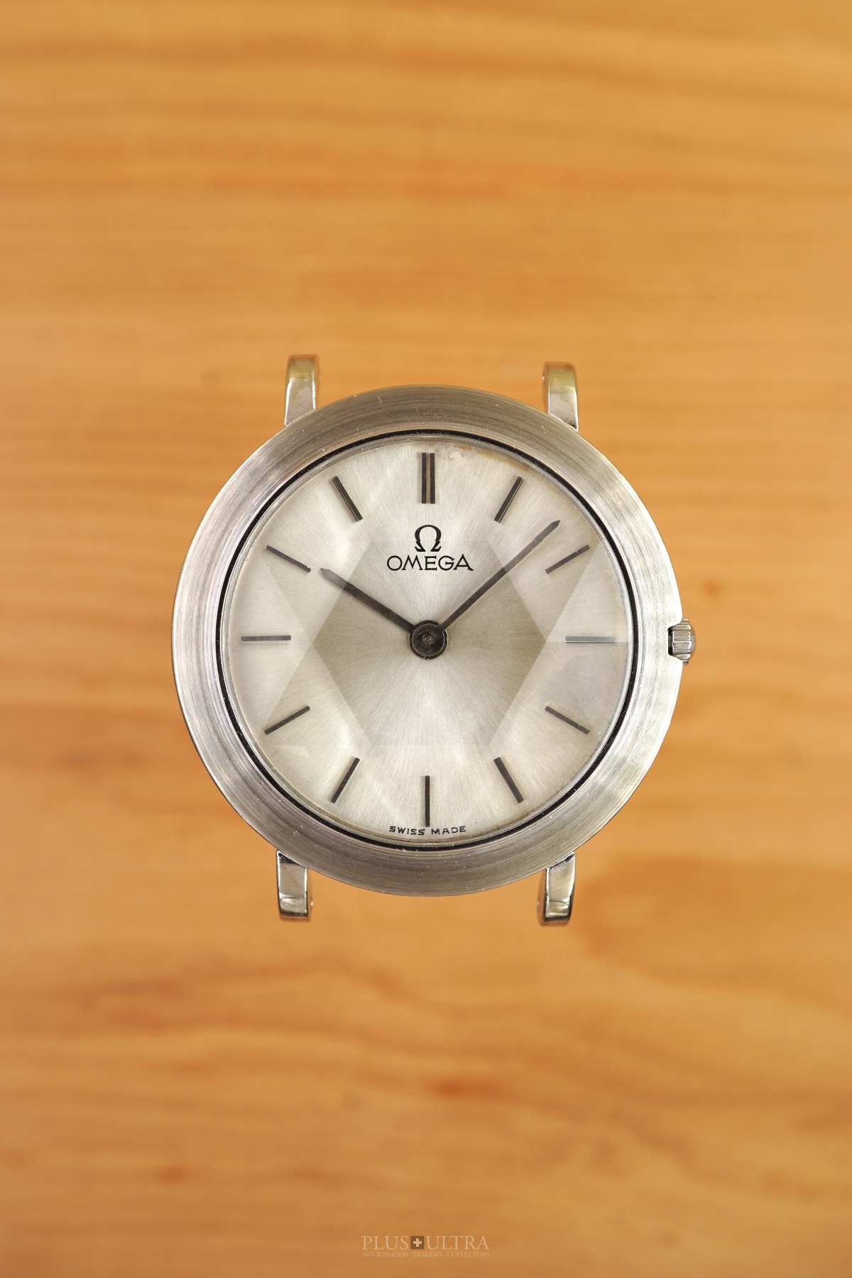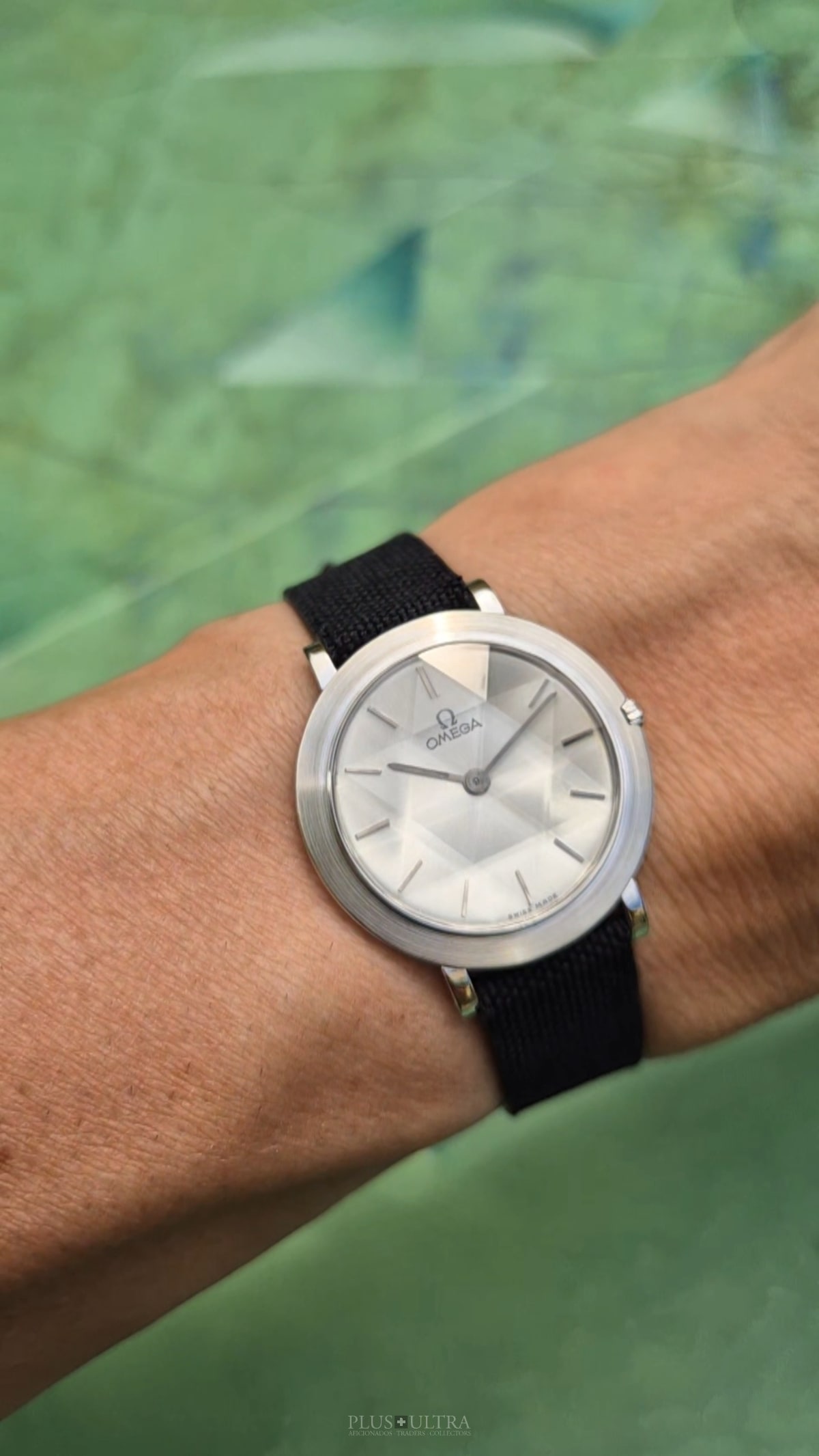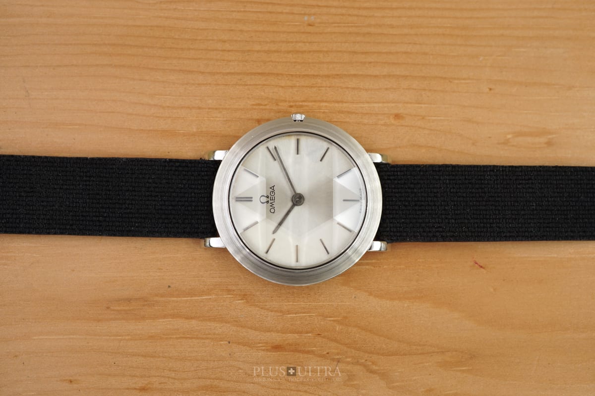 WHY WE LOVE IT? Because it is not only a beautiful and dressy Omega but also a very important: Omegas first sapphire-crystal in an amazing faceted appearance. And in the whitegold variant a super rare timepiece.