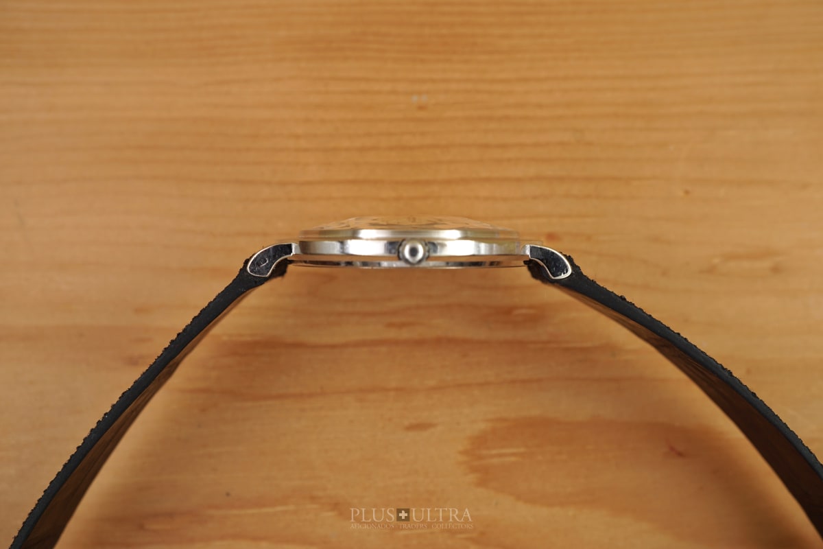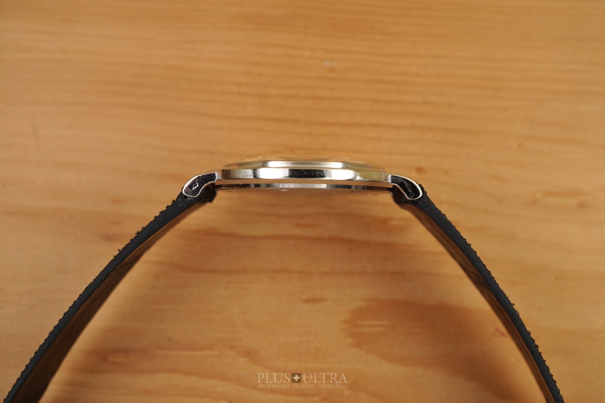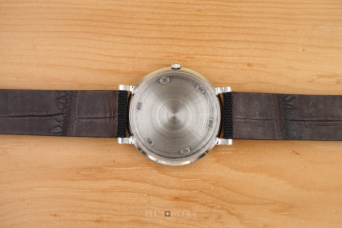 Below the crystal runs another horological milestone: the cal540 by Omega, which is basically the Piaget cal9P with slightly modified bridge-design. Developed in 1957 by Piaget and a sensational 2mm in thickness. A grand success in the most important horological complication: miniaturization.
