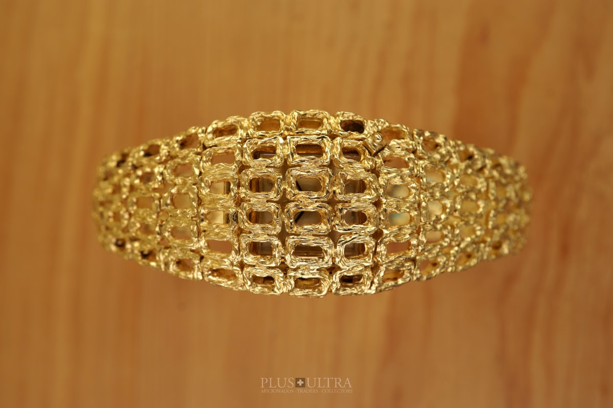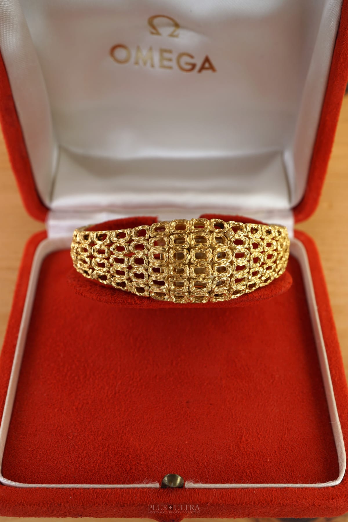 This design icon was made by Omega in all 18K-yellowgold in 1964 according to our books and research and the watch is still in excellent condition: movement serviced and running reliable and precise and the clasp and the lid closing both safely and strong. The current length of 16.5cm could be extended if necessary.