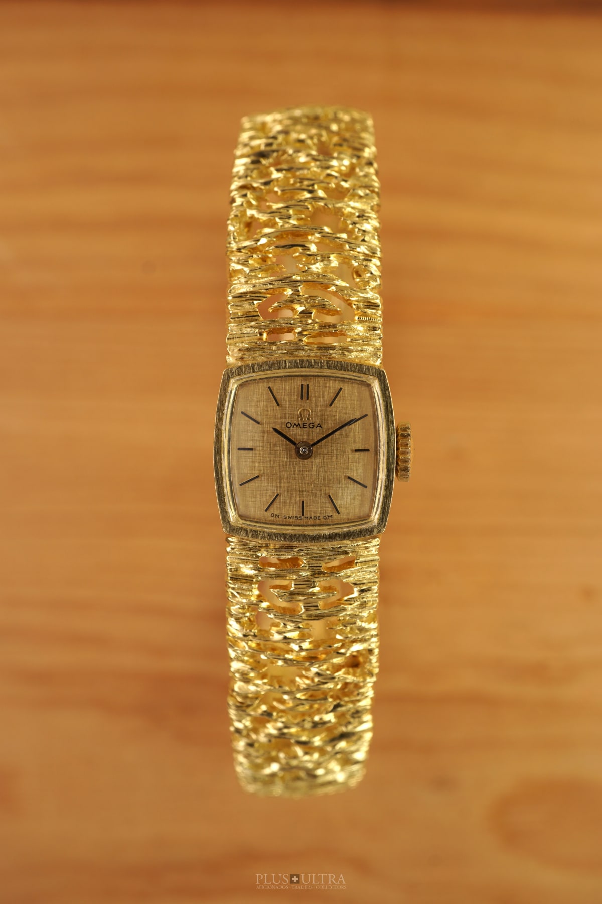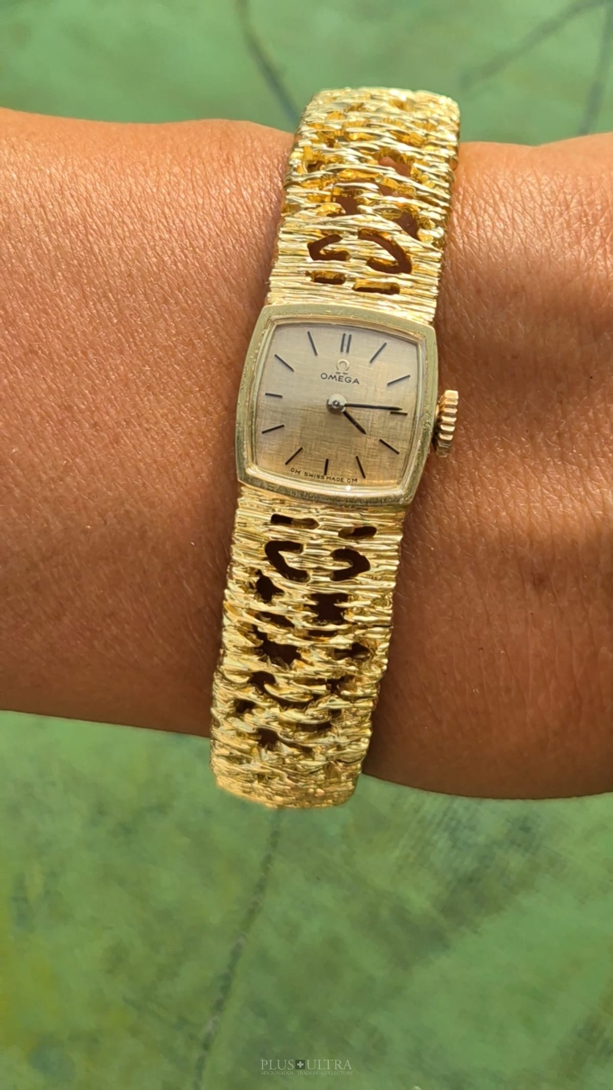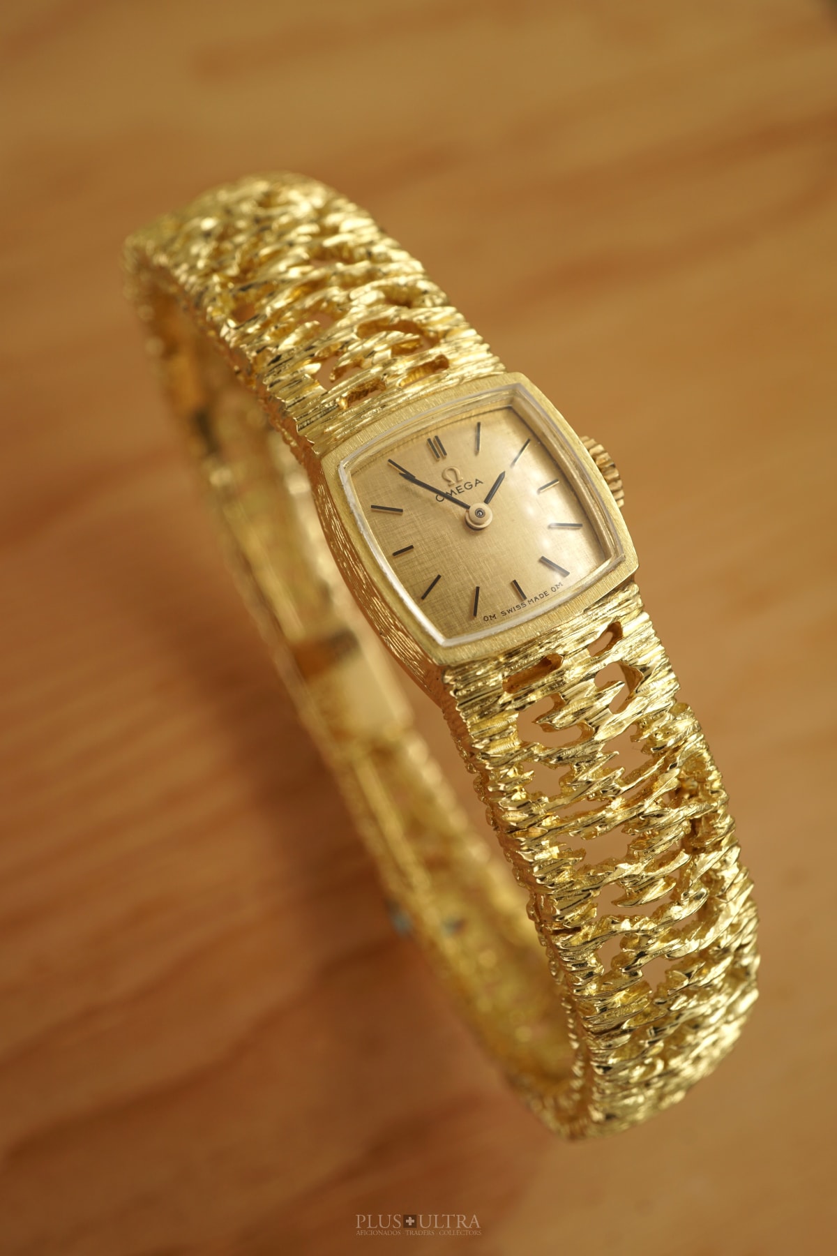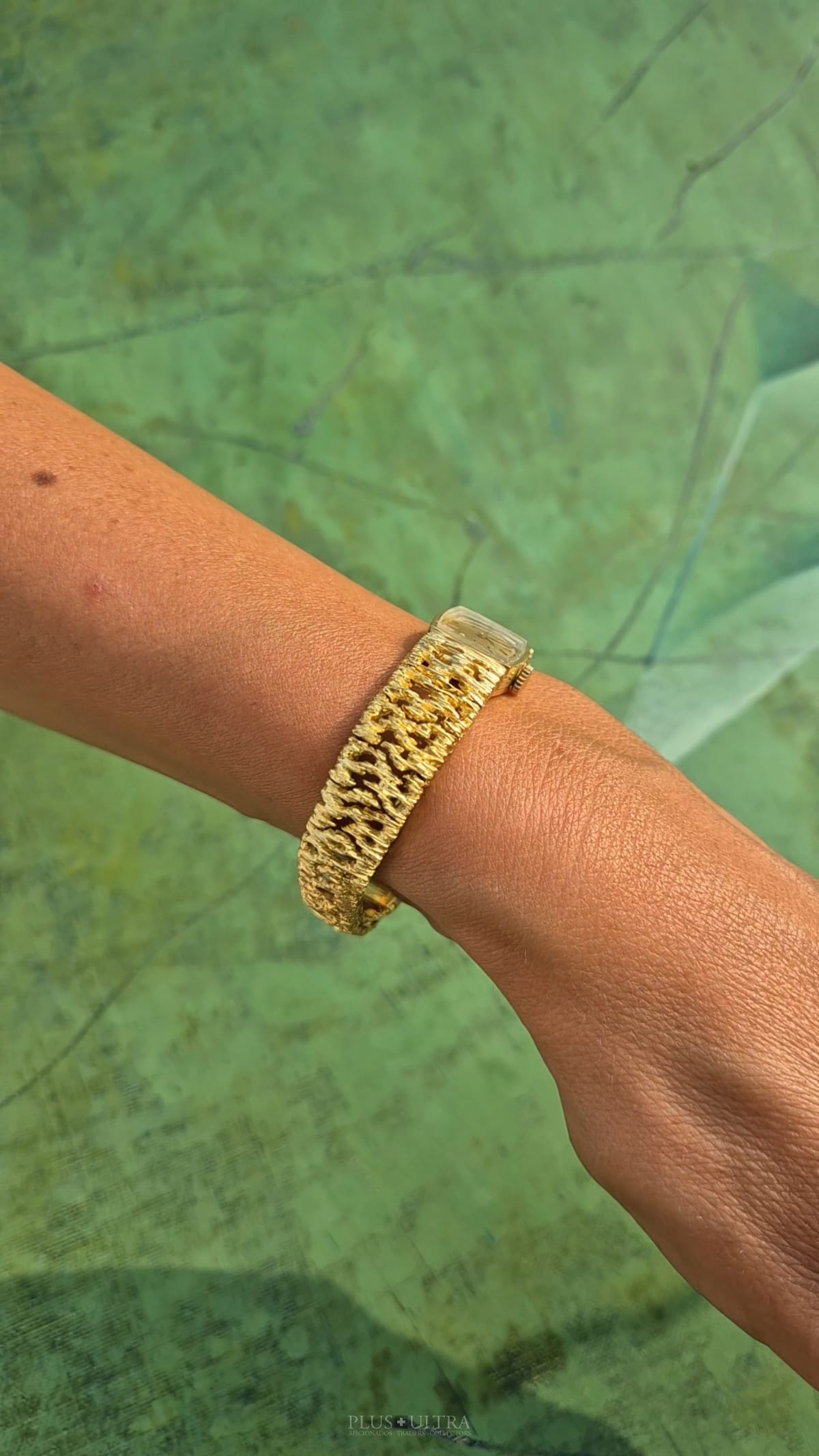 A 1966 Gilbert Albert-designed Braceletwatch: Omega Frisson d'Or in 18K yellow gold. Unmistakable. The cragged surface of this iconic masterpiece reflects the light like flashy diamonds -- the reflective power of gold.