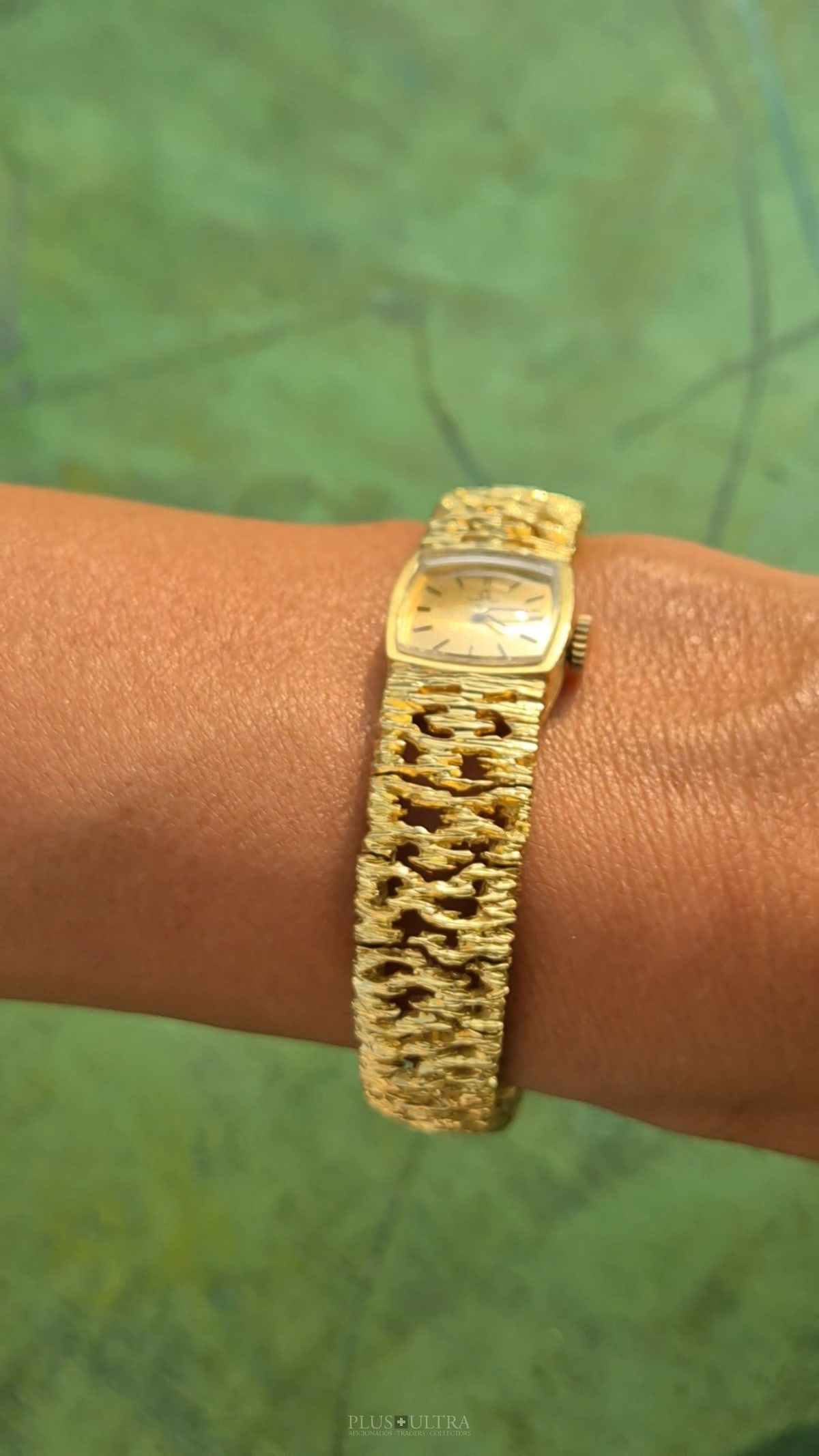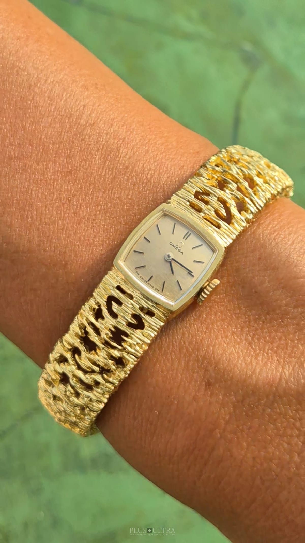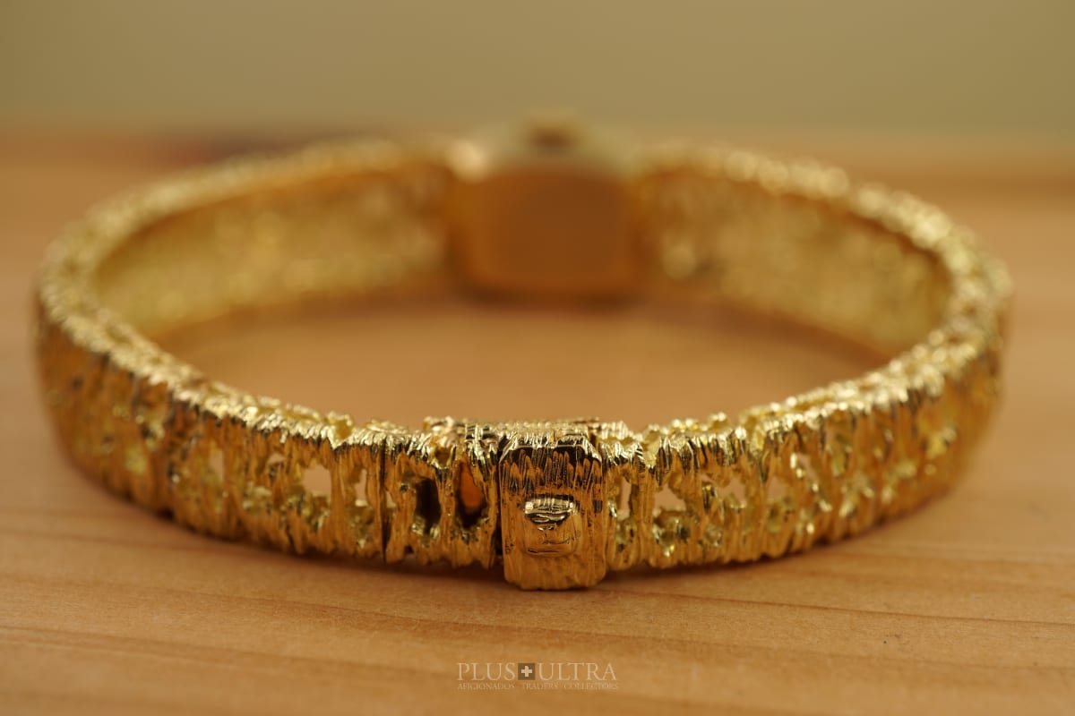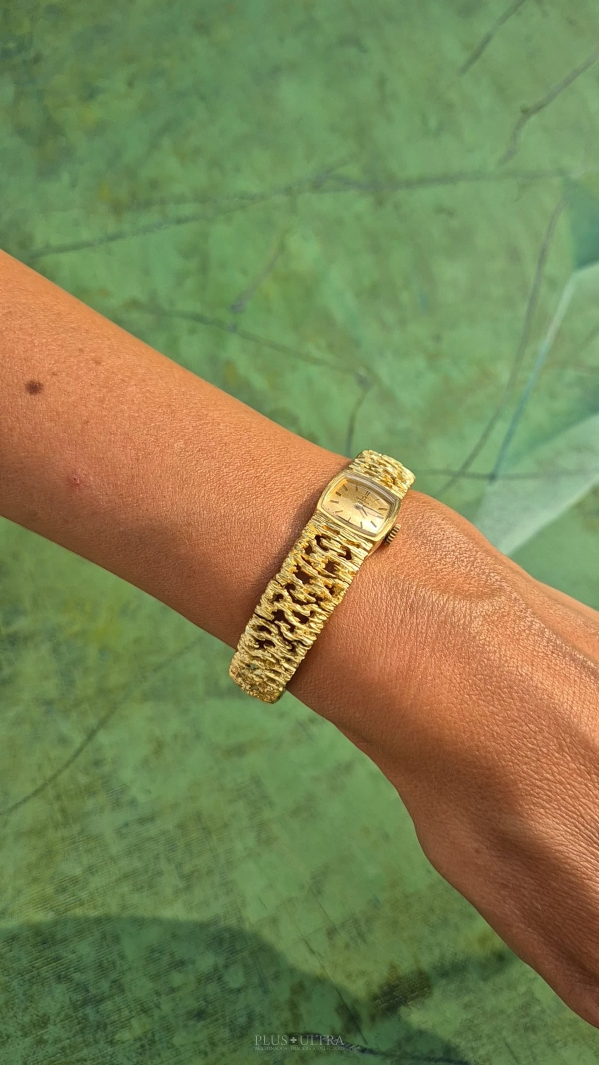 A 1966 Gilbert Albert-designed Braceletwatch: Omega Frisson d'Or in 18K yellow gold. Unmistakable. The cragged surface of this iconic masterpiece reflects the light like flashy diamonds -- the reflective power of gold.