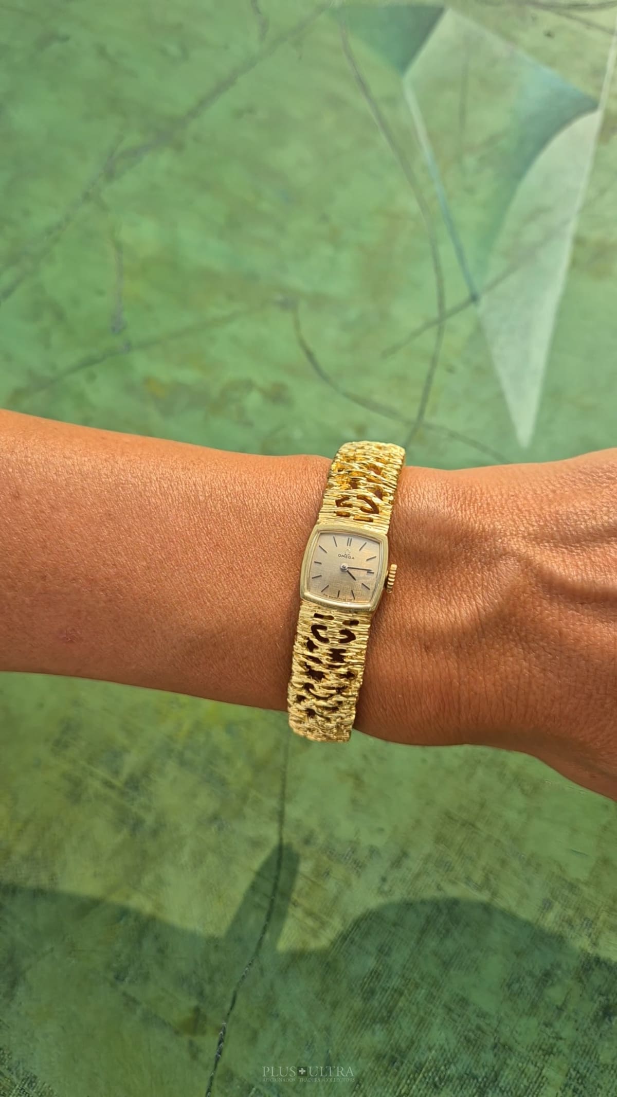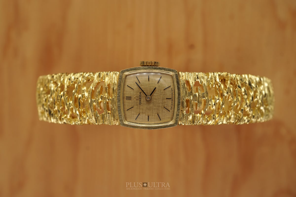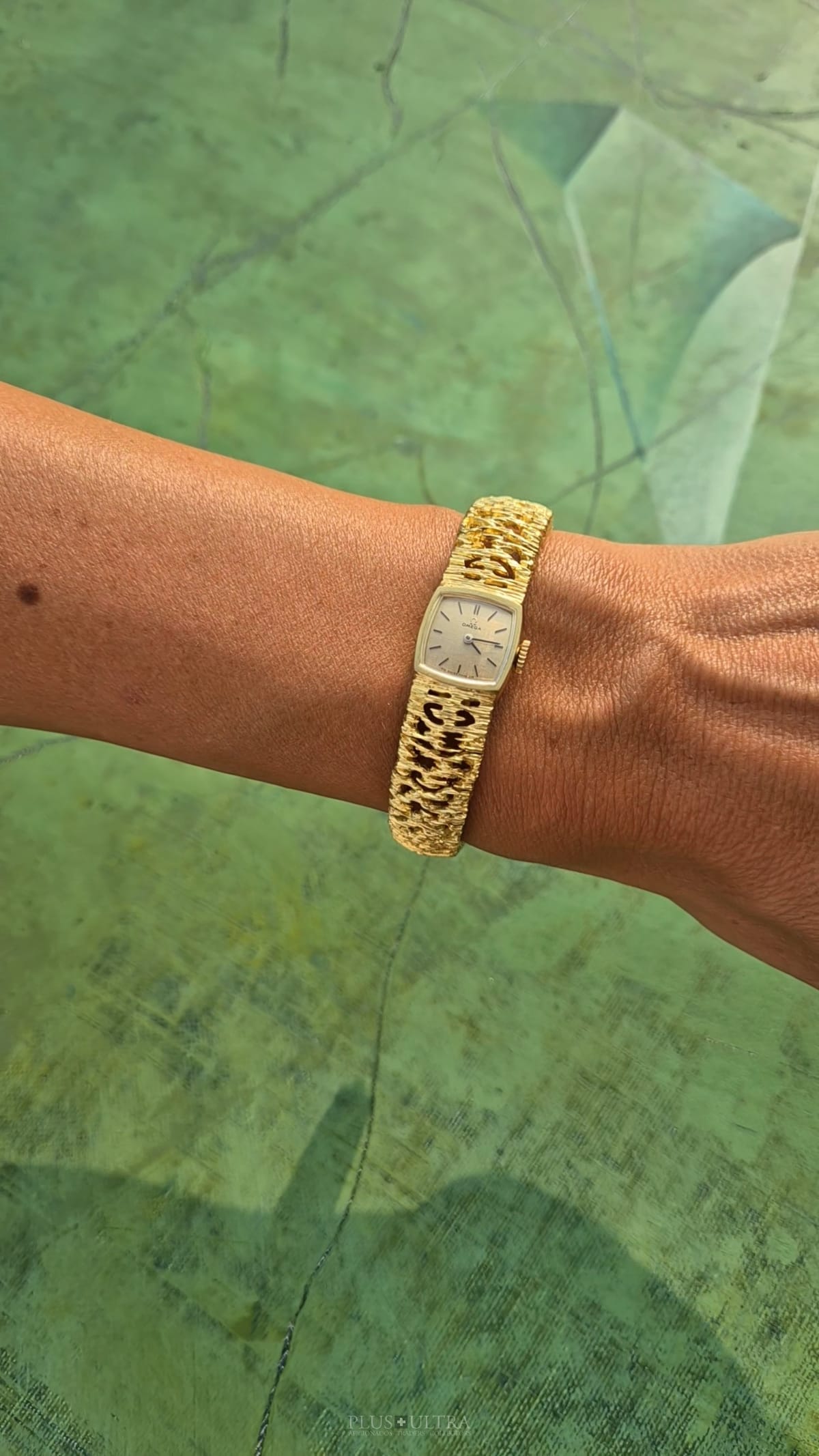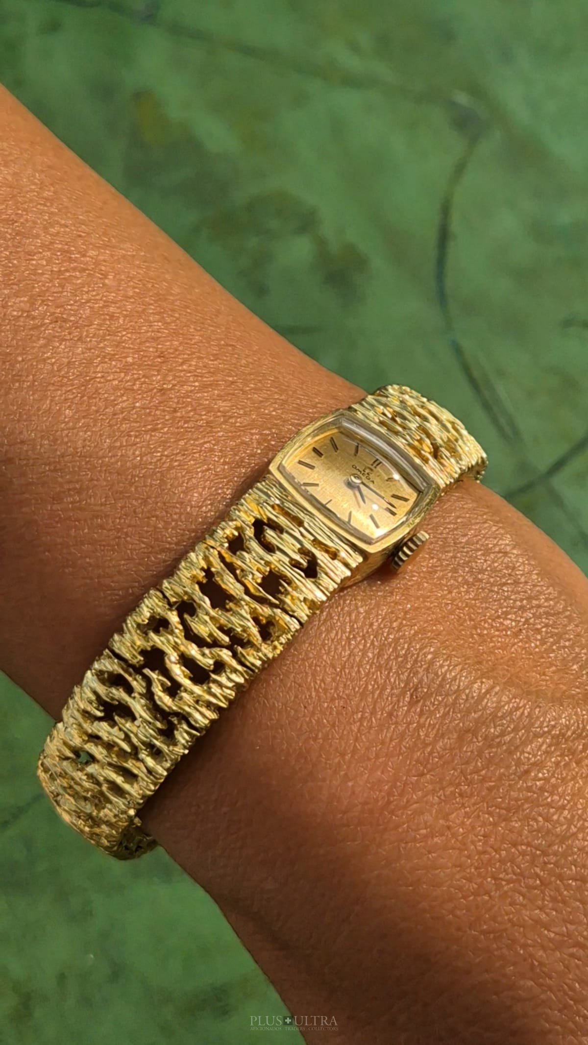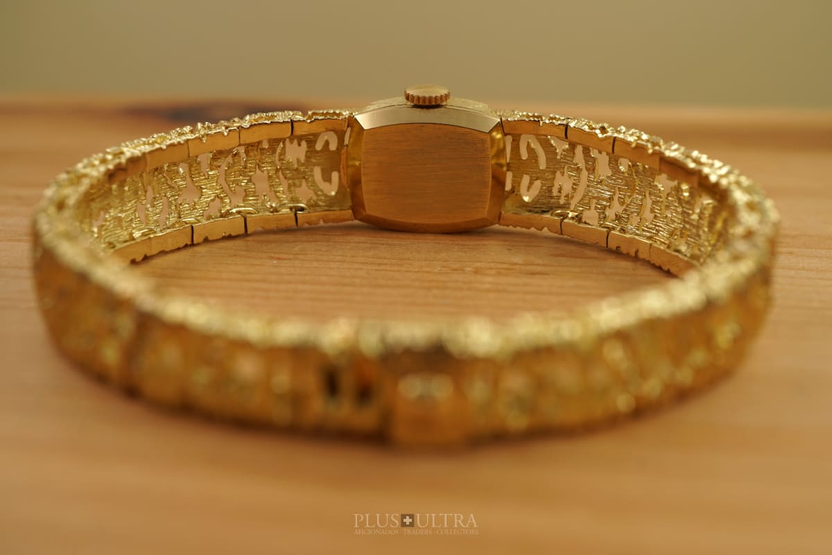 A 1966 Gilbert Albert-designed Braceletwatch: Omega Frisson d'Or in 18K yellow gold. Unmistakable. The cragged surface of this iconic masterpiece reflects the light like flashy diamonds -- the reflective power of gold.