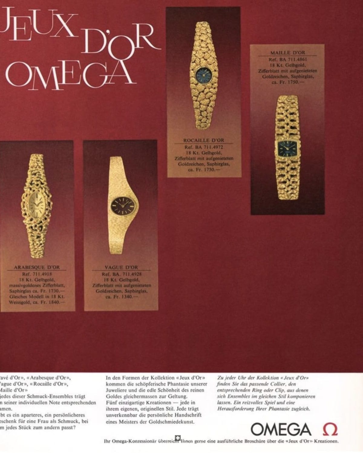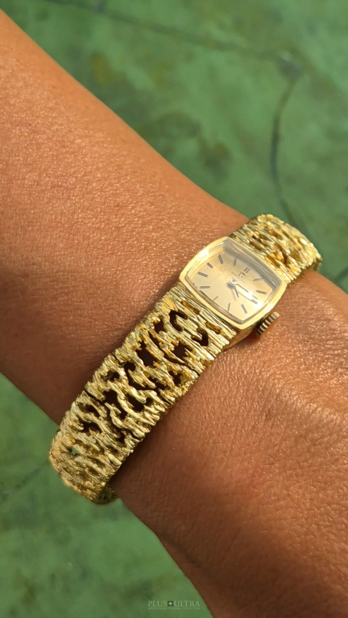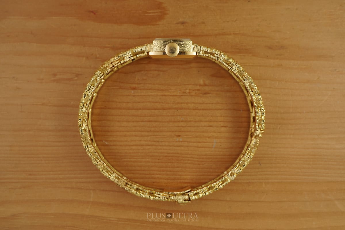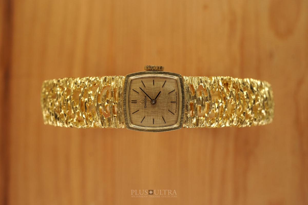 A 1966 Gilbert Albert-designed Braceletwatch: Omega Frisson d'Or in 18K yellow gold. Unmistakable. The cragged surface of this iconic masterpiece reflects the light like flashy diamonds -- the reflective power of gold.