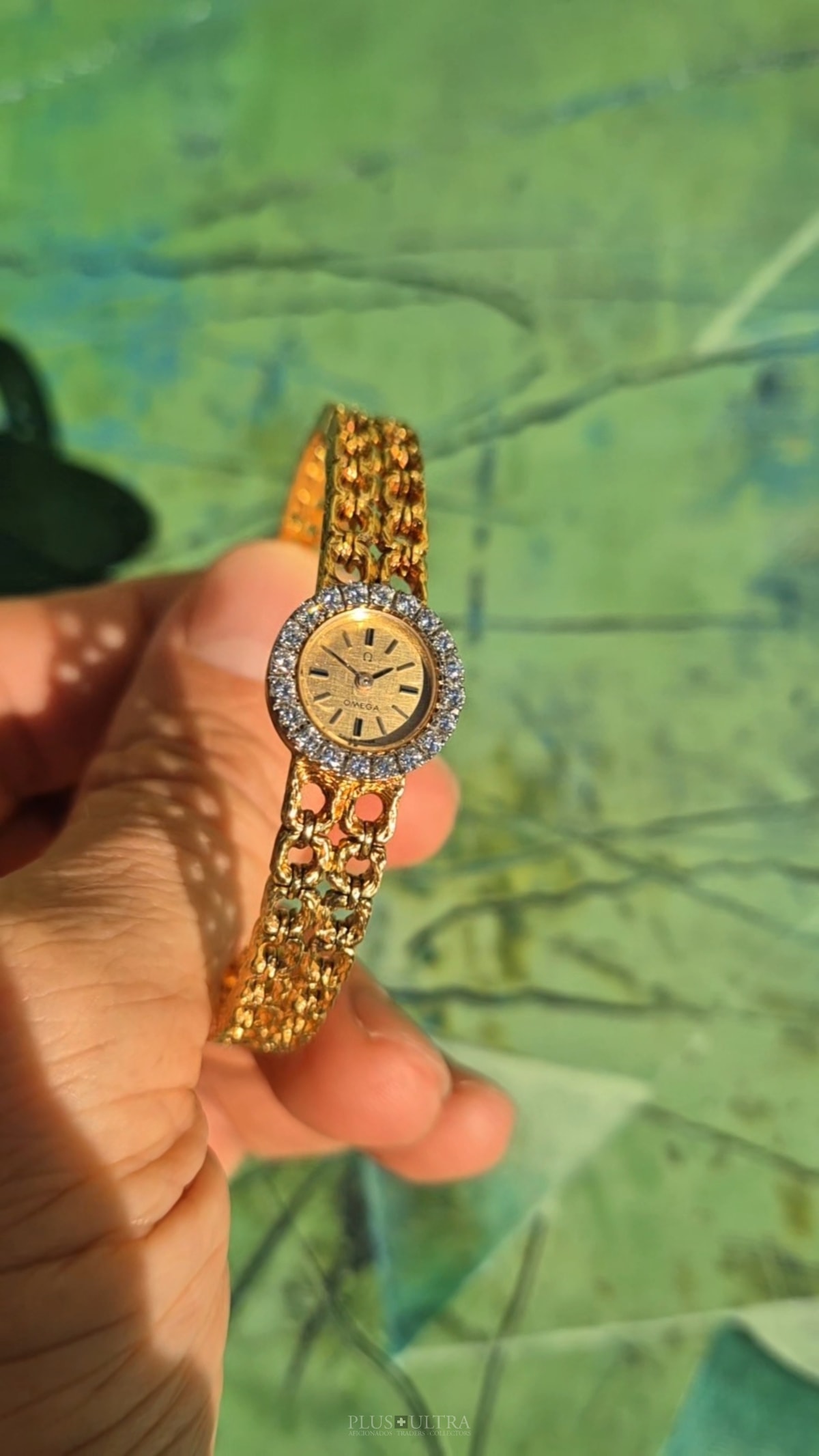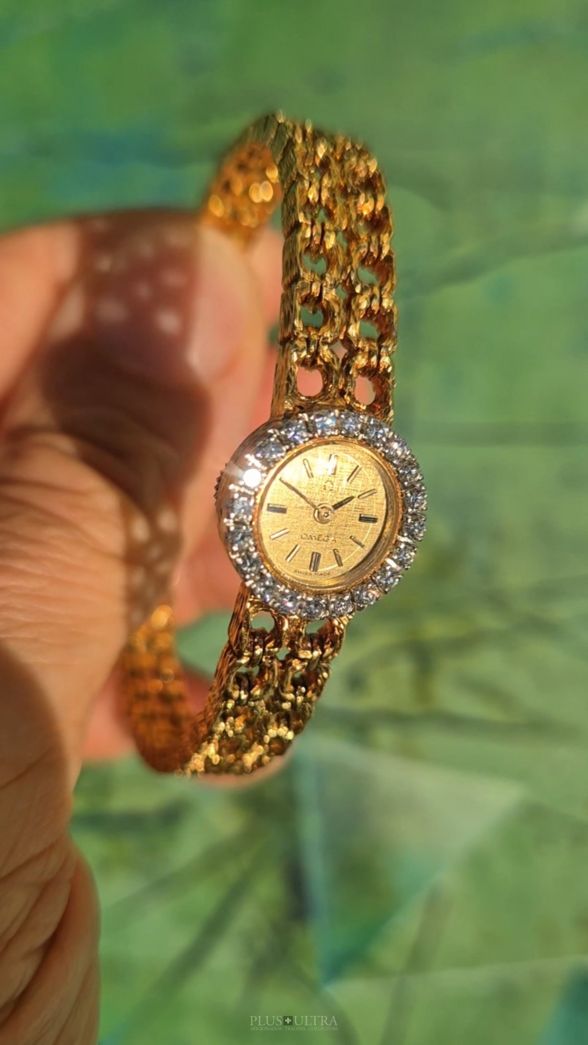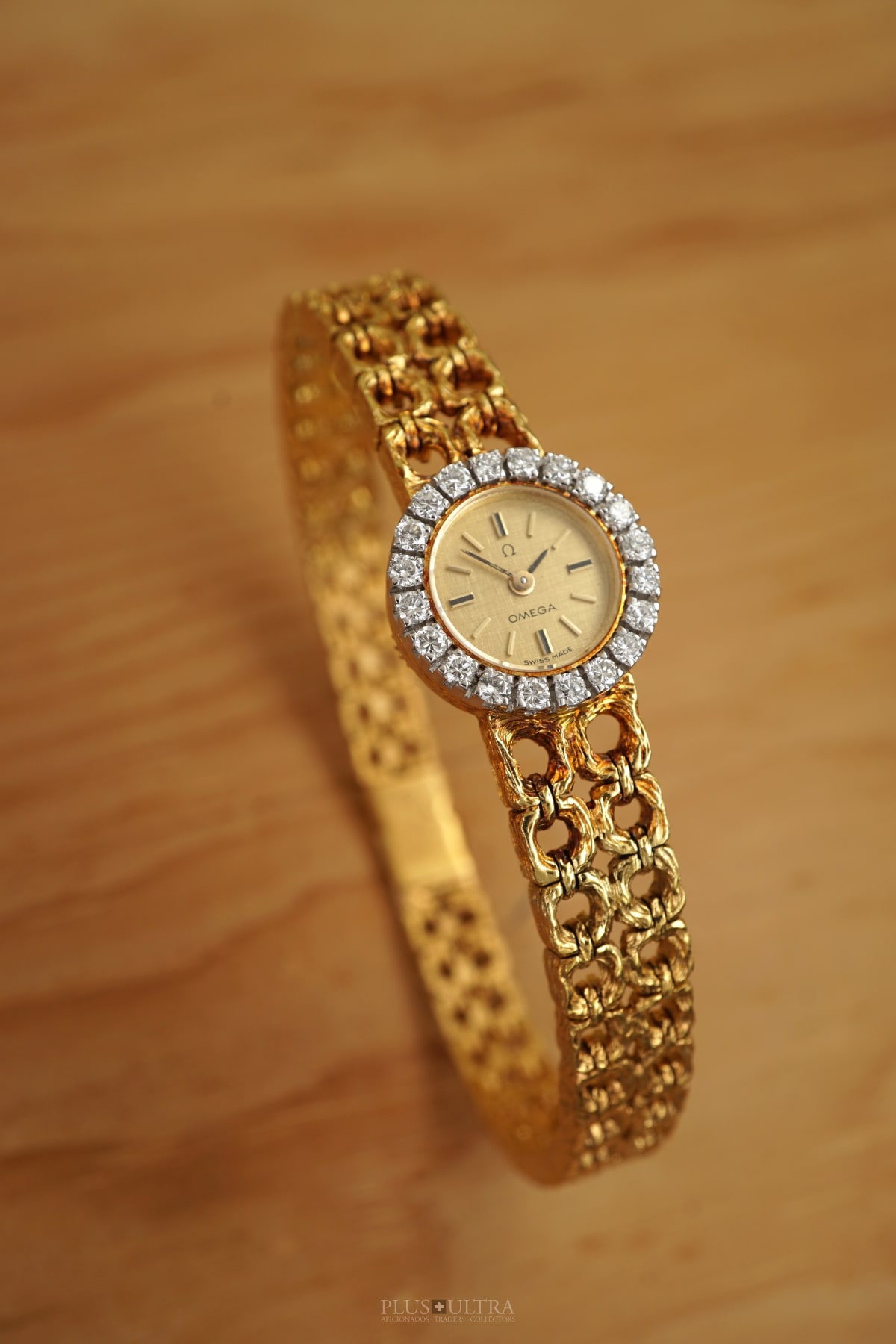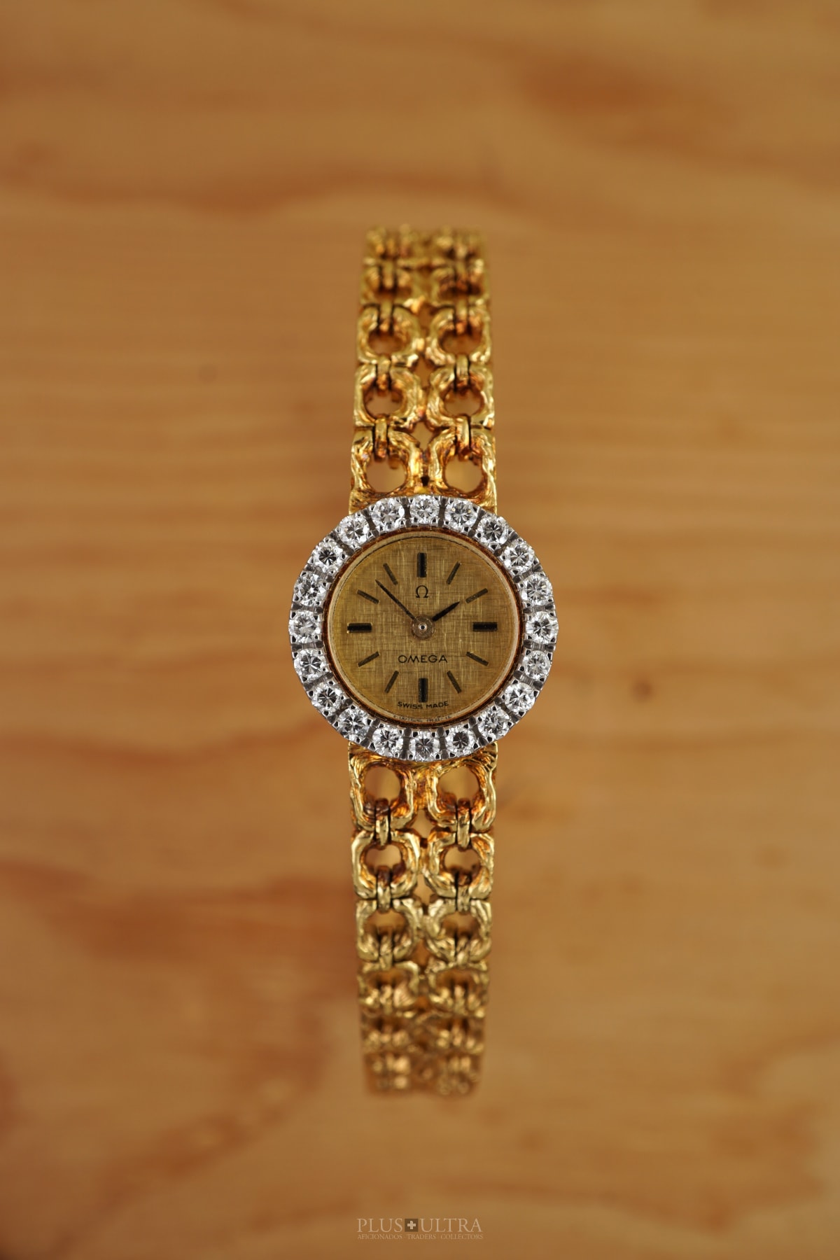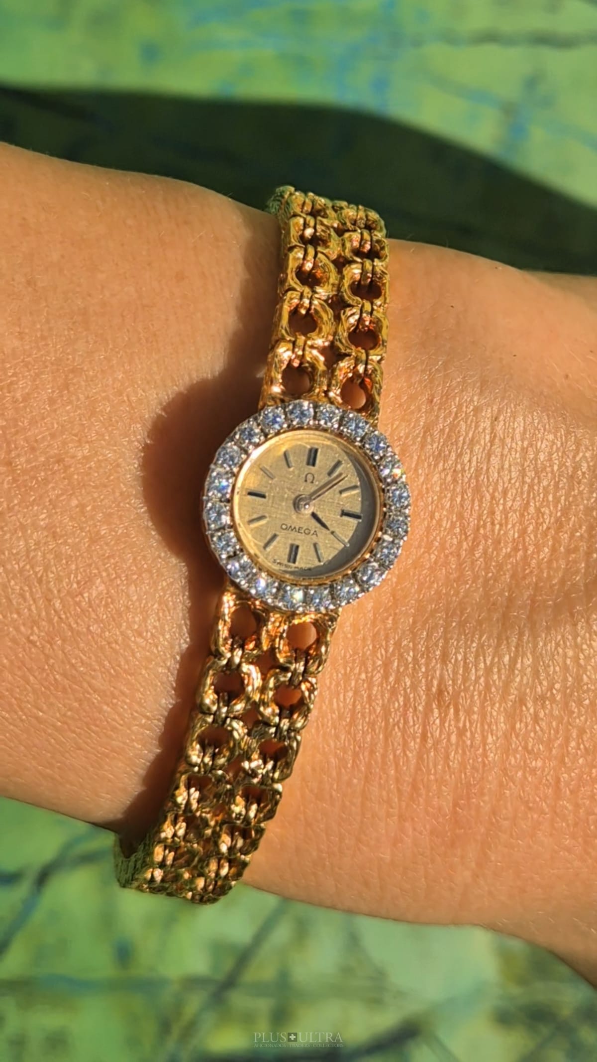 The watch was made in 1966 according to our books and research. The linen-dial has twelve applied indexes and is clean and original like the Omega-set diamonds on the corona and all other parts of this beautiful and exalted ladieswatch. The backwinder-movement is a super-small DuoPlan in the tradition of the 1920s technical marvel JLC cal101: serviced and running reliable & precise. Overall it is in amazing and all-original condition. The unpolished case & bracelet has developed a fine and unique honey-gold tarnish to perfectly fit bronze-skin in the summer. It comes with a fitted box: so it is gift- & immediately wear-able.