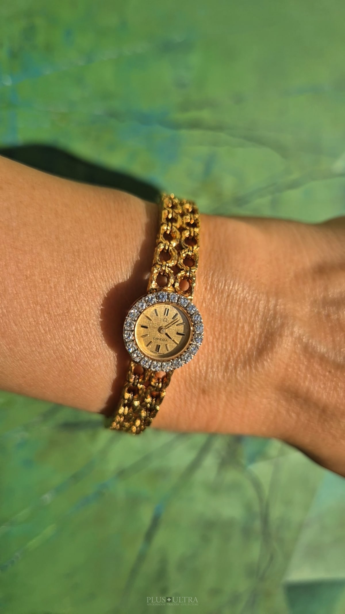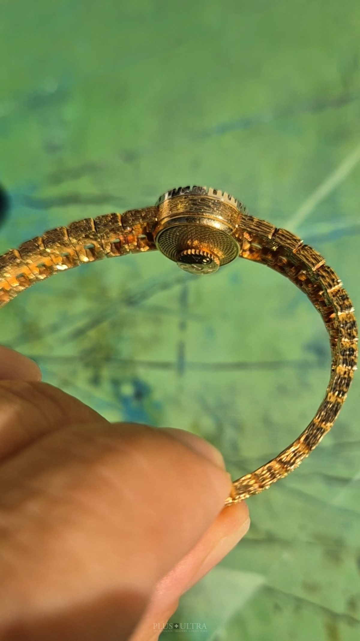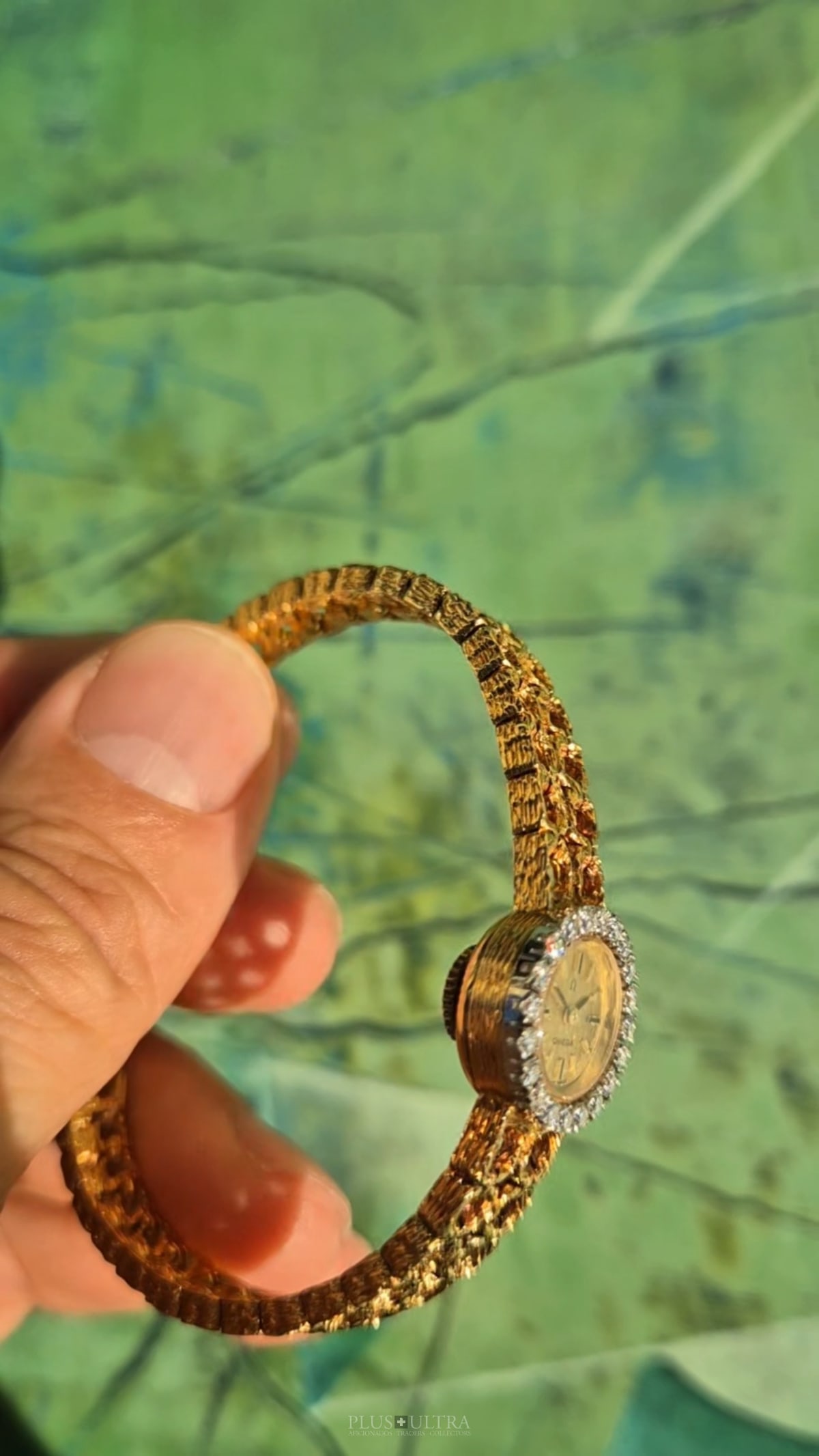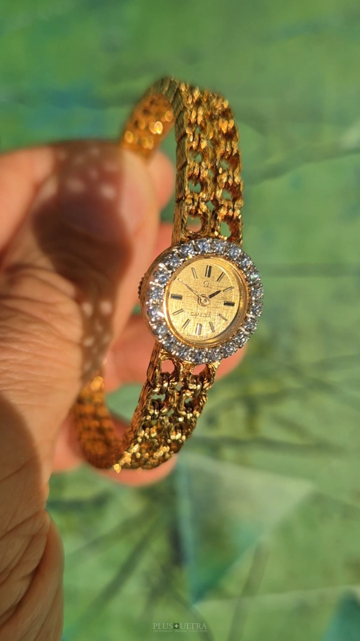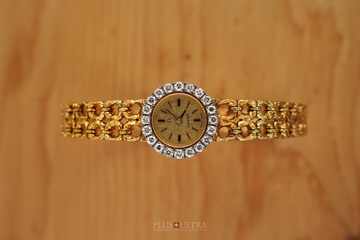 The watch was made in 1966 according to our books and research. The linen-dial has twelve applied indexes and is clean and original like the Omega-set diamonds on the corona and all other parts of this beautiful and exalted ladieswatch. The backwinder-movement is a super-small DuoPlan in the tradition of the 1920s technical marvel JLC cal101: serviced and running reliable & precise. Overall it is in amazing and all-original condition. The unpolished case & bracelet has developed a fine and unique honey-gold tarnish to perfectly fit bronze-skin in the summer. It comes with a fitted box: so it is gift- & immediately wear-able.