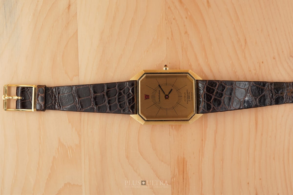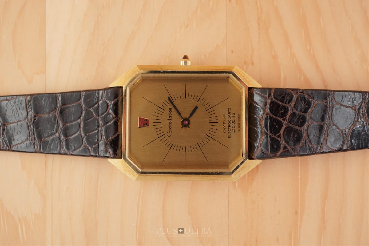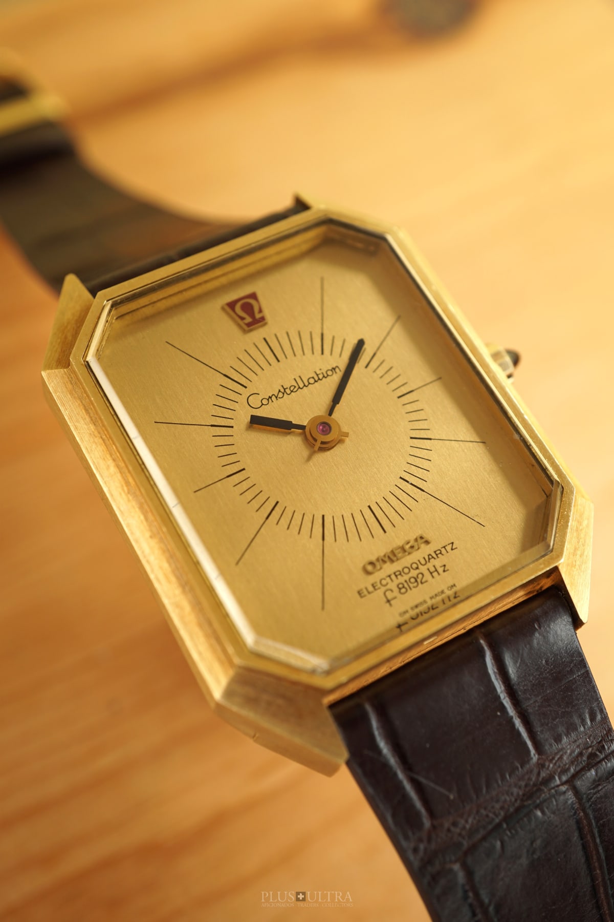 Very good condition octagonal Omega Constellation ElectroQuartz 8'192Hz with the Beta21 movement: inspired or designed (different sources say different things) by the About Time collection of Andrew Grim and made in very low numbers in heavy and beautiful gold cases and now definitely a rare one, given the low quantities made and the number of examples that were unfortunately smelted in the 1980s and later.