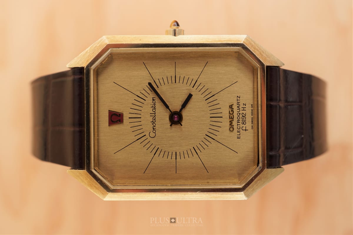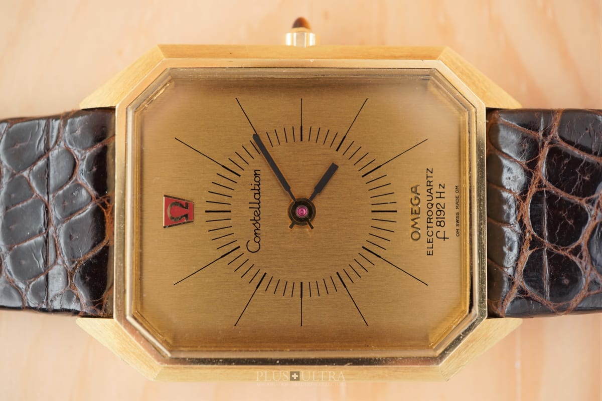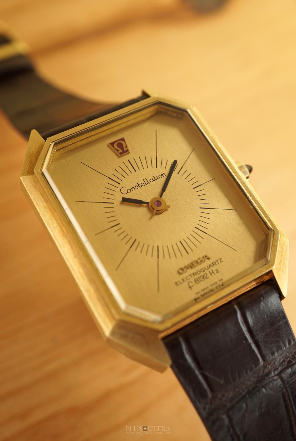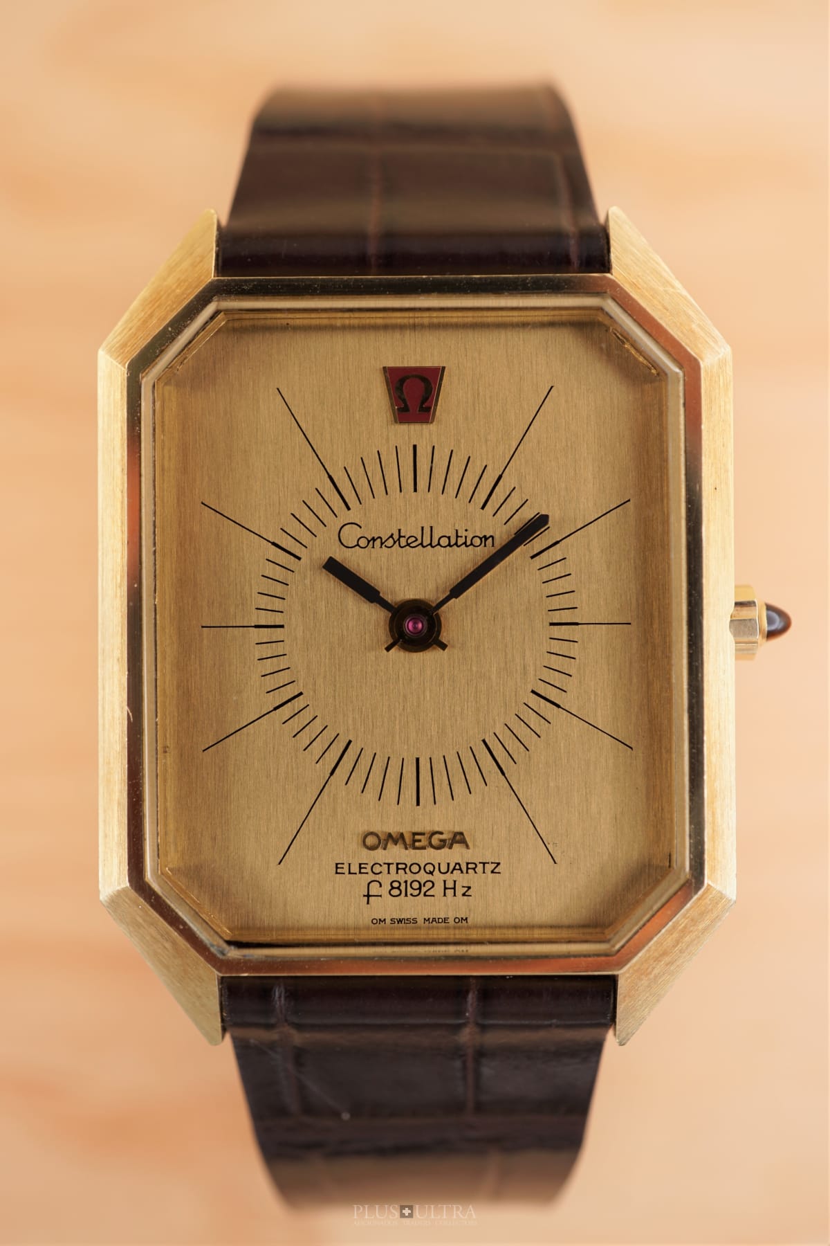 Very good condition octagonal Omega Constellation ElectroQuartz 8'192Hz with the Beta21 movement: inspired or designed (different sources say different things) by the About Time collection of Andrew Grim and made in very low numbers in heavy and beautiful gold cases and now definitely a rare one, given the low quantities made and the number of examples that were unfortunately smelted in the 1980s and later.