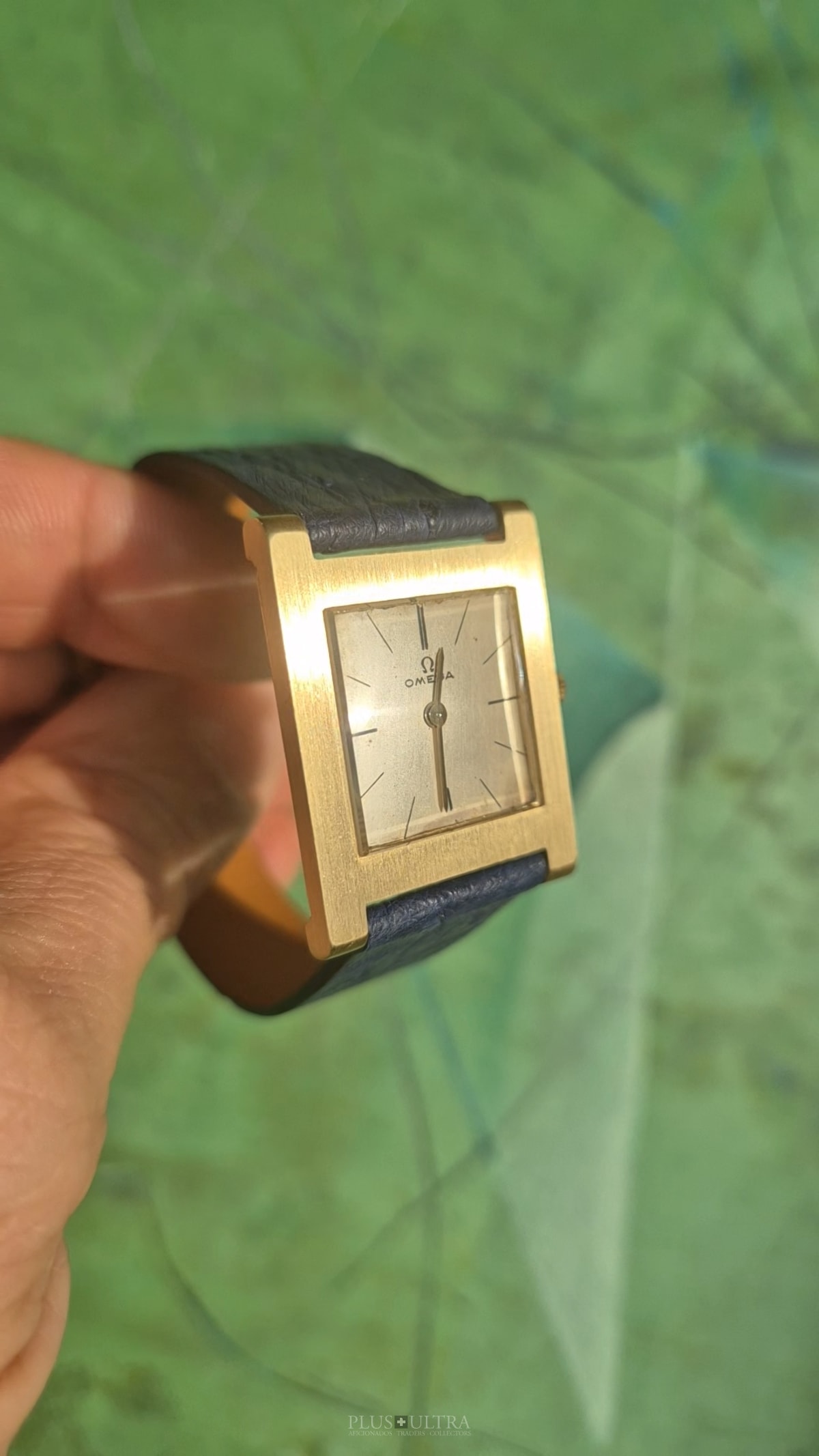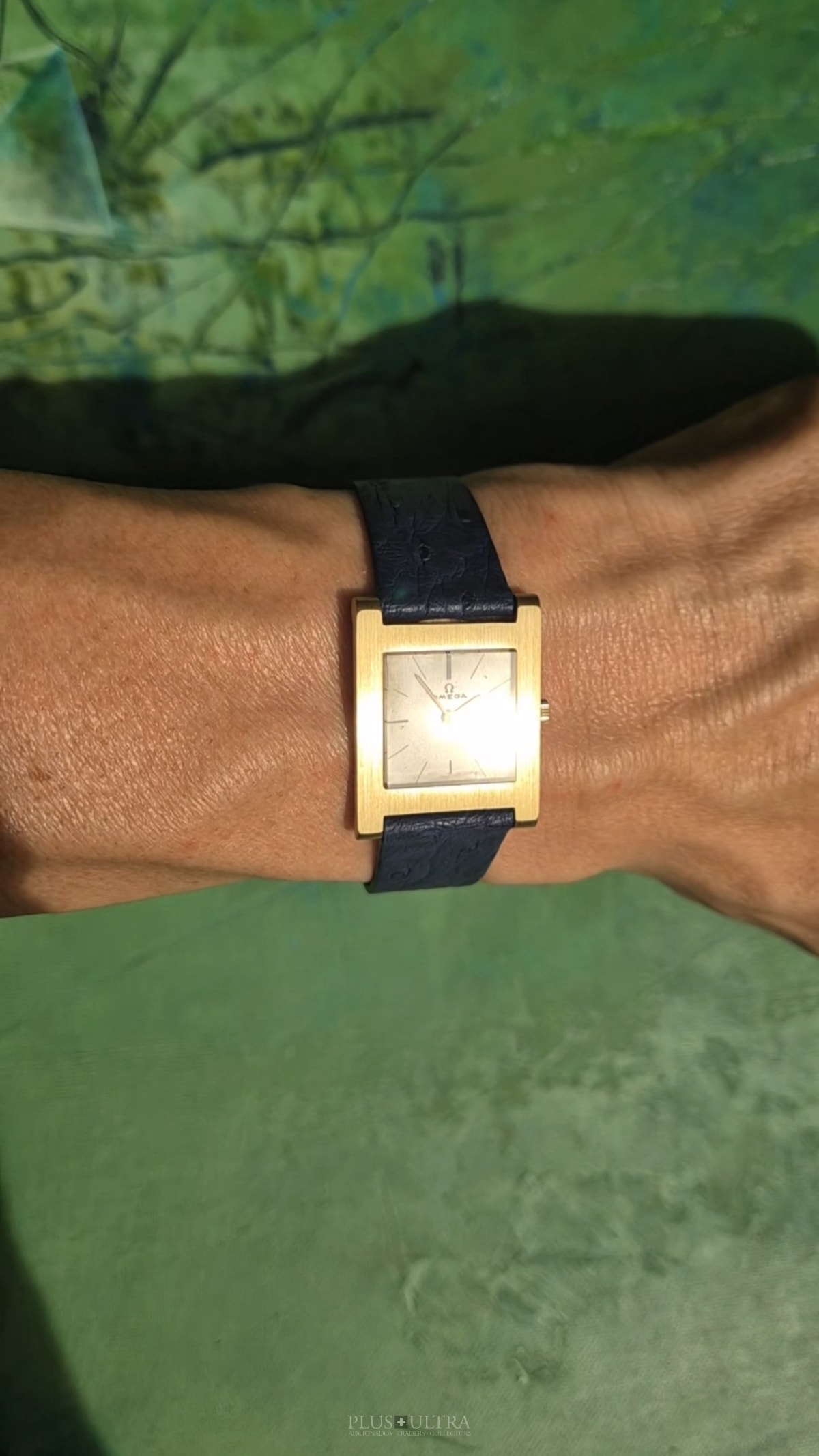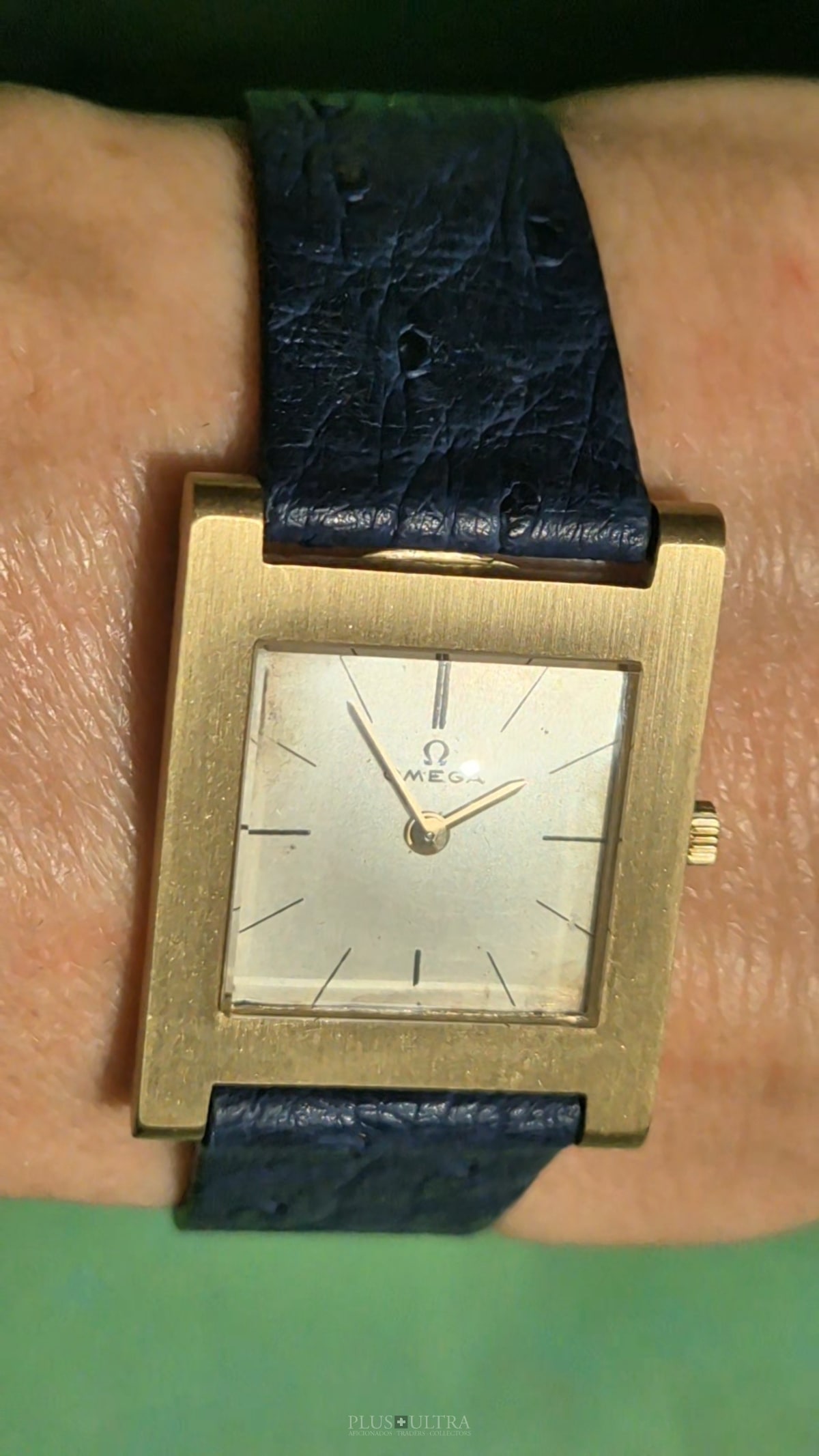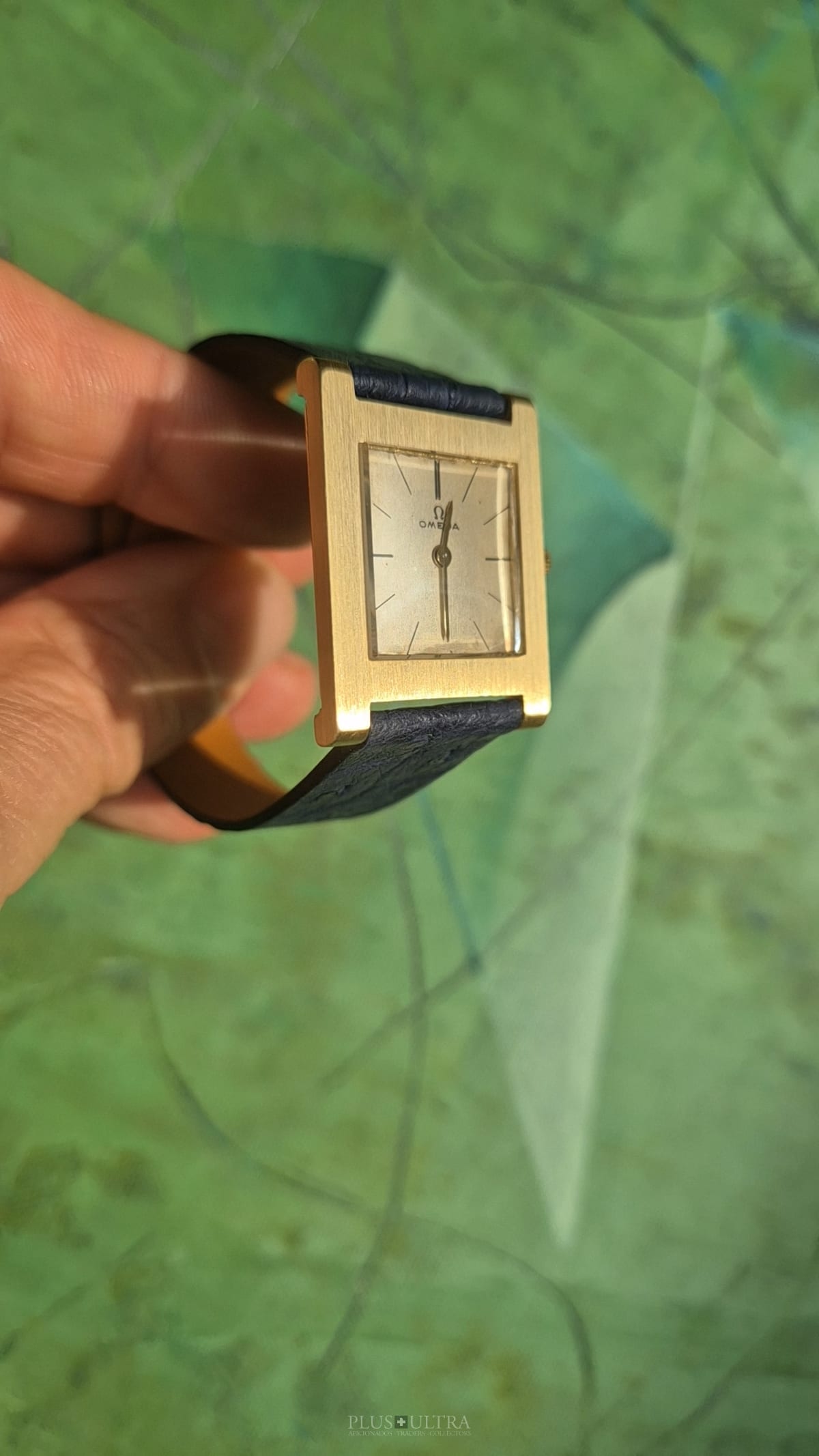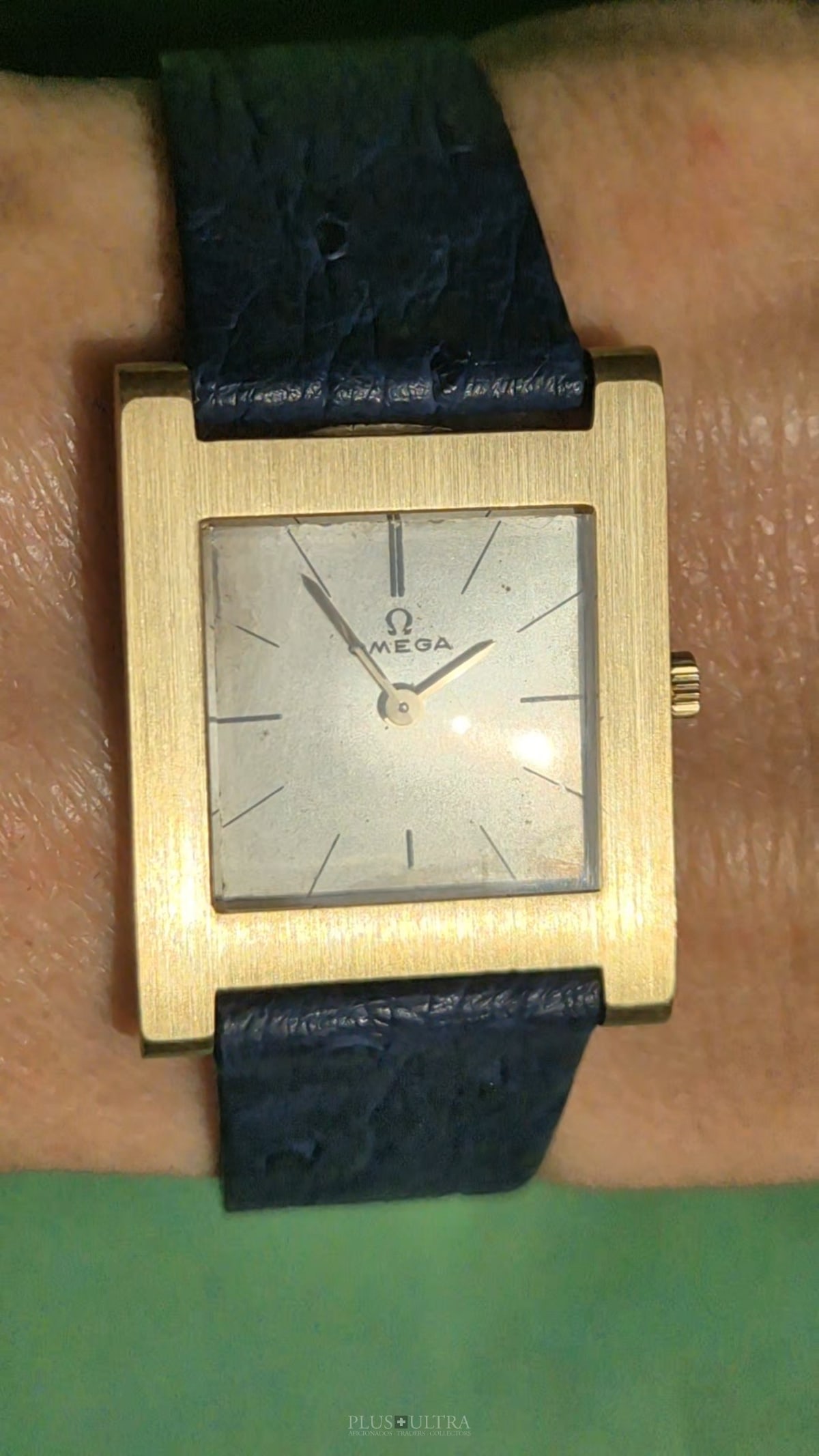 The watch was (approx) made in 1960 and serviced by Omega, Switzerland in Sep-2025. The beautiful geometric case (18K-yellowgold and made by Wenger SA, Geneve for Omega) is sharp and measures 25*32mm and is just a hairline thicker than 4mm -- incl crystal, of course. The dial was left in its vintage and very aesthetic condition and explicitly not refreshed / refurbished during the service -- and I think for a good reason: very authentic and a stark contrast to the now like-new case it is a aesthetically very appealing watch, now. The partial service by Omega included a full-serice of the movement, replacement of the crystal and refreshment of the 18K-yellowgold case.