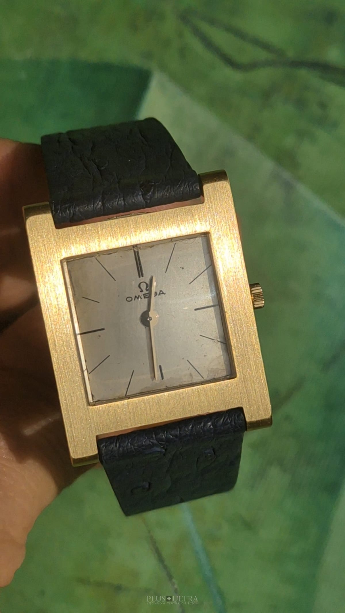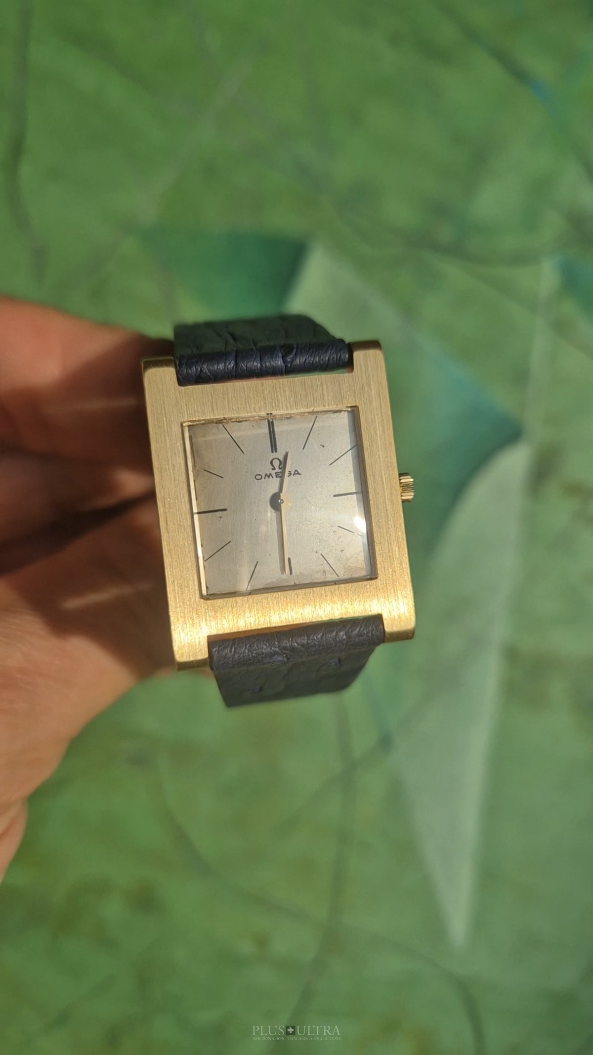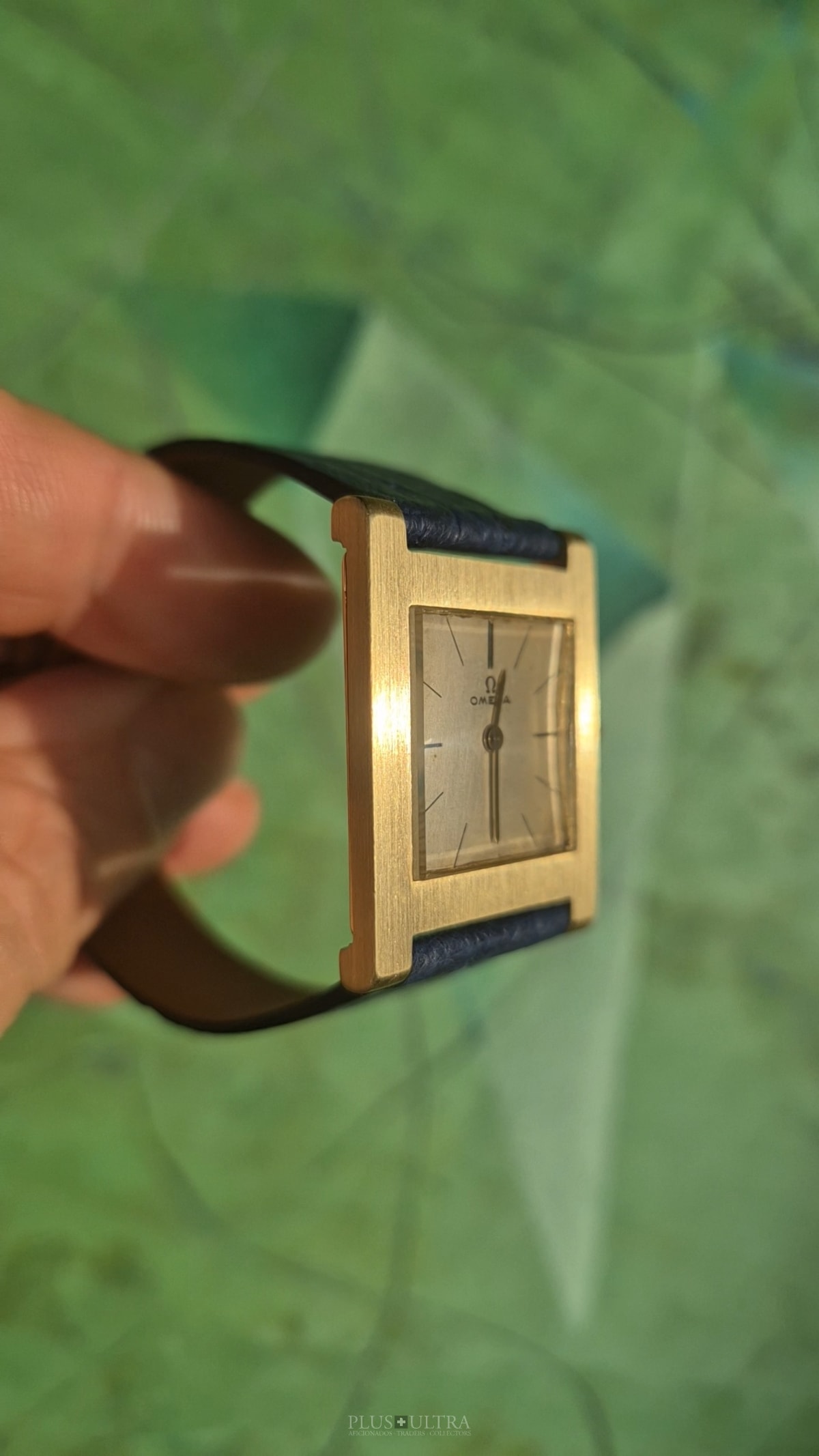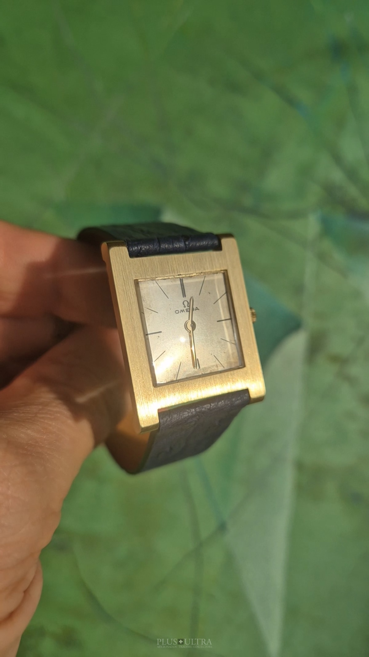 The watch was (approx) made in 1960 and serviced by Omega, Switzerland in Sep-2025. The beautiful geometric case (18K-yellowgold and made by Wenger SA, Geneve for Omega) is sharp and measures 25*32mm and is just a hairline thicker than 4mm -- incl crystal, of course. The dial was left in its vintage and very aesthetic condition and explicitly not refreshed / refurbished during the service -- and I think for a good reason: very authentic and a stark contrast to the now like-new case it is a aesthetically very appealing watch, now. The partial service by Omega included a full-serice of the movement, replacement of the crystal and refreshment of the 18K-yellowgold case.