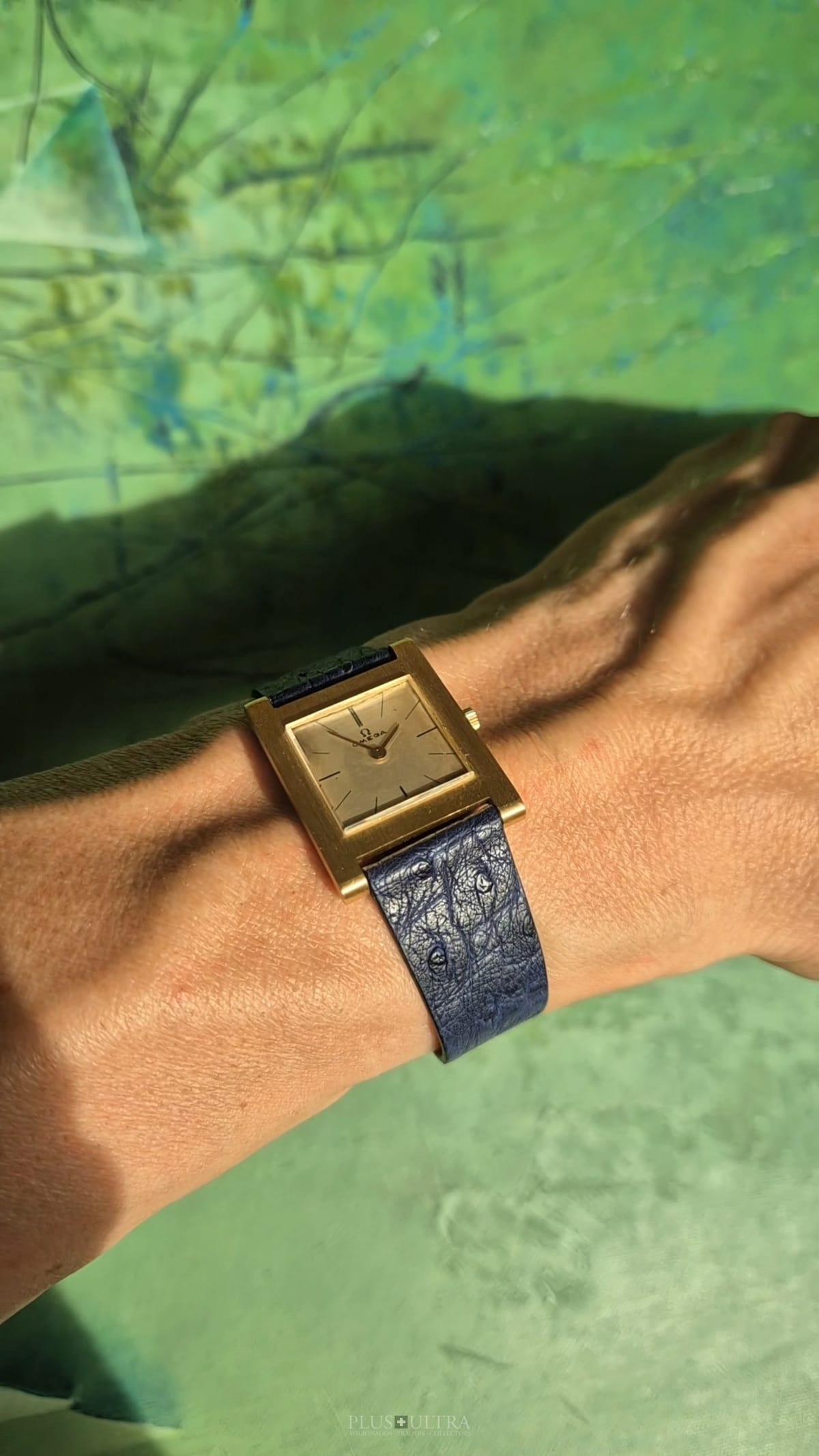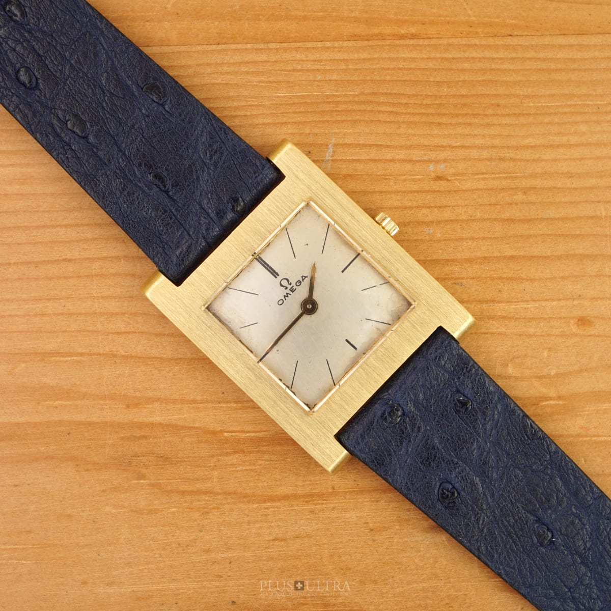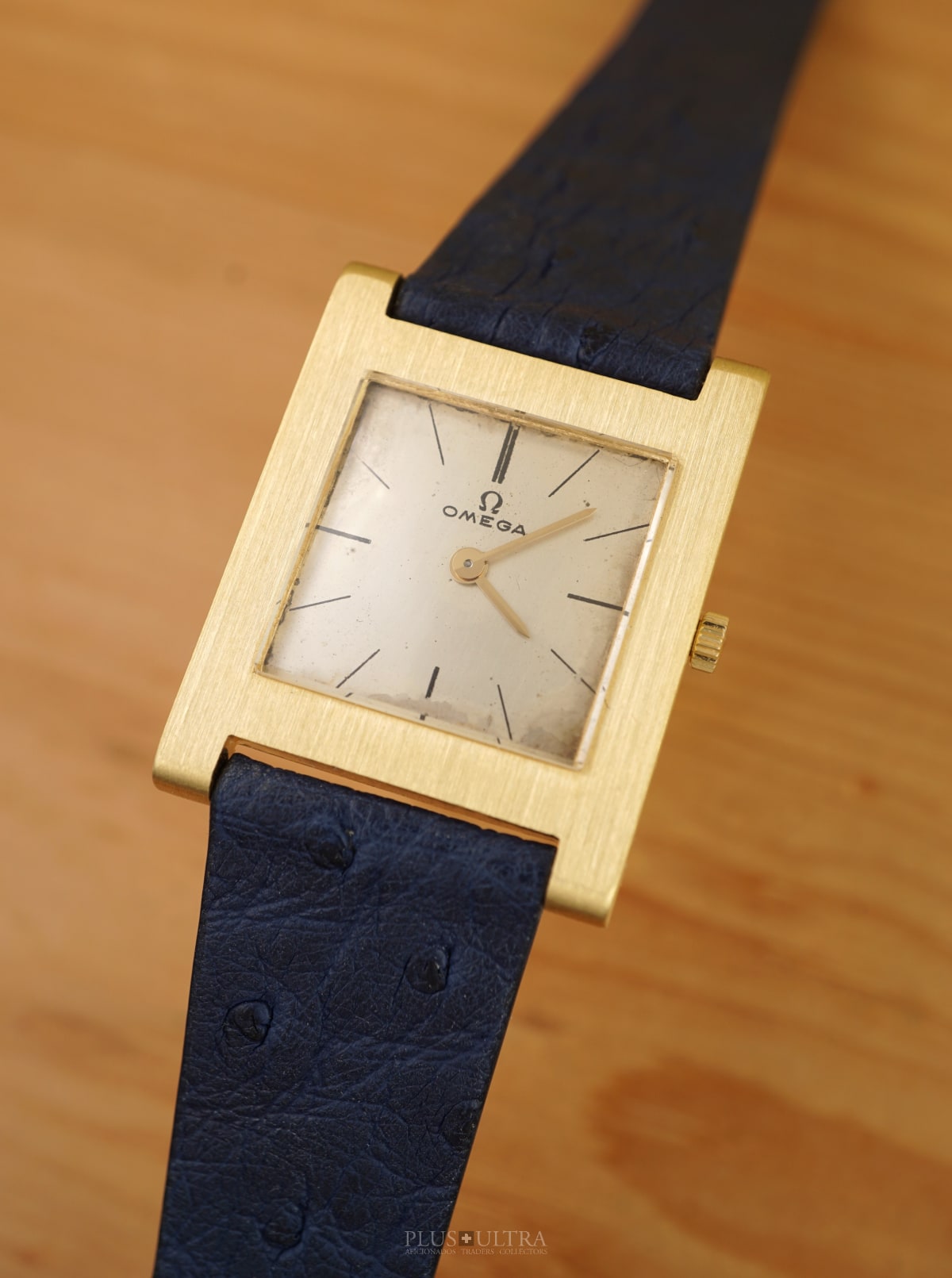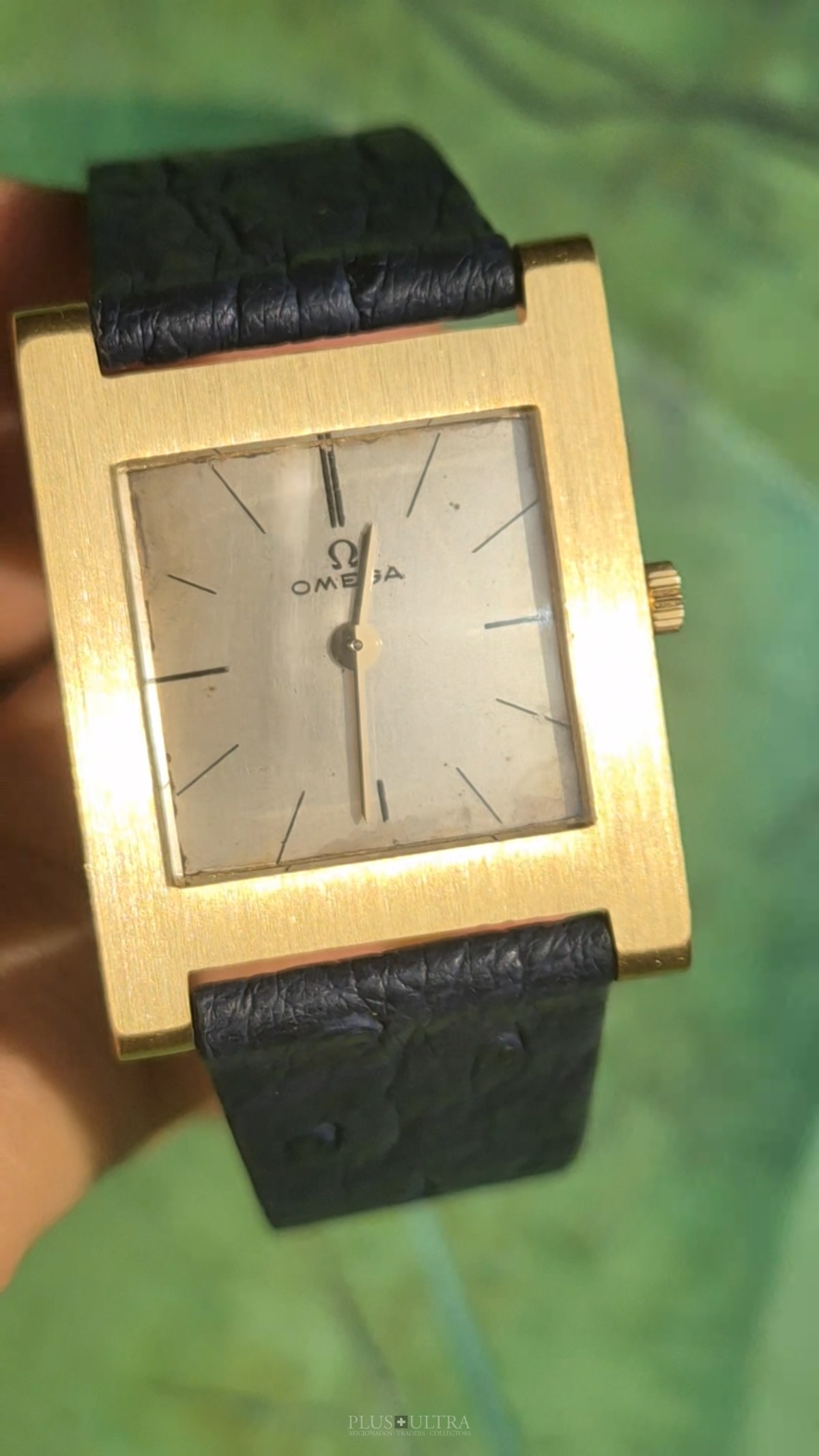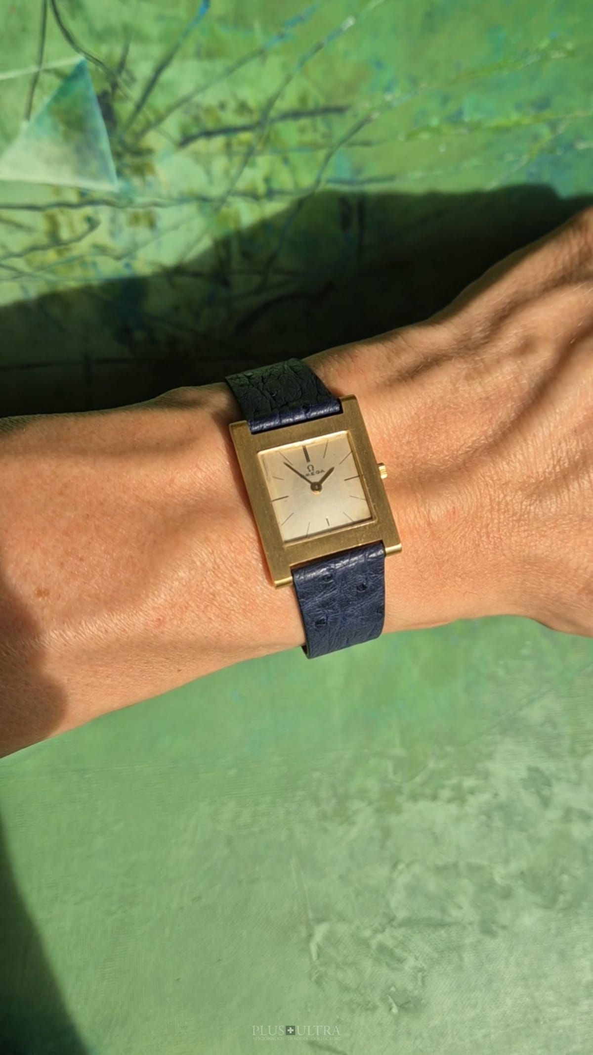 The watch was (approx) made in 1960 and serviced by Omega, Switzerland in Sep-2025. The beautiful geometric case (18K-yellowgold and made by Wenger SA, Geneve for Omega) is sharp and measures 25*32mm and is just a hairline thicker than 4mm -- incl crystal, of course. The dial was left in its vintage and very aesthetic condition and explicitly not refreshed / refurbished during the service -- and I think for a good reason: very authentic and a stark contrast to the now like-new case it is a aesthetically very appealing watch, now. The partial service by Omega included a full-serice of the movement, replacement of the crystal and refreshment of the 18K-yellowgold case.