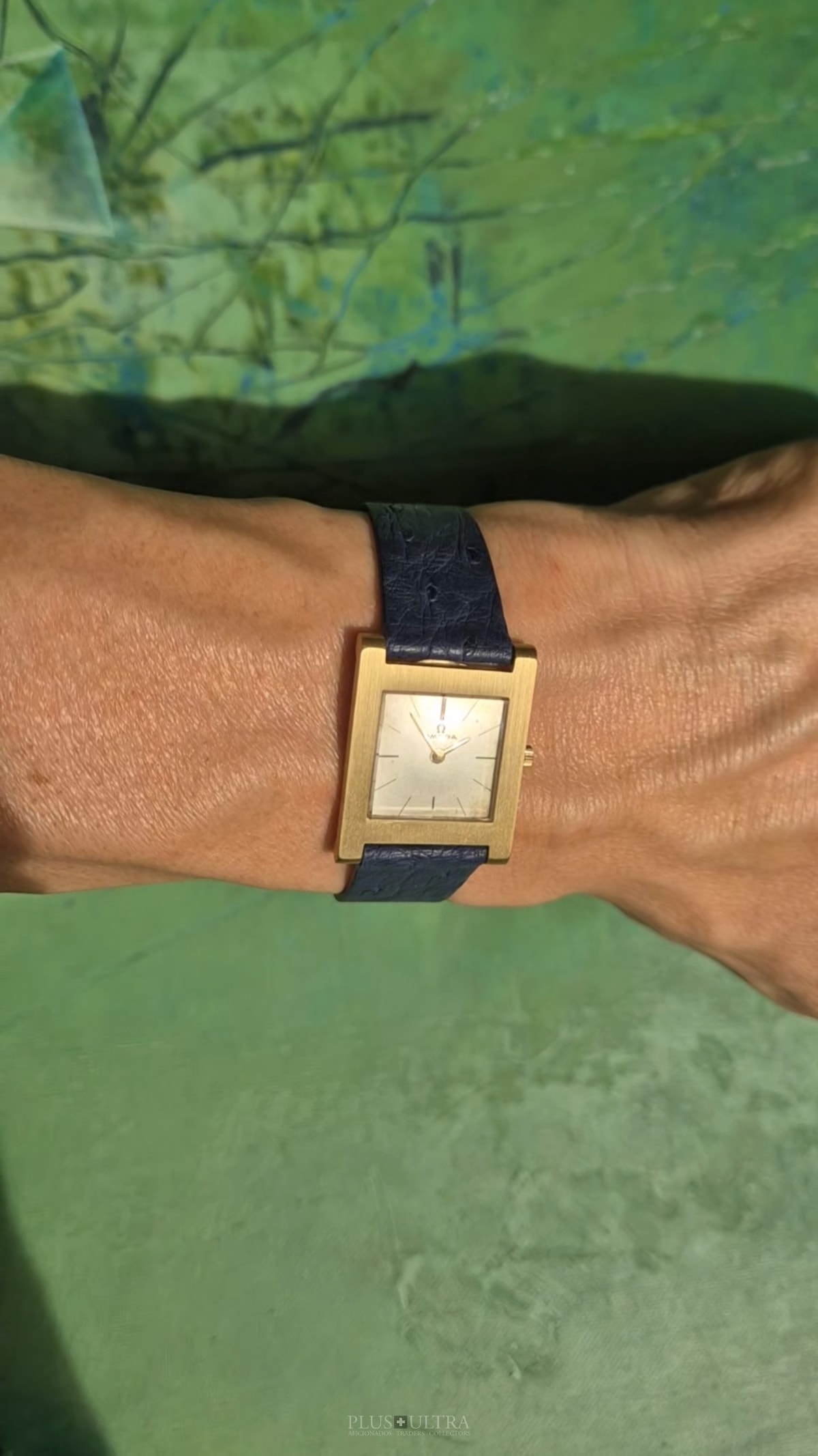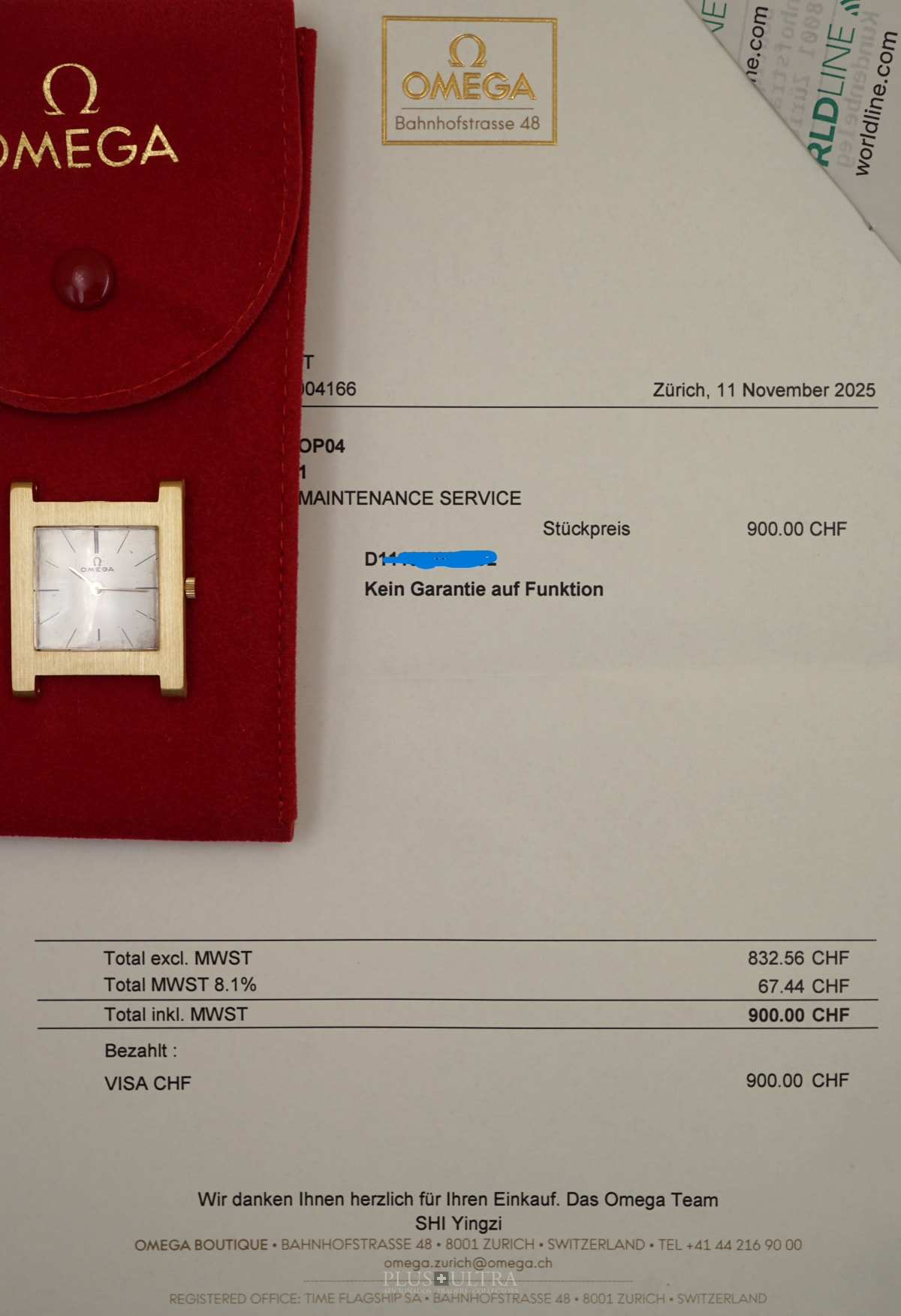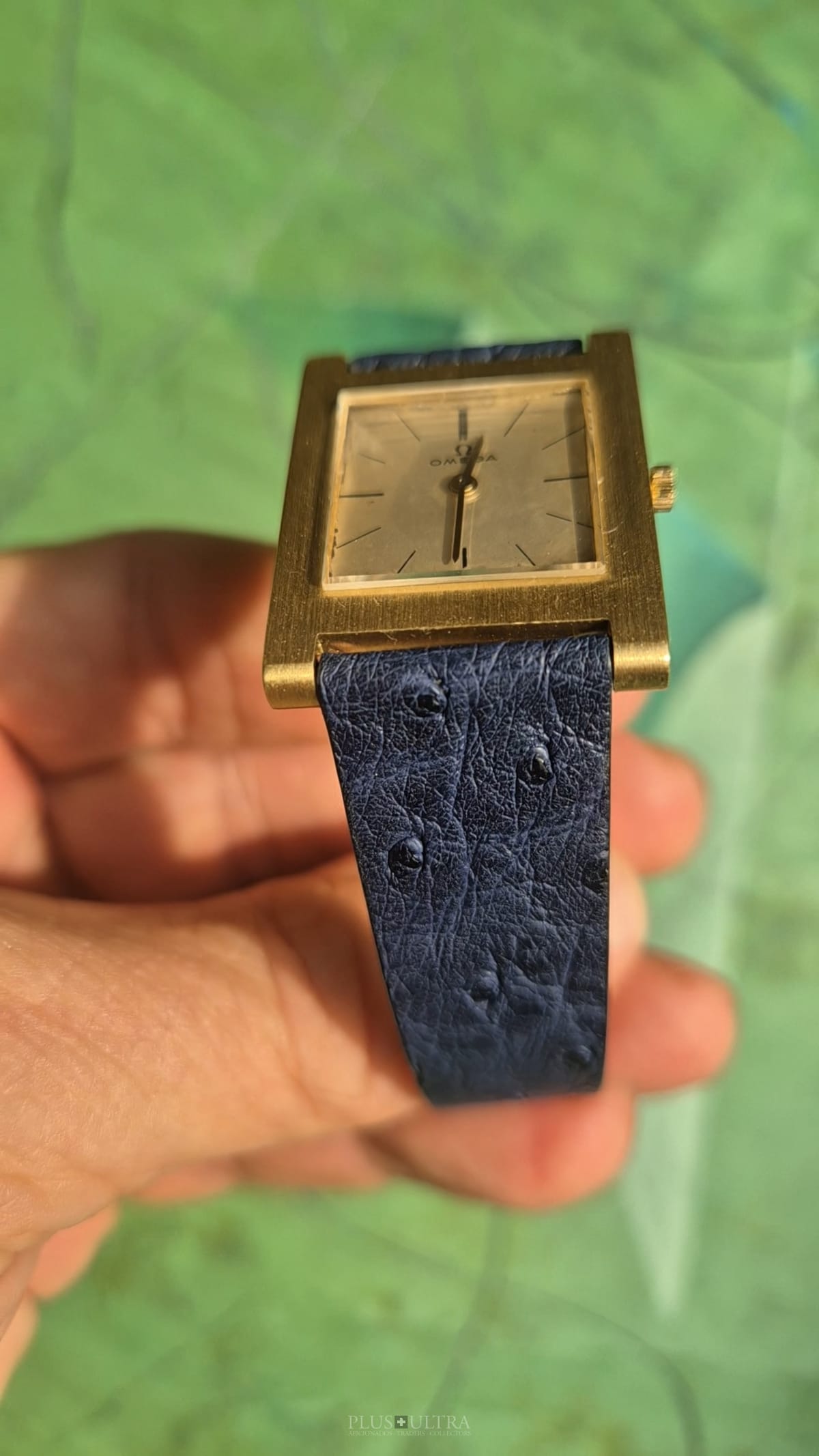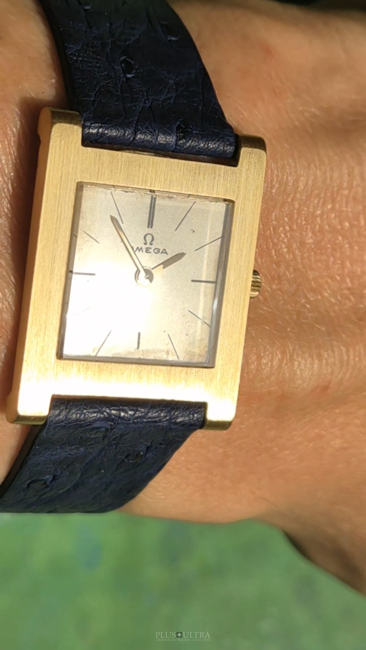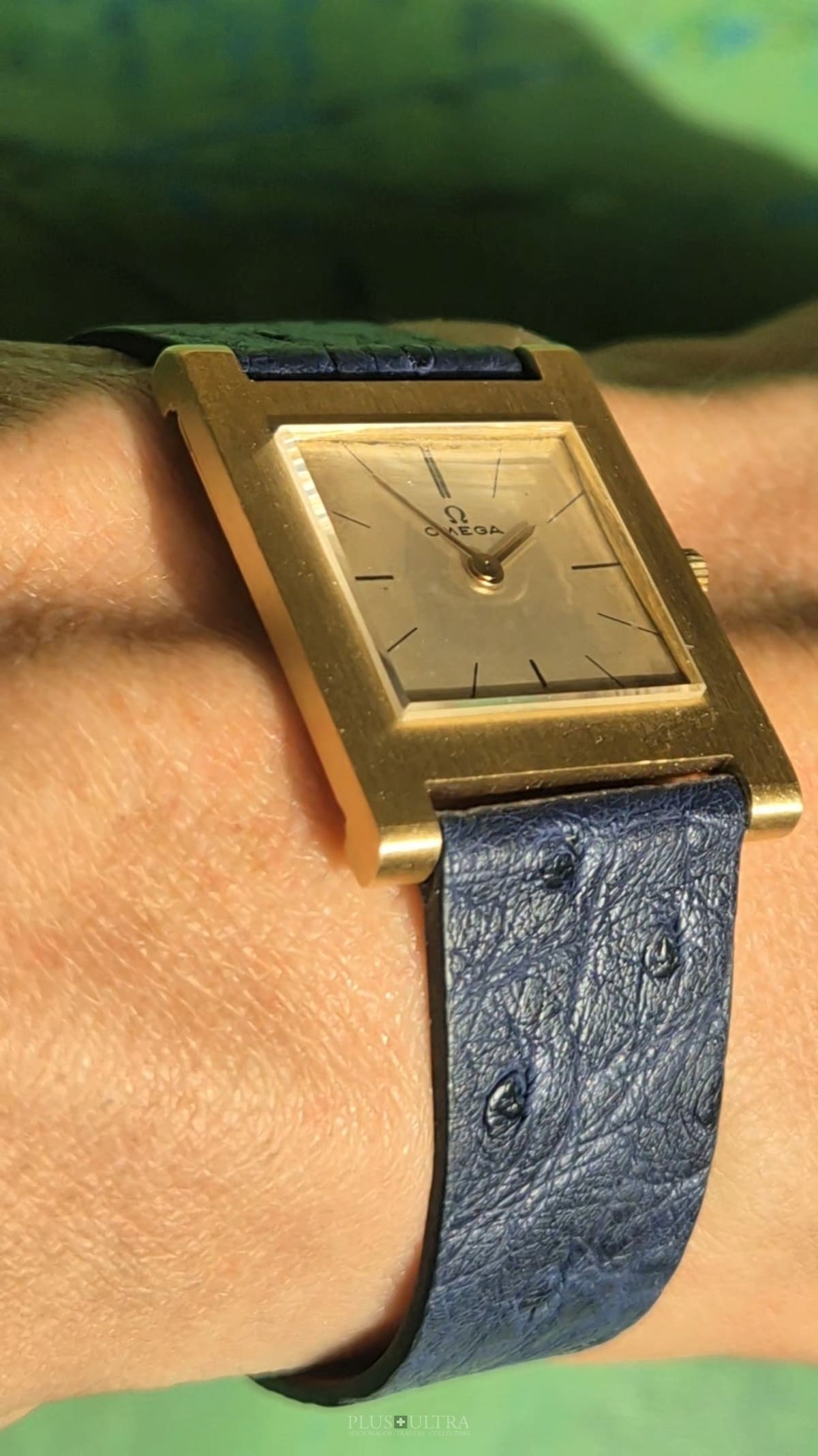 The watch was (approx) made in 1960 and serviced by Omega, Switzerland in Sep-2025. The beautiful geometric case (18K-yellowgold and made by Wenger SA, Geneve for Omega) is sharp and measures 25*32mm and is just a hairline thicker than 4mm -- incl crystal, of course. The dial was left in its vintage and very aesthetic condition and explicitly not refreshed / refurbished during the service -- and I think for a good reason: very authentic and a stark contrast to the now like-new case it is a aesthetically very appealing watch, now. The partial service by Omega included a full-serice of the movement, replacement of the crystal and refreshment of the 18K-yellowgold case.