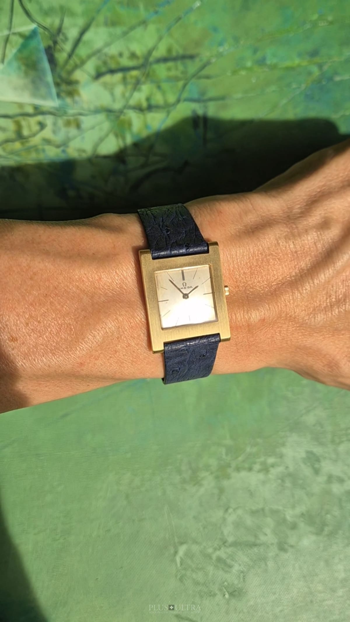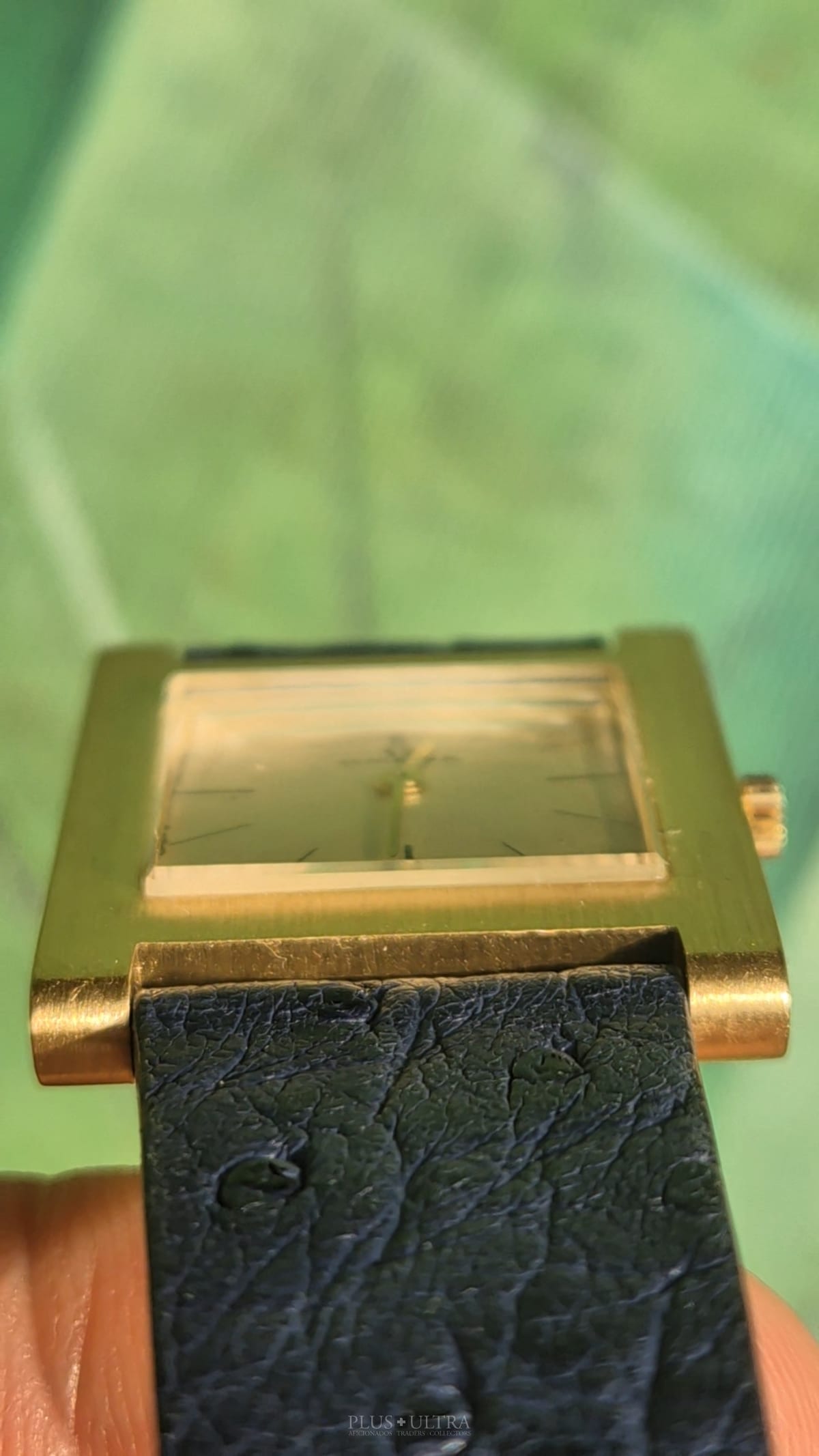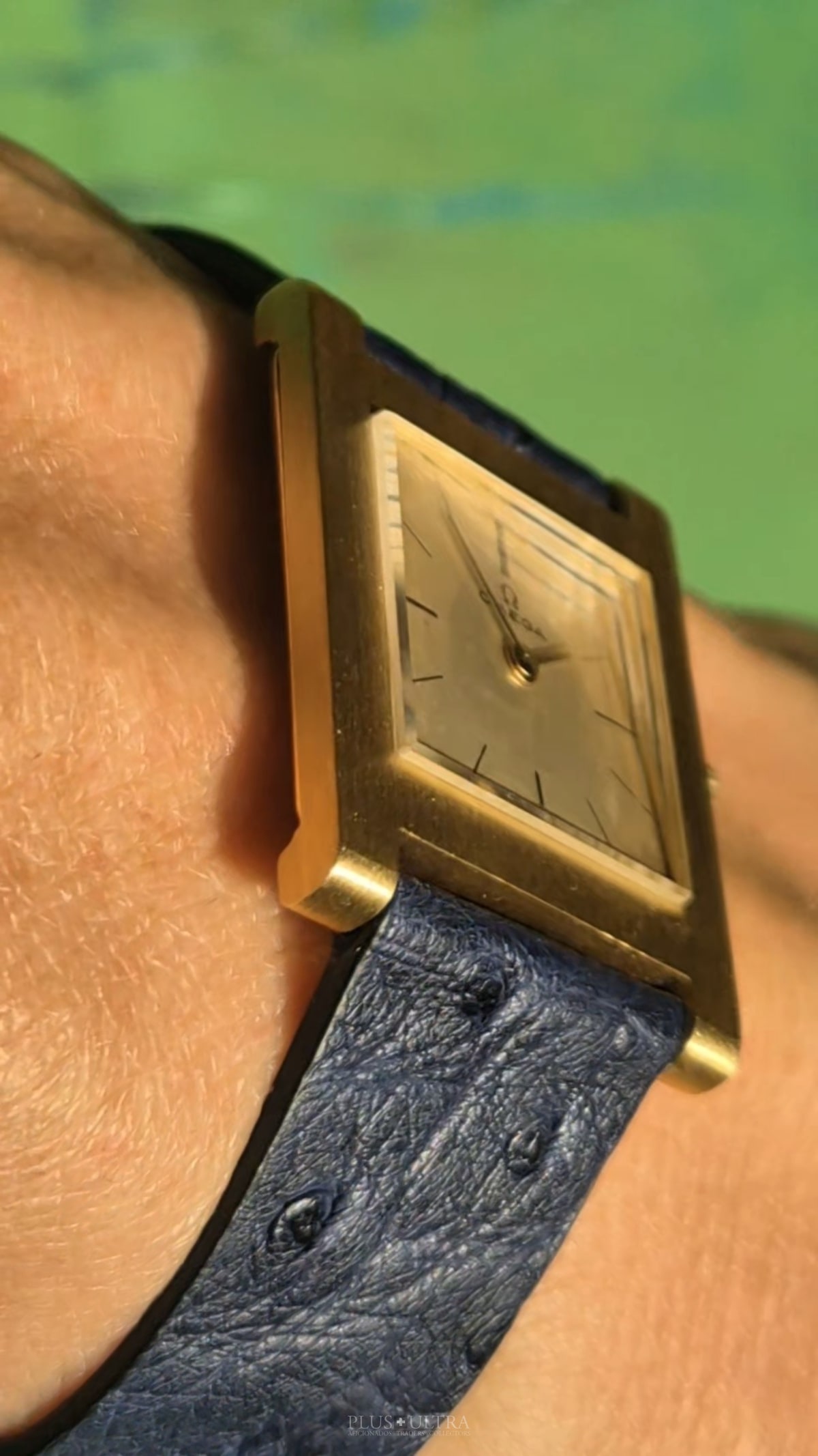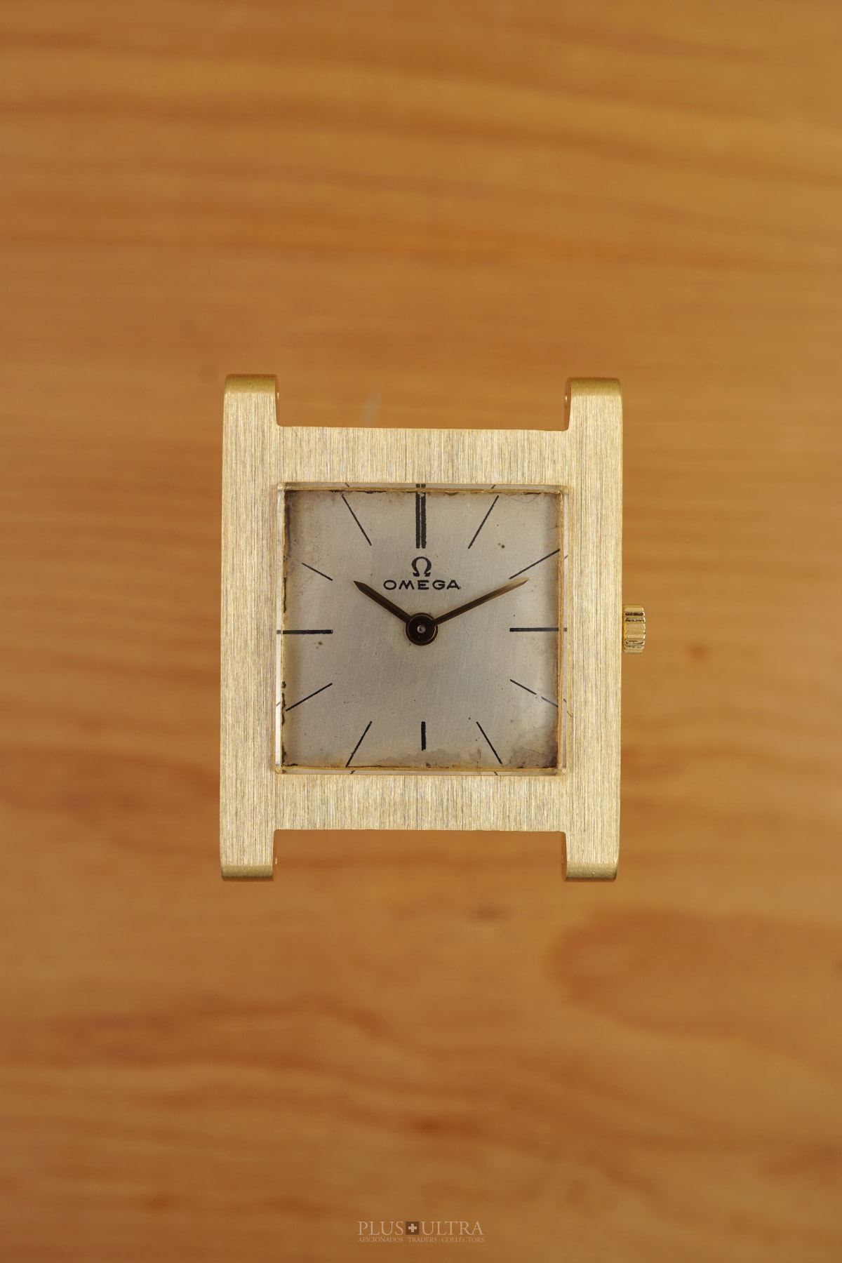 The watch was (approx) made in 1960 and serviced by Omega, Switzerland in Sep-2025. The beautiful geometric case (18K-yellowgold and made by Wenger SA, Geneve for Omega) is sharp and measures 25*32mm and is just a hairline thicker than 4mm -- incl crystal, of course. The dial was left in its vintage and very aesthetic condition and explicitly not refreshed / refurbished during the service -- and I think for a good reason: very authentic and a stark contrast to the now like-new case it is a aesthetically very appealing watch, now. The partial service by Omega included a full-serice of the movement, replacement of the crystal and refreshment of the 18K-yellowgold case.