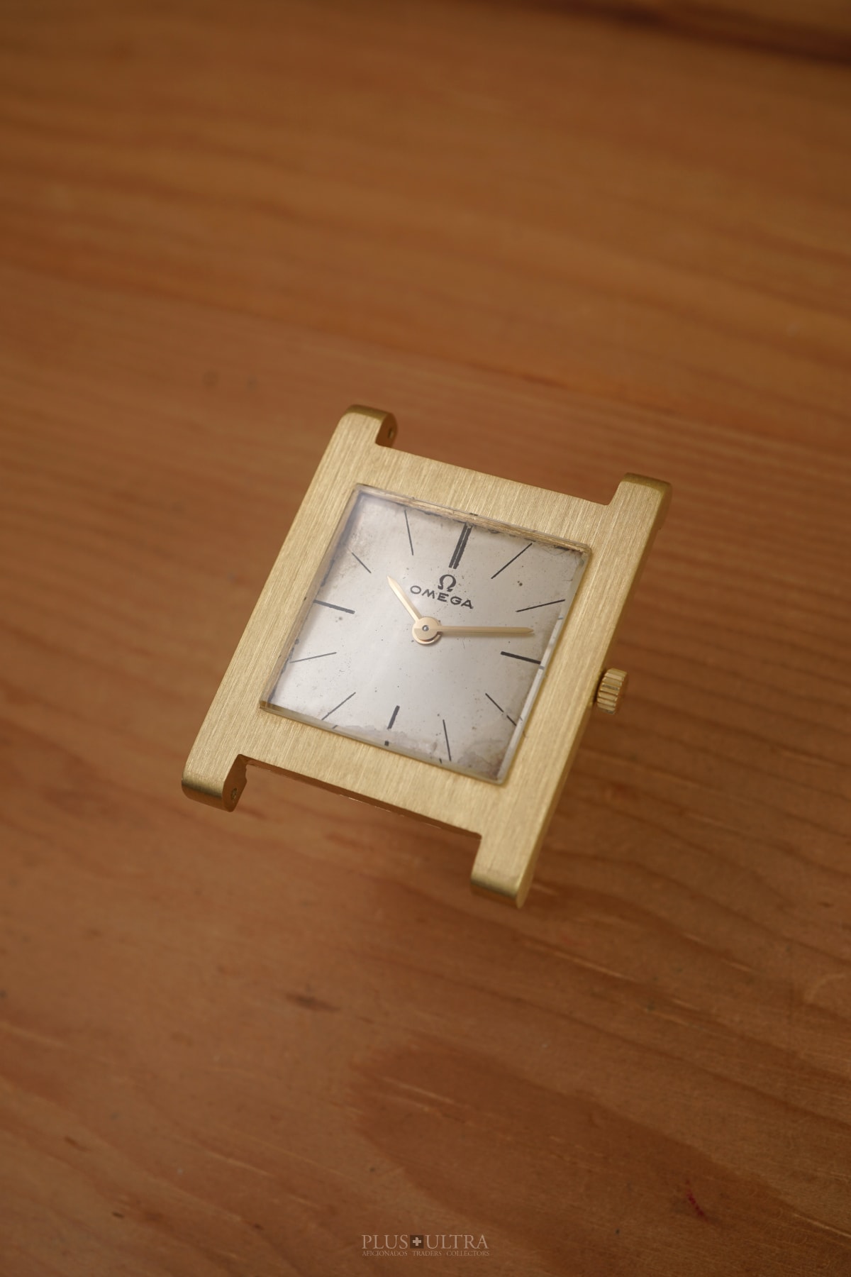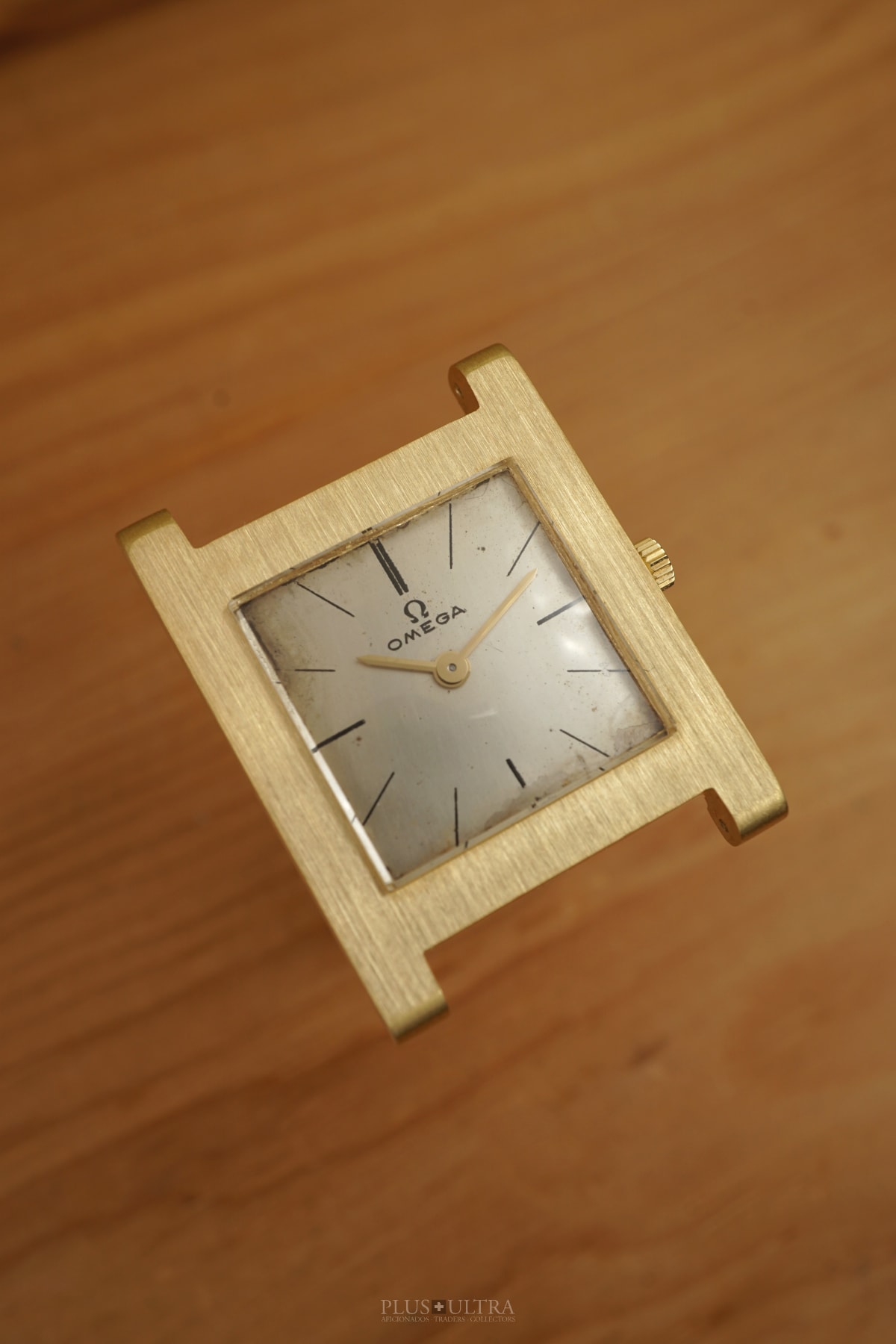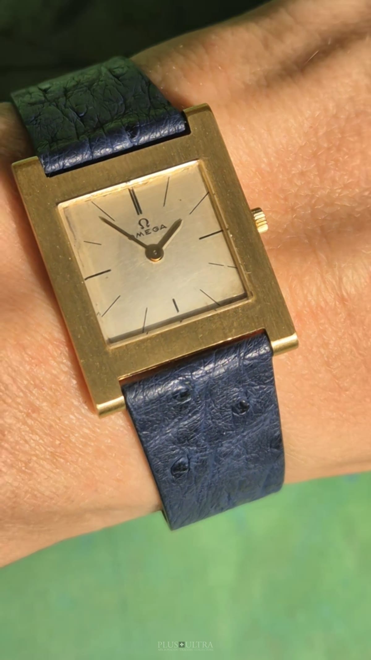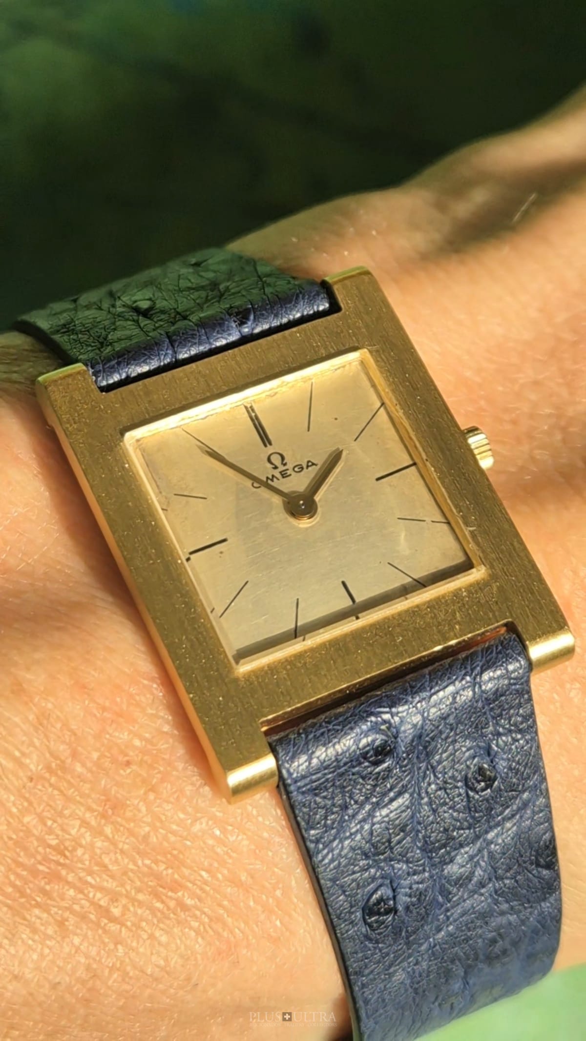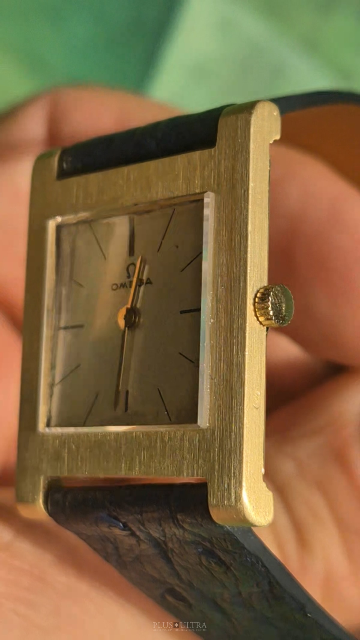 The watch was (approx) made in 1960 and serviced by Omega, Switzerland in Sep-2025. The beautiful geometric case (18K-yellowgold and made by Wenger SA, Geneve for Omega) is sharp and measures 25*32mm and is just a hairline thicker than 4mm -- incl crystal, of course. The dial was left in its vintage and very aesthetic condition and explicitly not refreshed / refurbished during the service -- and I think for a good reason: very authentic and a stark contrast to the now like-new case it is a aesthetically very appealing watch, now. The partial service by Omega included a full-serice of the movement, replacement of the crystal and refreshment of the 18K-yellowgold case.