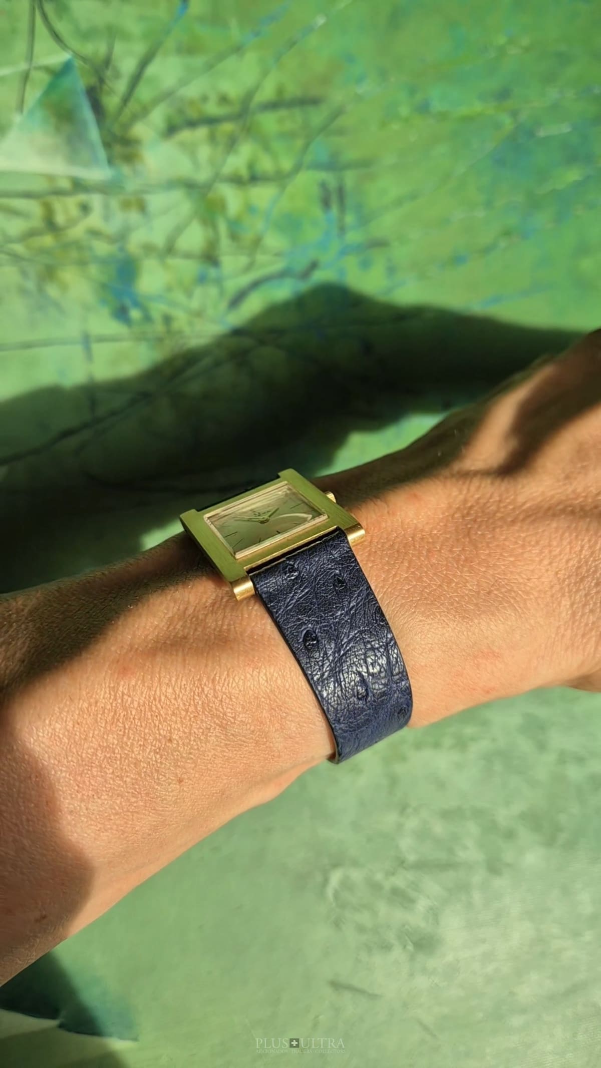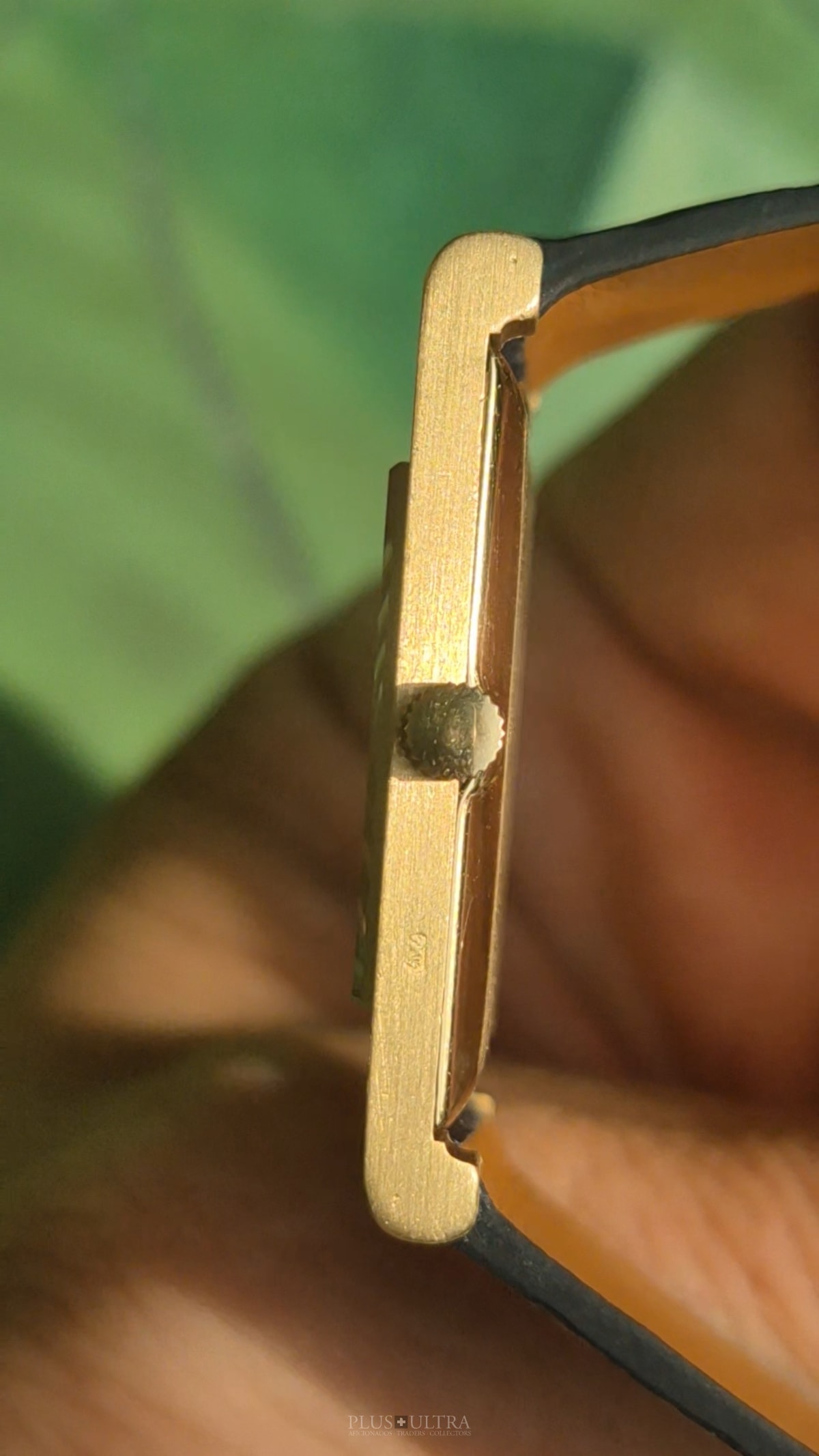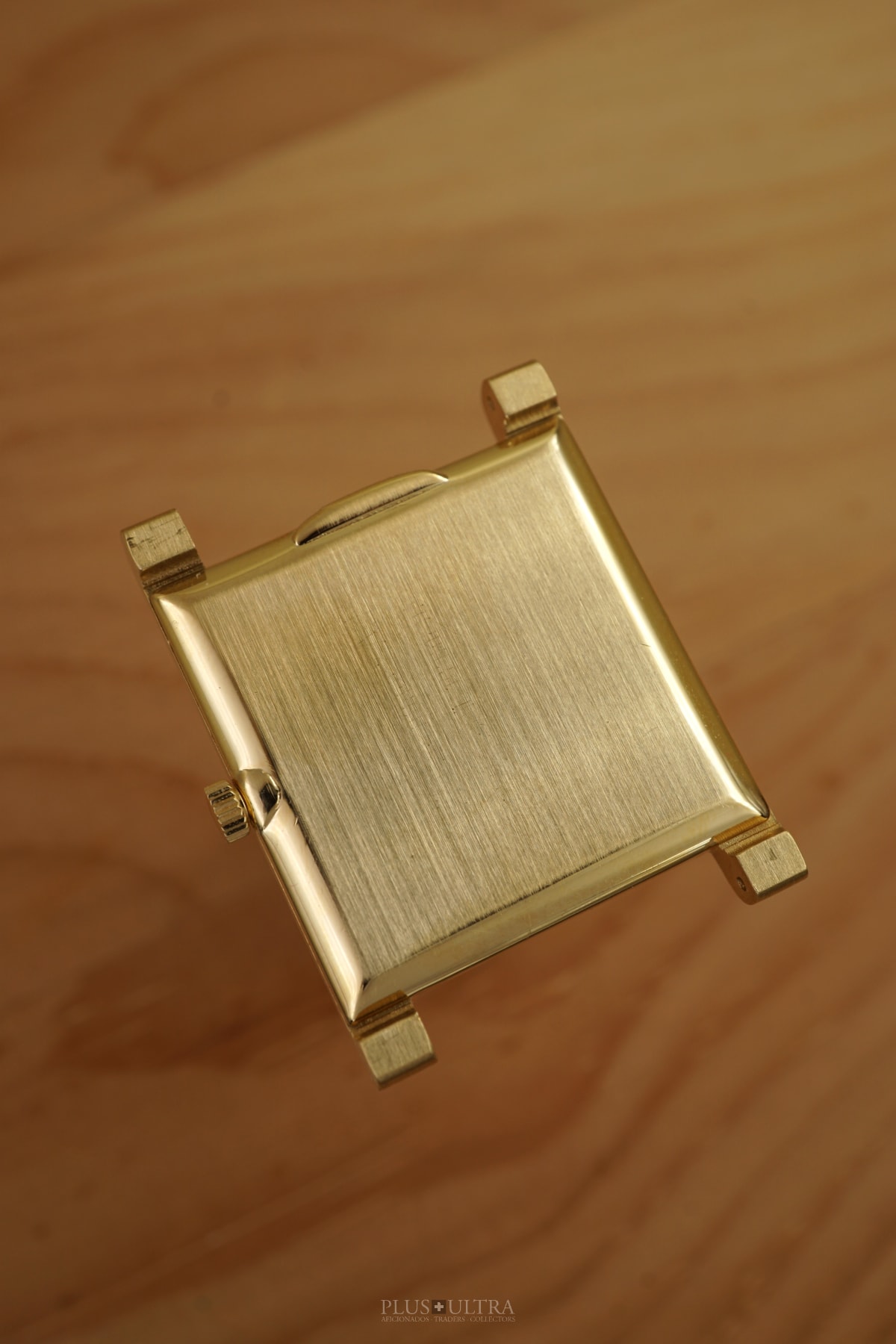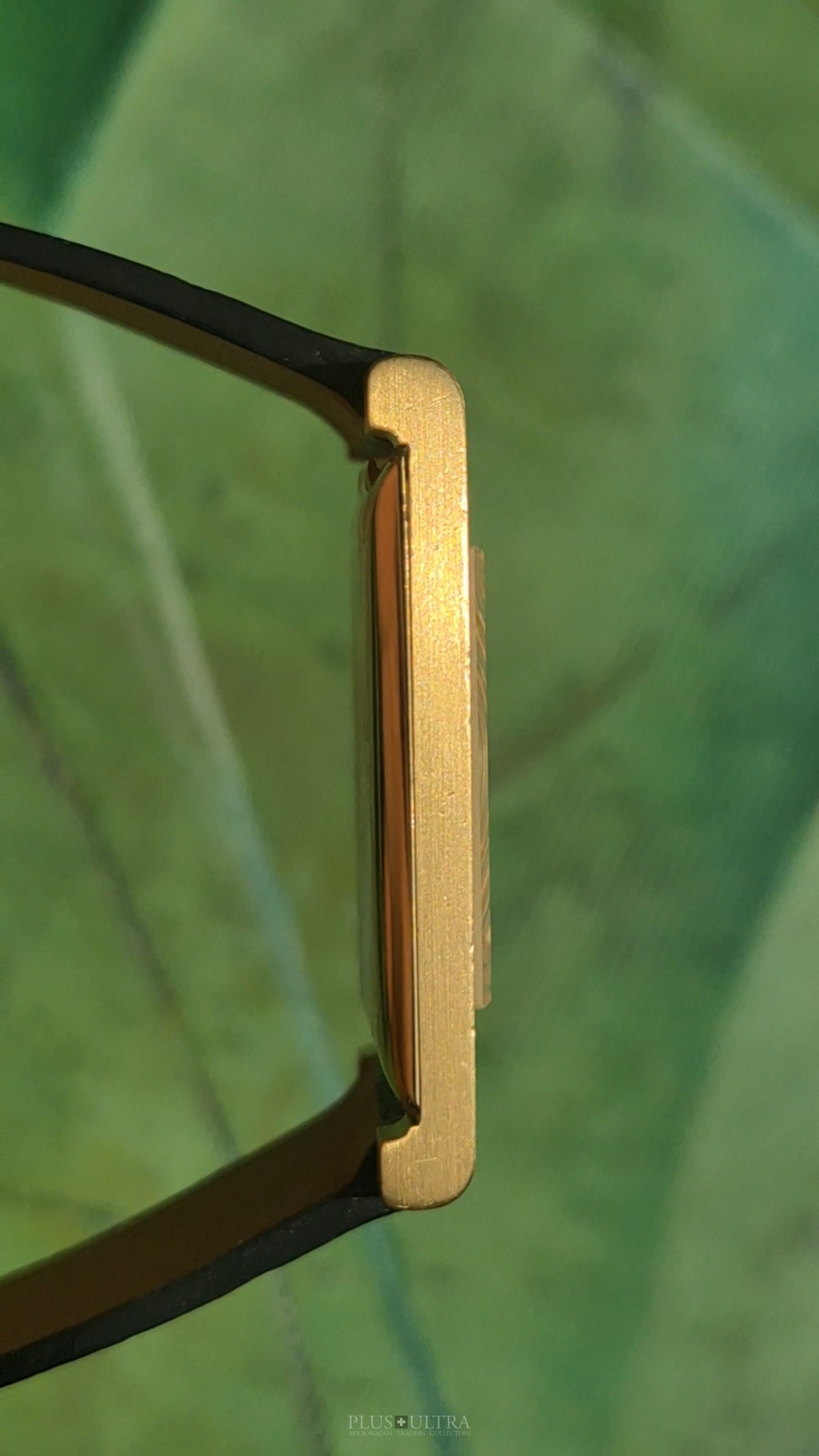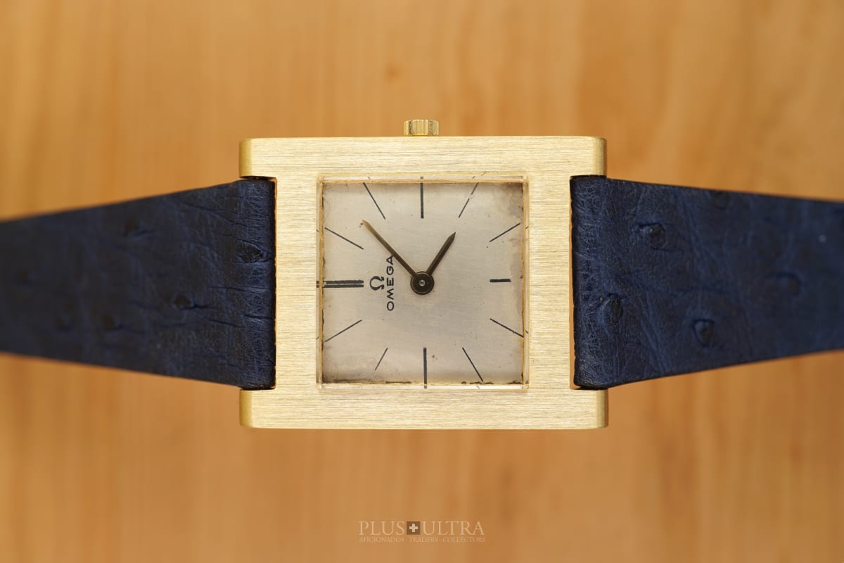 The watch was (approx) made in 1960 and serviced by Omega, Switzerland in Sep-2025. The beautiful geometric case (18K-yellowgold and made by Wenger SA, Geneve for Omega) is sharp and measures 25*32mm and is just a hairline thicker than 4mm -- incl crystal, of course. The dial was left in its vintage and very aesthetic condition and explicitly not refreshed / refurbished during the service -- and I think for a good reason: very authentic and a stark contrast to the now like-new case it is a aesthetically very appealing watch, now. The partial service by Omega included a full-serice of the movement, replacement of the crystal and refreshment of the 18K-yellowgold case.