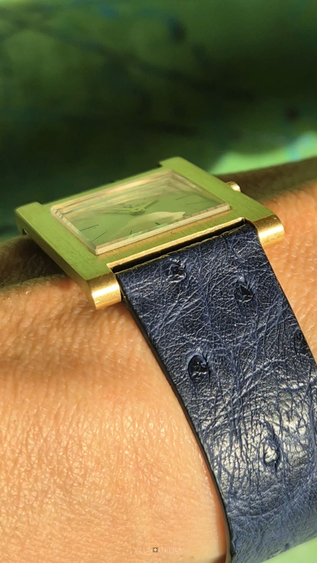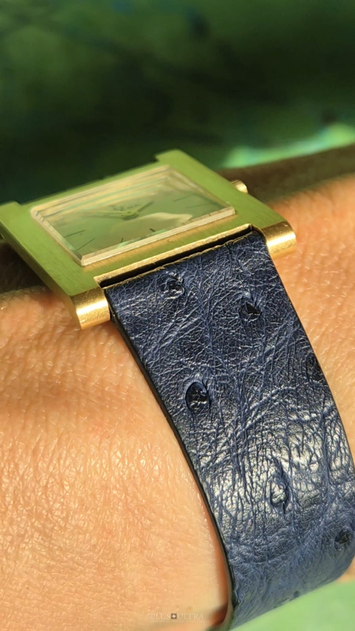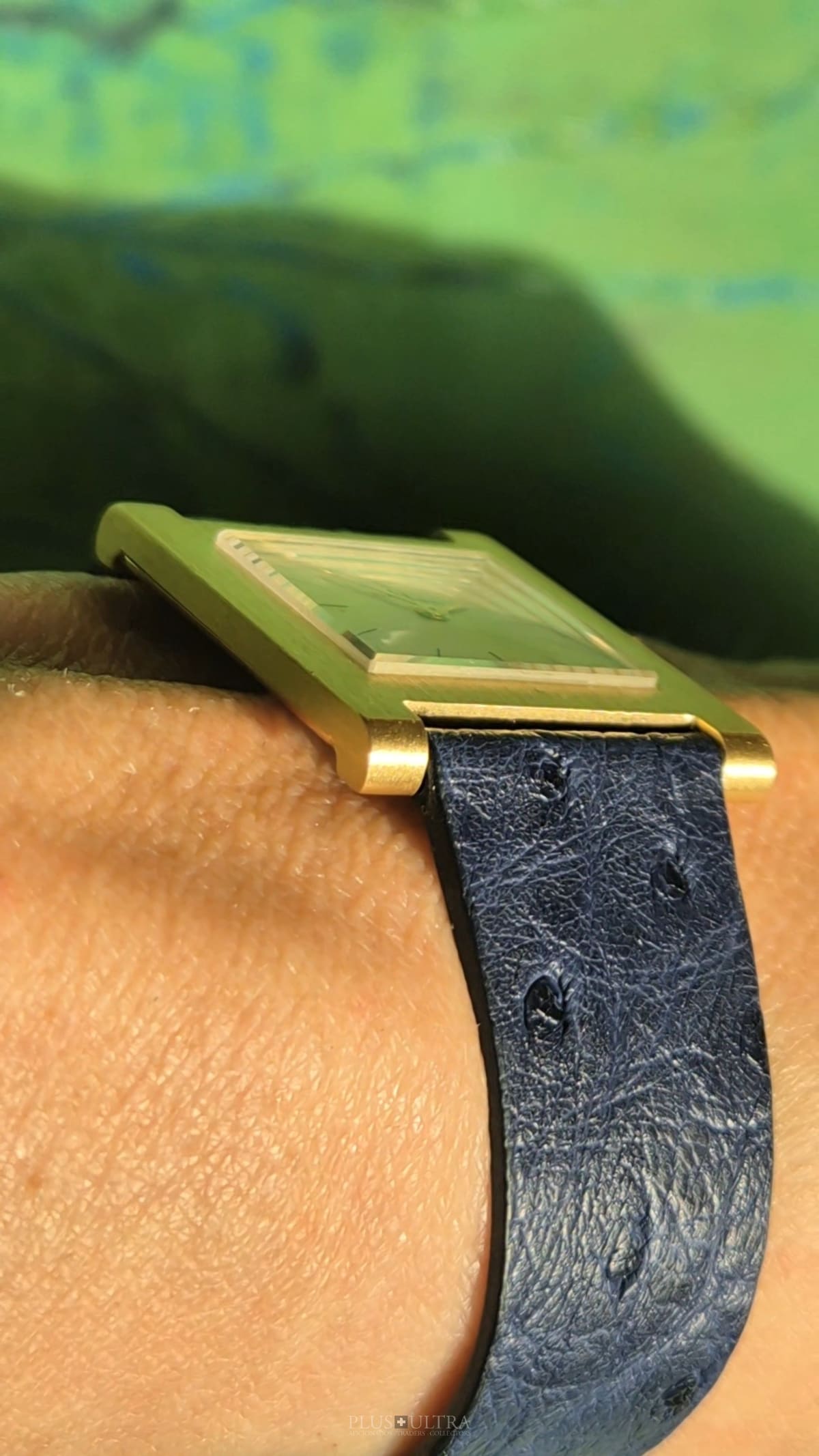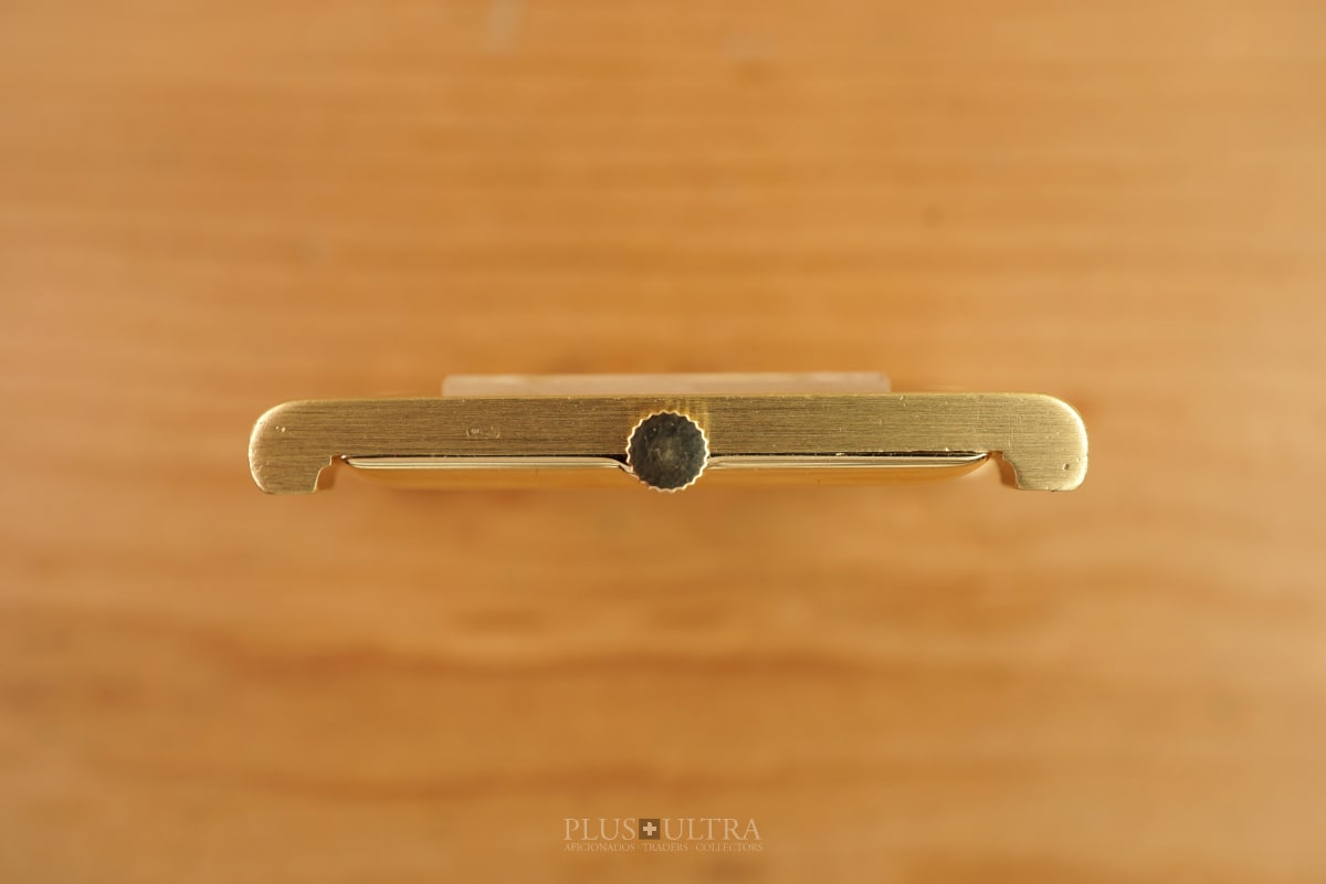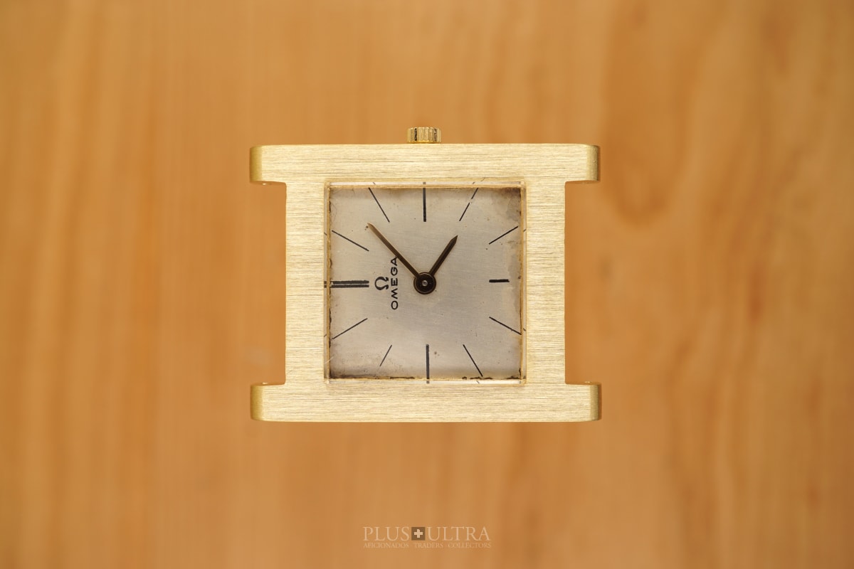 The watch was (approx) made in 1960 and serviced by Omega, Switzerland in Sep-2025. The beautiful geometric case (18K-yellowgold and made by Wenger SA, Geneve for Omega) is sharp and measures 25*32mm and is just a hairline thicker than 4mm -- incl crystal, of course. The dial was left in its vintage and very aesthetic condition and explicitly not refreshed / refurbished during the service -- and I think for a good reason: very authentic and a stark contrast to the now like-new case it is a aesthetically very appealing watch, now. The partial service by Omega included a full-serice of the movement, replacement of the crystal and refreshment of the 18K-yellowgold case.
