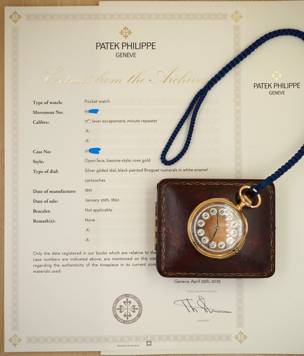 Important to know: this is NOT (!) a later cased minute-repeater movement or even just a Patek-movement delivered to a jeweler and encased in a non-Patek case (visible when you see a Excerpt of Patek-Archive with just a movement- and no case-number). No. This special and outstanding pocketwatch was made in all aspects by Patek Philippe in 1891 and sold in the following year (1892) as the Excerpt of Patek-Archive shows. The non-branded dial without a disturbing and narrow-minded small-second is obviously something very unique and special, but when this dial is seen in the light one understands Pateks idea. From a time when not a big brand-print but the outstanding quality and the design proved it was made by the best: by Patek Philippe.