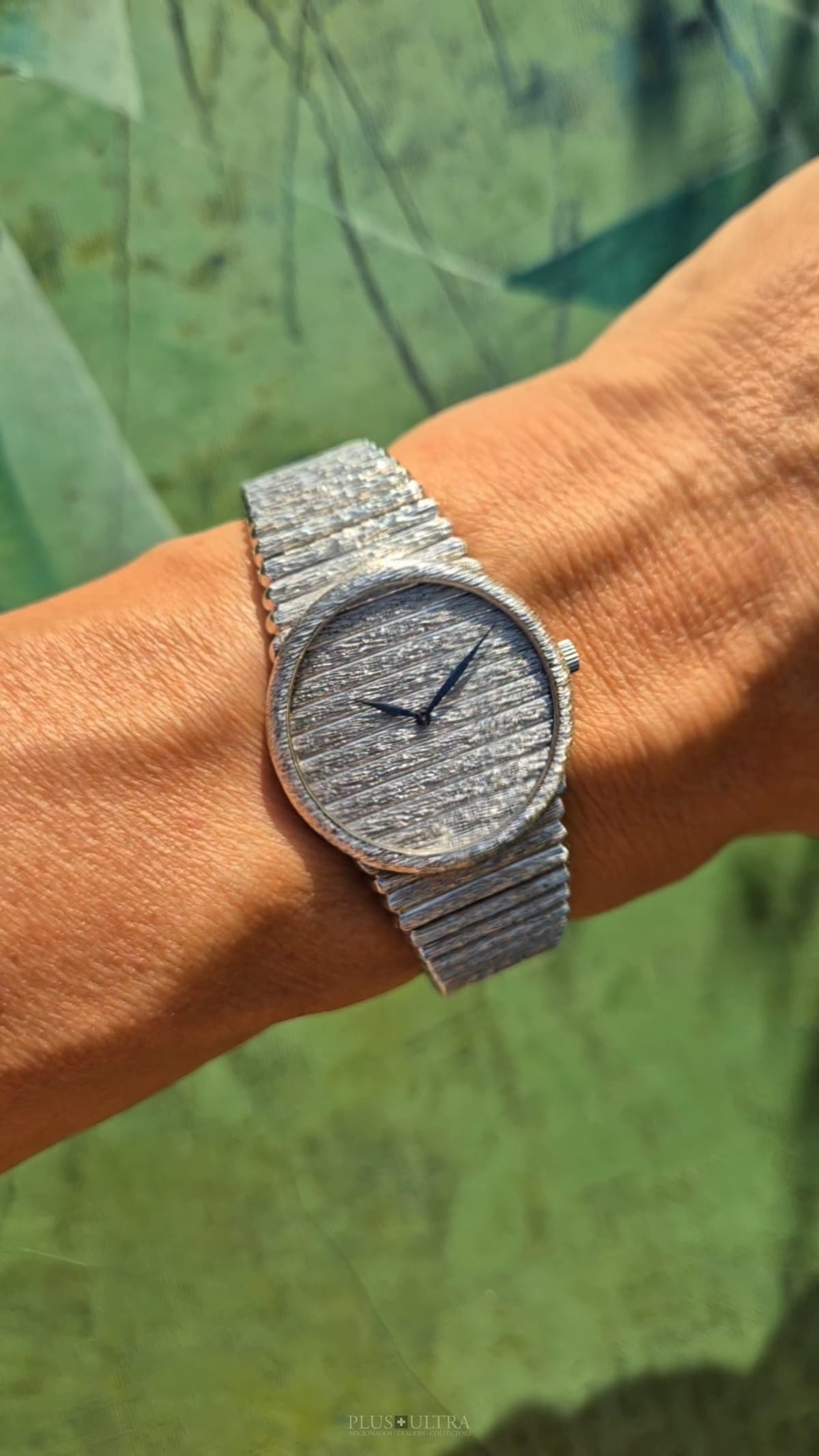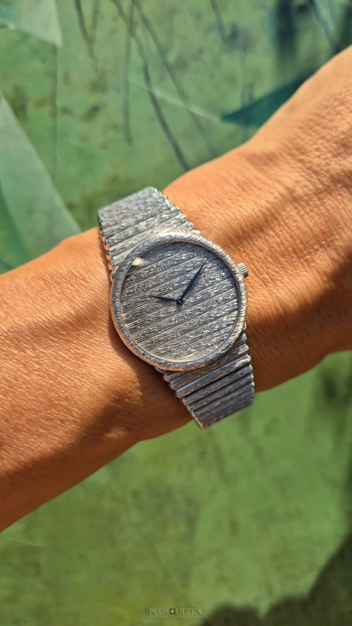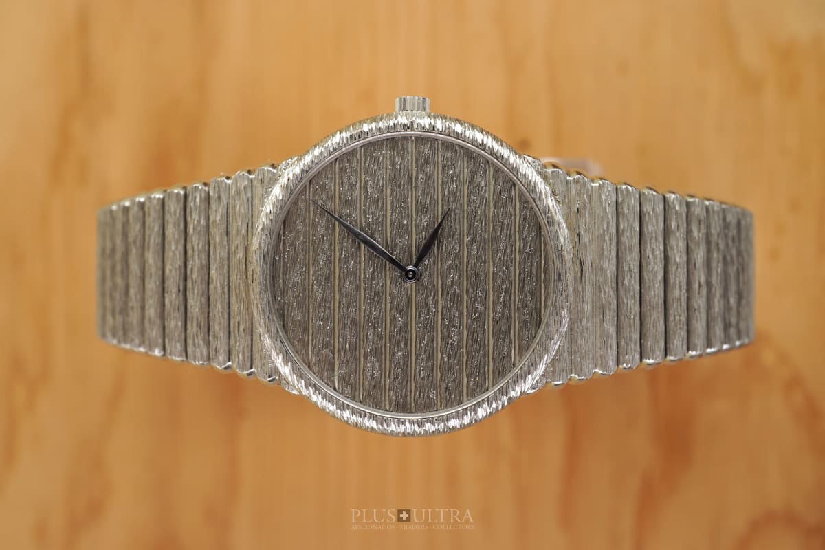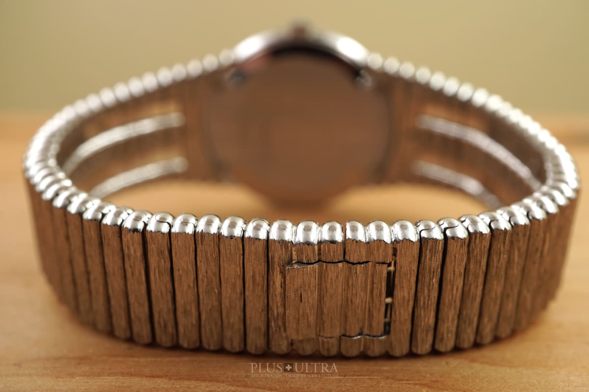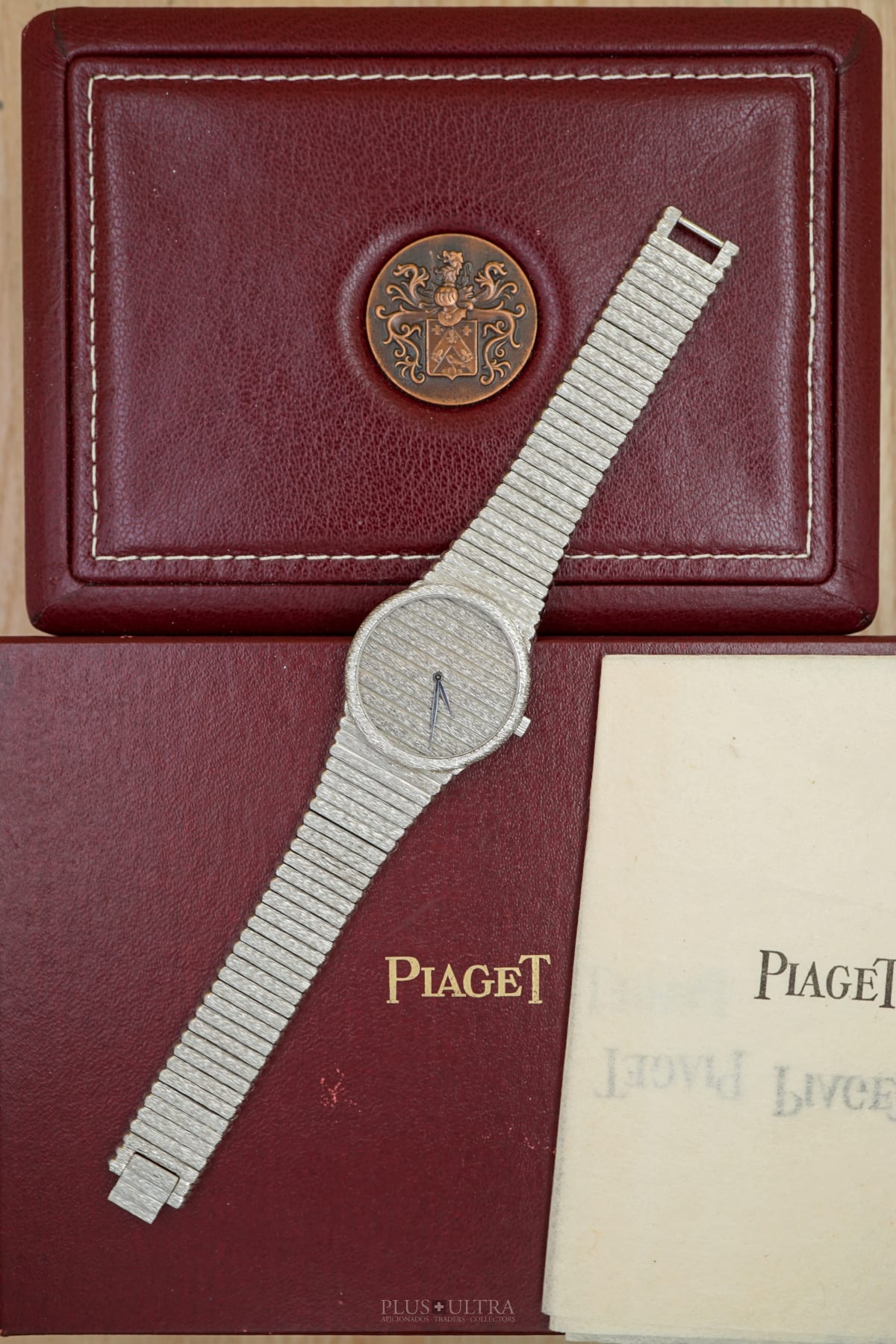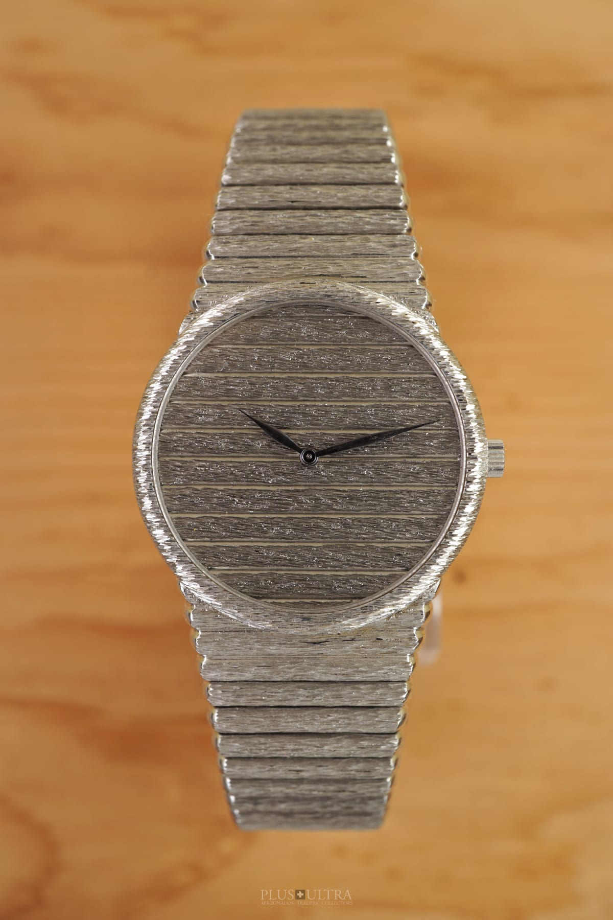 The Ponti Gennari- / Piaget-Signature-Finishing on a round (31.5mm) and rare Emperador -- rare in general but exceedingly rare in heavy 18K-whitegold. This special watch was made in 1977 by Piaget and runs on the manual cal9P. Needless to point out it is the predecessor of the celebrated and iconic Piaget Polo that was presented in 1979 -- and both were designed by Jean-Claude Gueit for Piaget. And both use the same bracelet-system, although the Polo has every 2nd link elongated to 6mm: so alternating between 3 and 6mm in the Piaget Polo instead of 3mm for every element as in the Piaget Emperor. Obviously, this watch is not only of higher quality than the iconic Polo as more work by goldsmith is necessary and the finishing is much more manufacturing by an artisan but it was also made in a much lower quantity -- we were informed that less than 20 pieces of this model were made. On top: instead of the round Polo 7661 (Jumbo) it uses a mechanical movement (not a quartz cal7P like the Polo), its case is a bit smaller in diameter but because its bracelet is more massive, it is even heavier than the Jumbo-Polo.