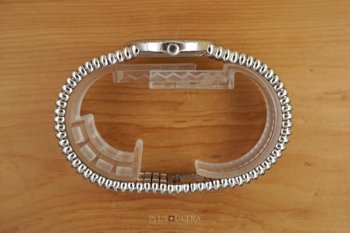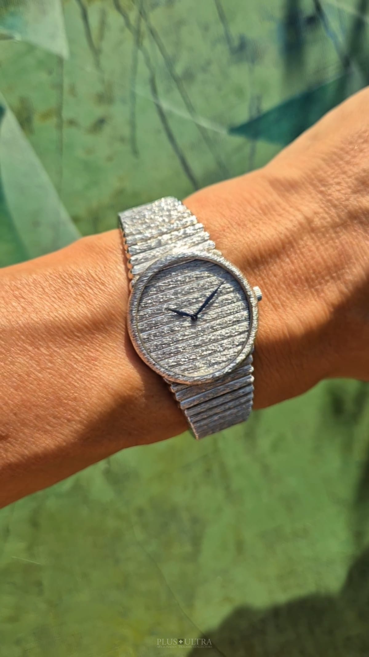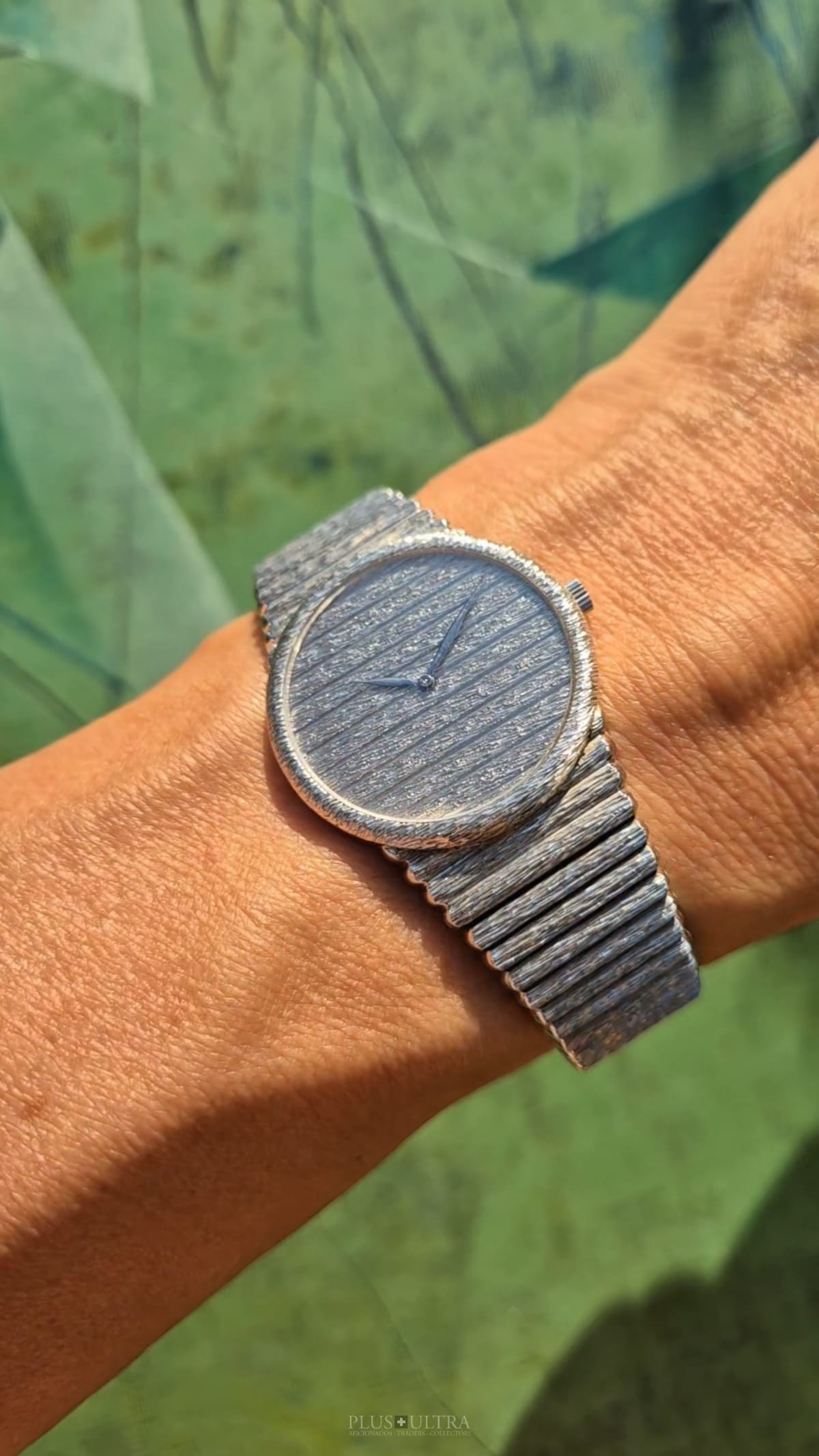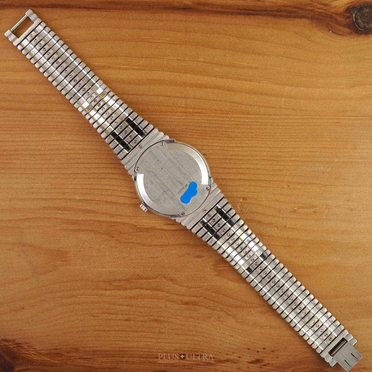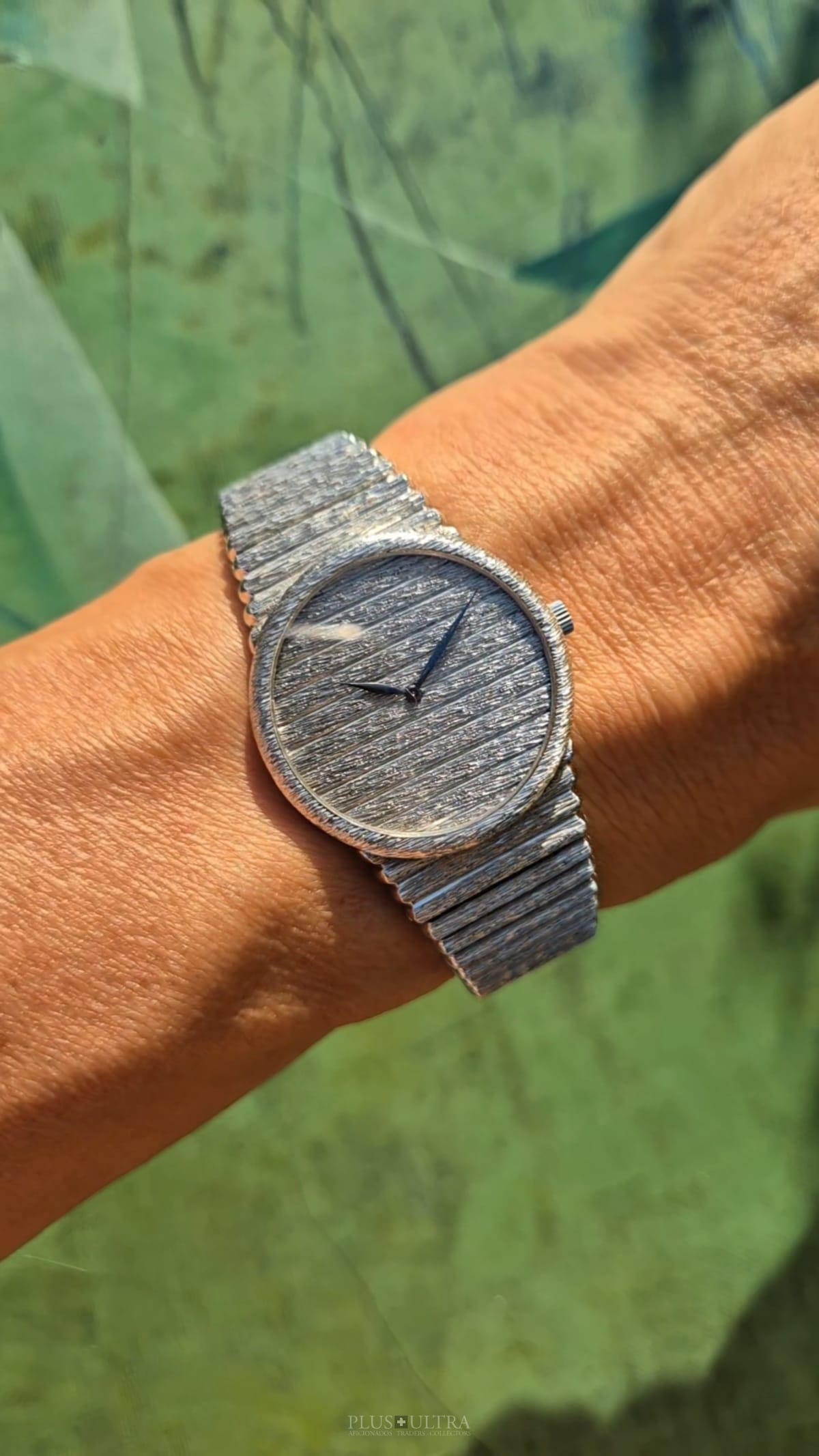 The Ponti Gennari- / Piaget-Signature-Finishing on a round (31.5mm) and rare Emperador -- rare in general but exceedingly rare in heavy 18K-whitegold. This special watch was made in 1977 by Piaget and runs on the manual cal9P. Needless to point out it is the predecessor of the celebrated and iconic Piaget Polo that was presented in 1979 -- and both were designed by Jean-Claude Gueit for Piaget. And both use the same bracelet-system, although the Polo has every 2nd link elongated to 6mm: so alternating between 3 and 6mm in the Piaget Polo instead of 3mm for every element as in the Piaget Emperor. Obviously, this watch is not only of higher quality than the iconic Polo as more work by goldsmith is necessary and the finishing is much more manufacturing by an artisan but it was also made in a much lower quantity -- we were informed that less than 20 pieces of this model were made. On top: instead of the round Polo 7661 (Jumbo) it uses a mechanical movement (not a quartz cal7P like the Polo), its case is a bit smaller in diameter but because its bracelet is more massive, it is even heavier than the Jumbo-Polo.
