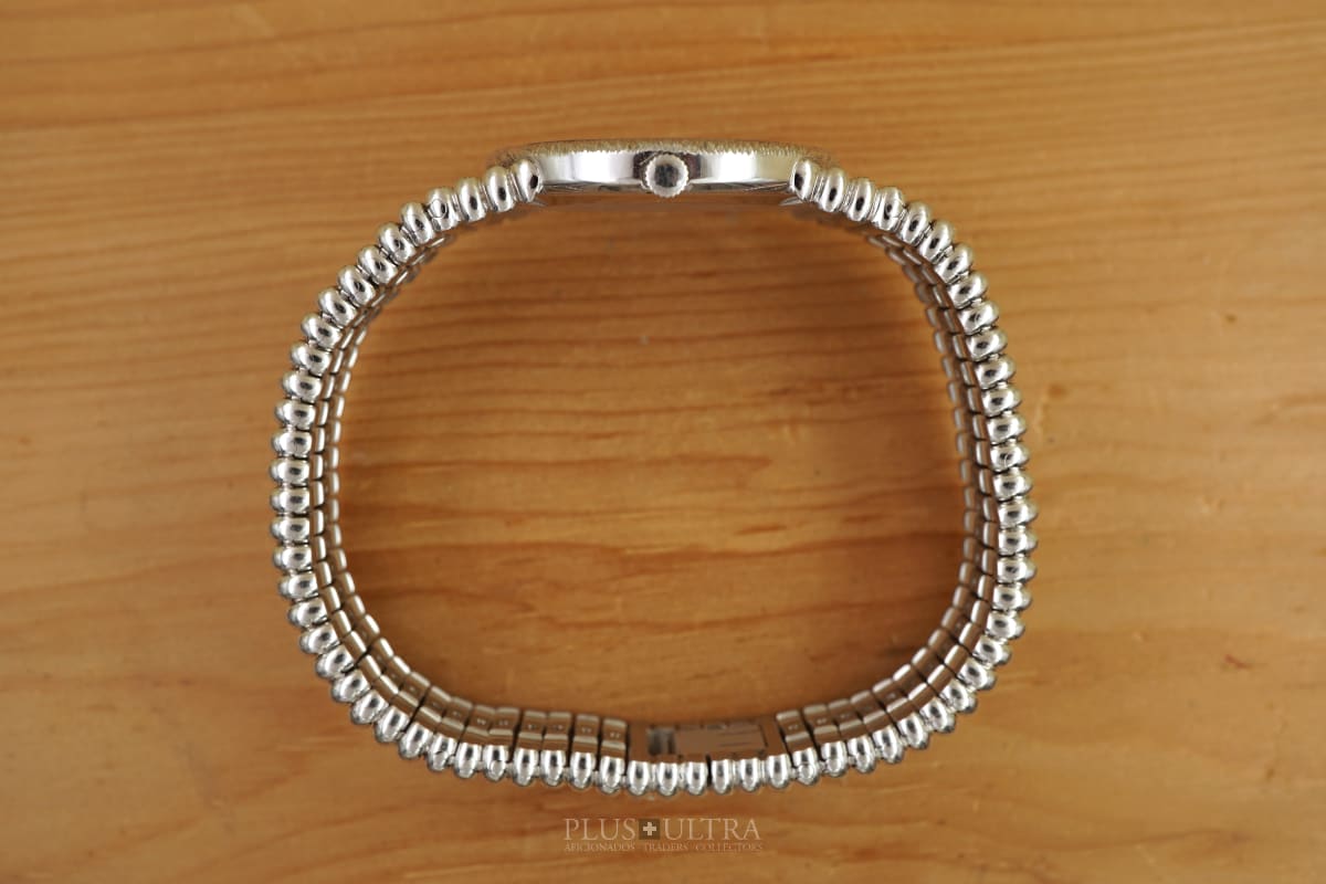 The serviced manual caliber Piaget 9P works precise and reliable and the watch appears to be beautiful and without stretch or significant signs of use and seems to be unpolished, also. The substantial weight of >150g, the length of >190mm in total (additional links could be sourced) and its condition make it a probably unique piece today.