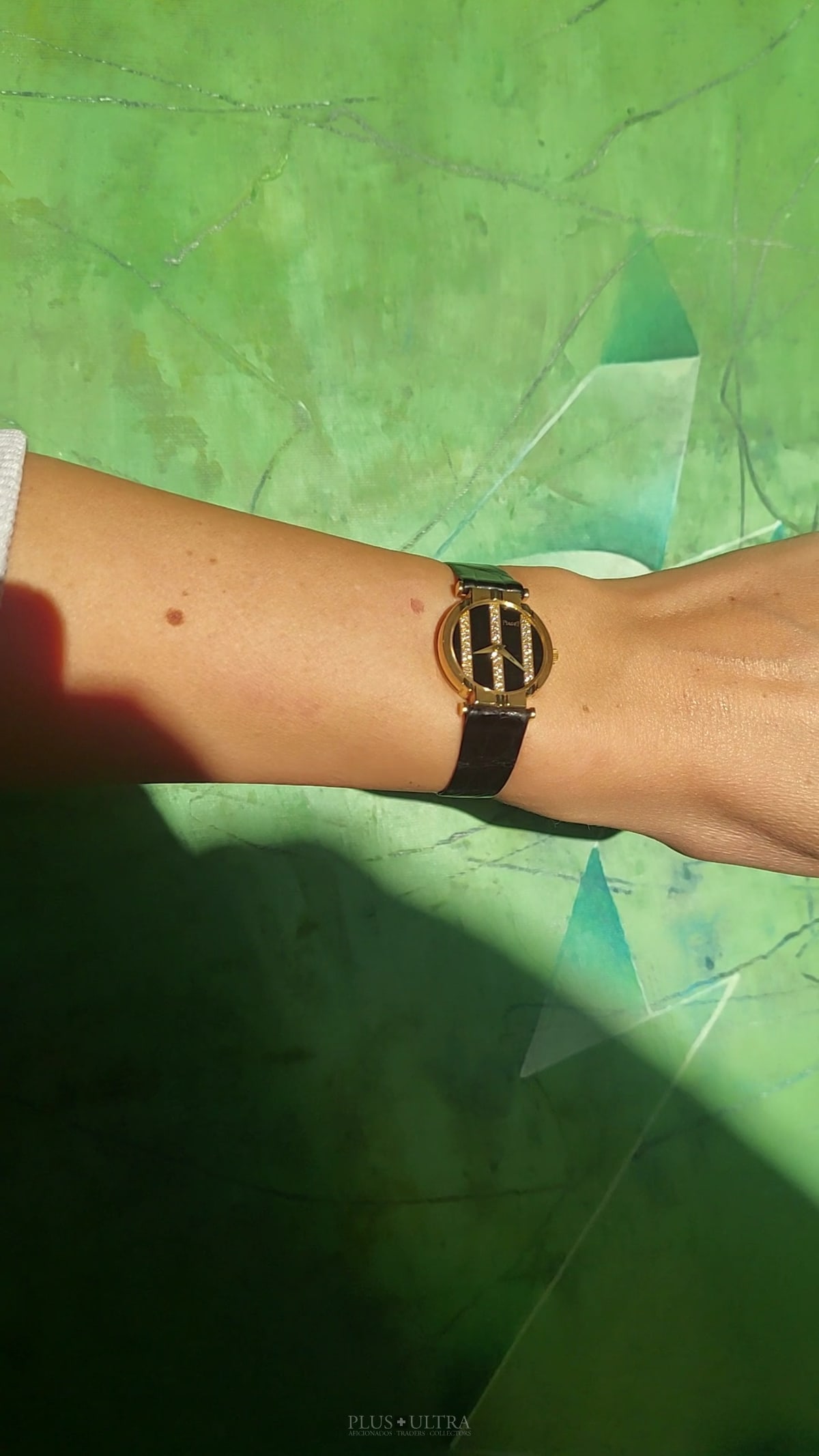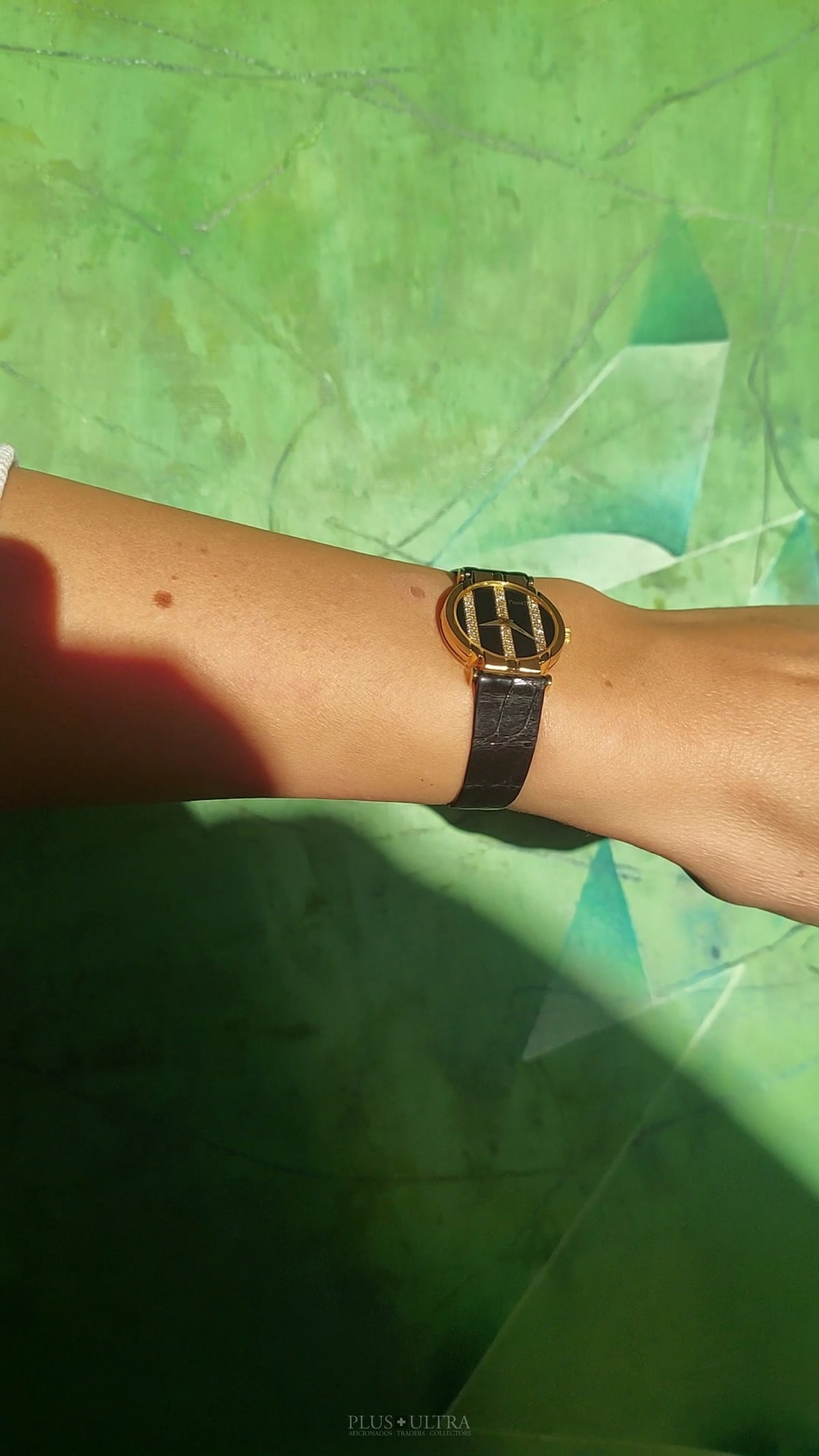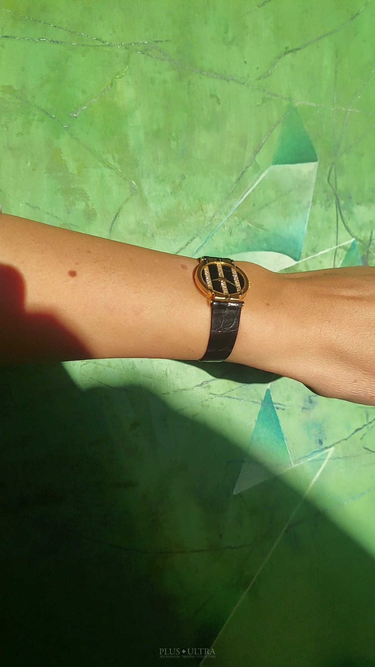 The very lavish and rare variant of the ladies Polo on a leather-strap (vertically striped) with 62 diamonds and onyx-stone on the dial.