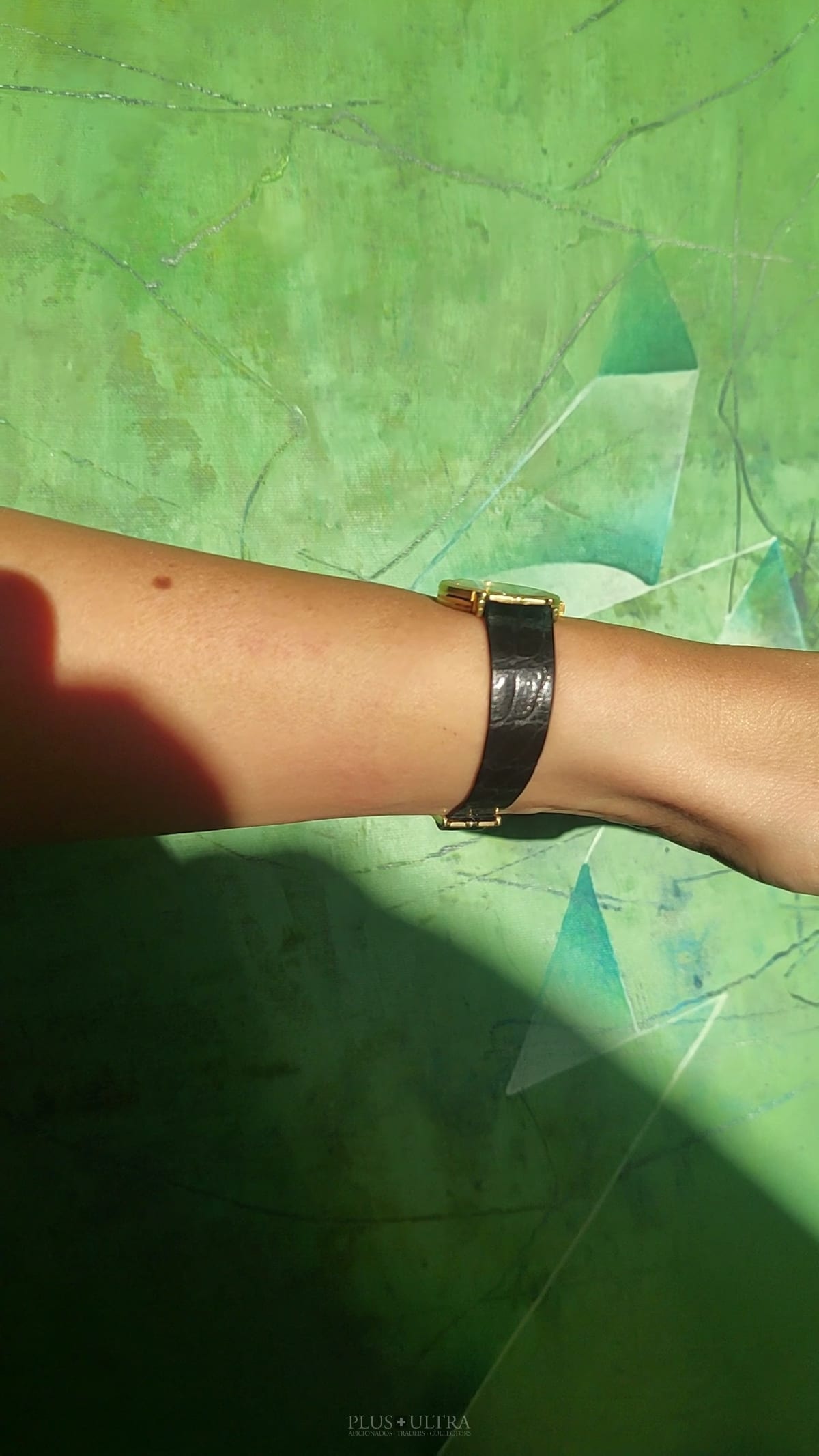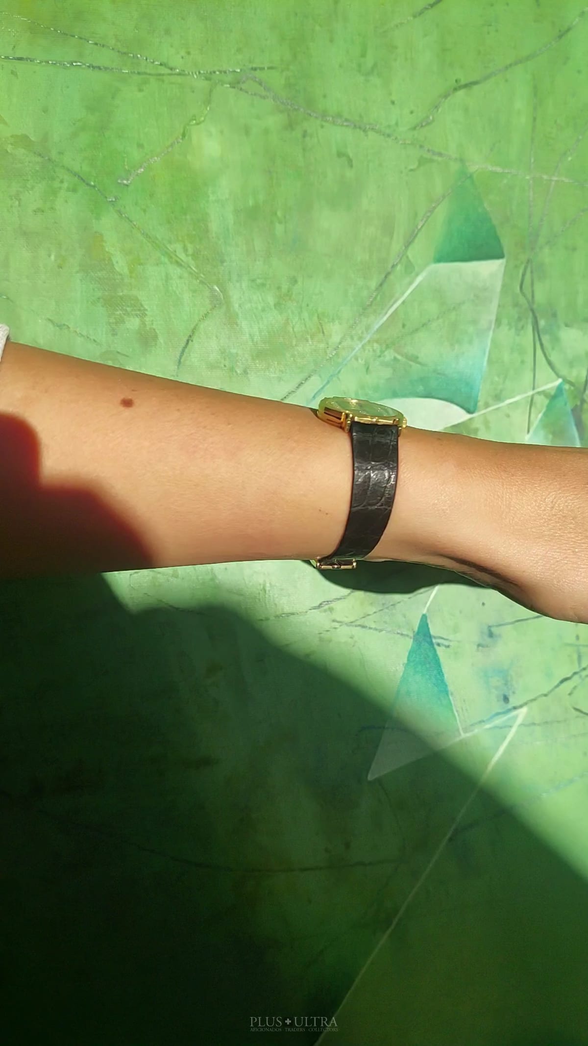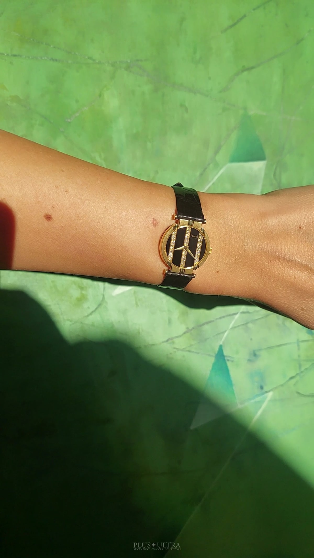 The very lavish and rare variant of the ladies Polo on a leather-strap (vertically striped) with 62 diamonds and onyx-stone on the dial.