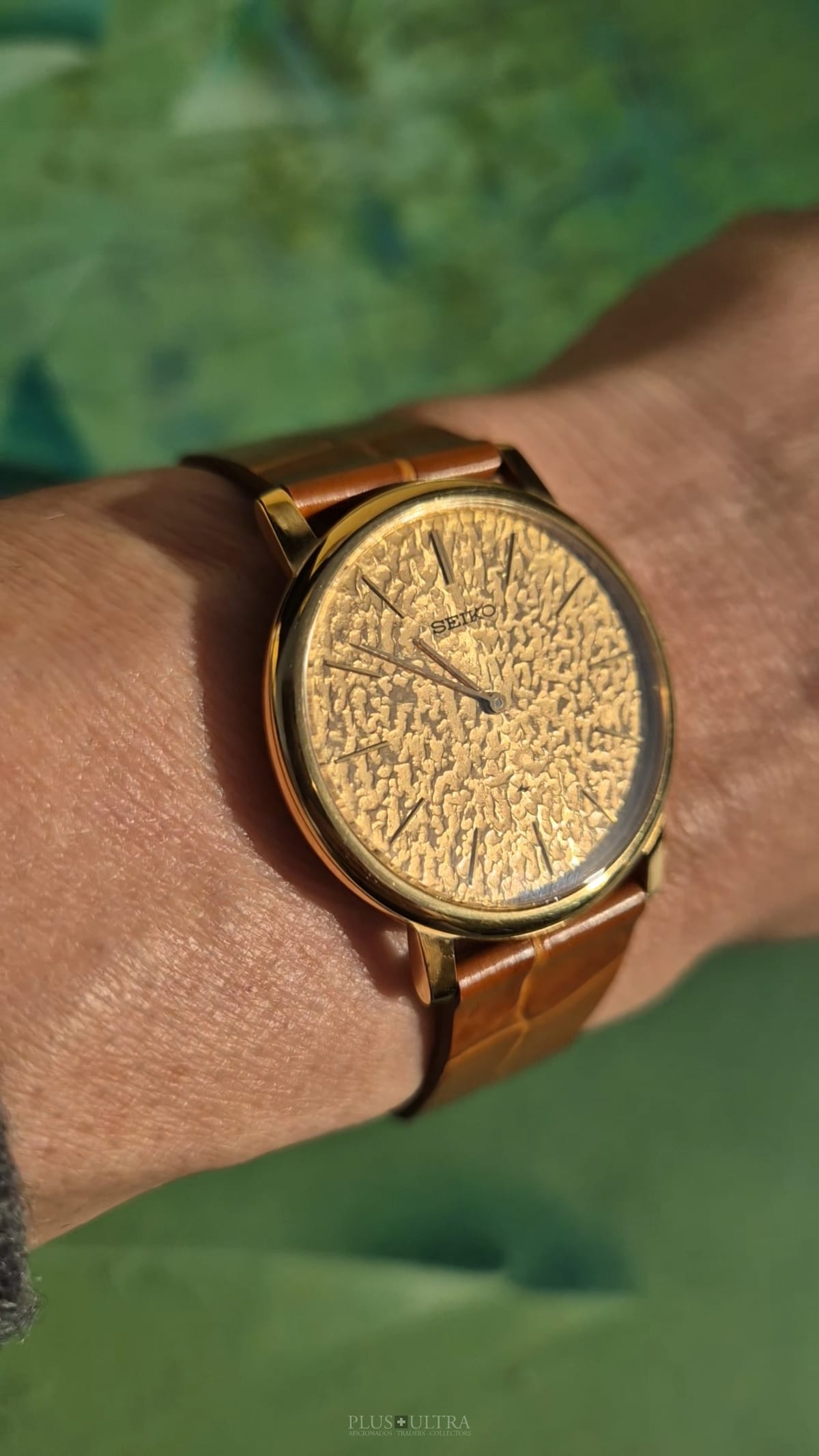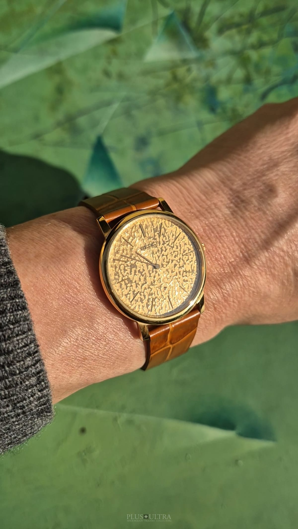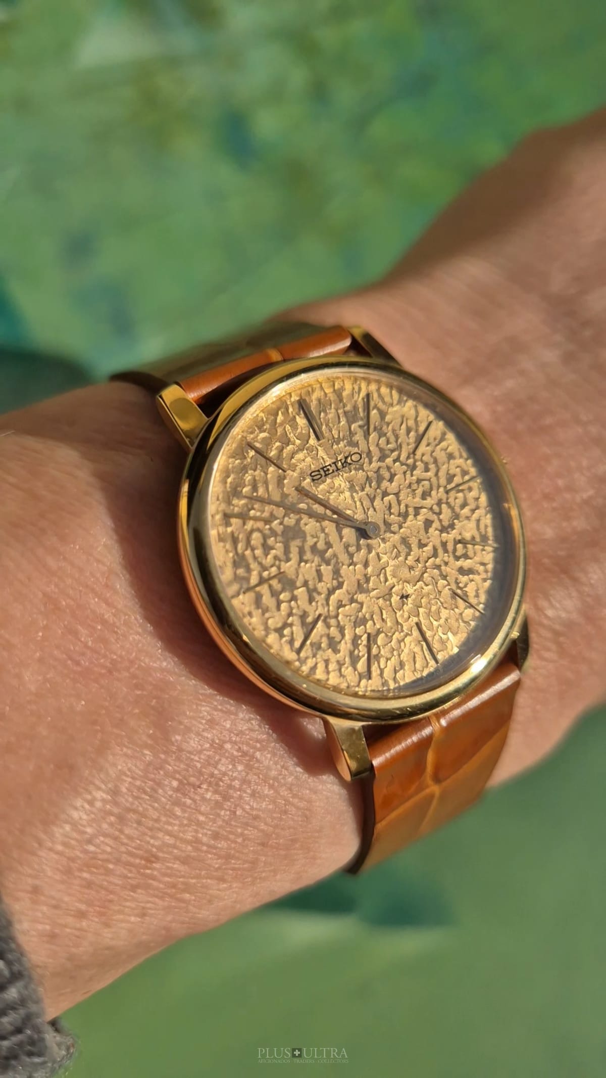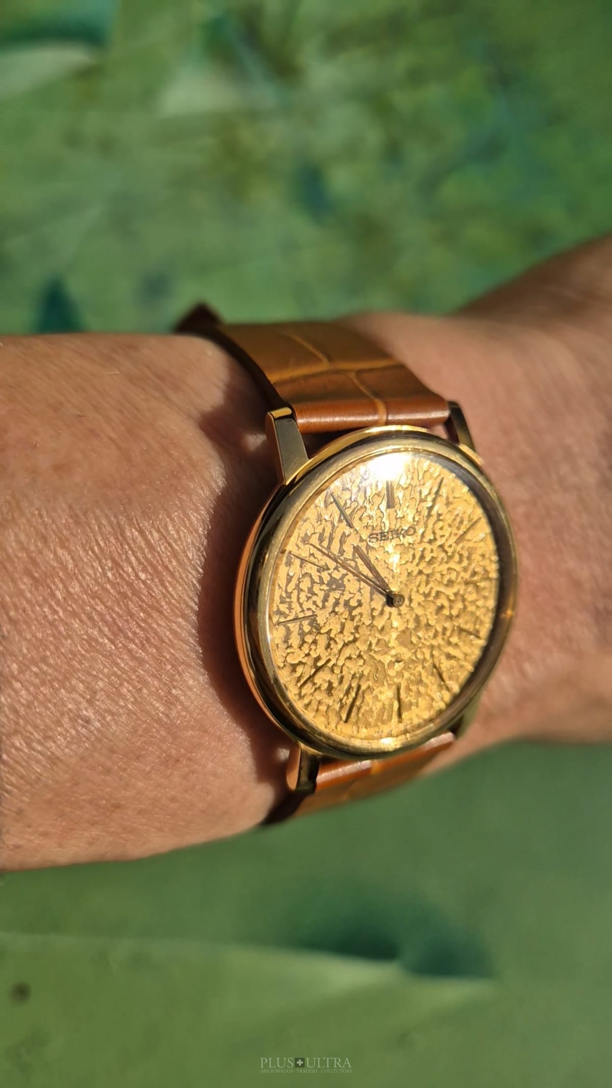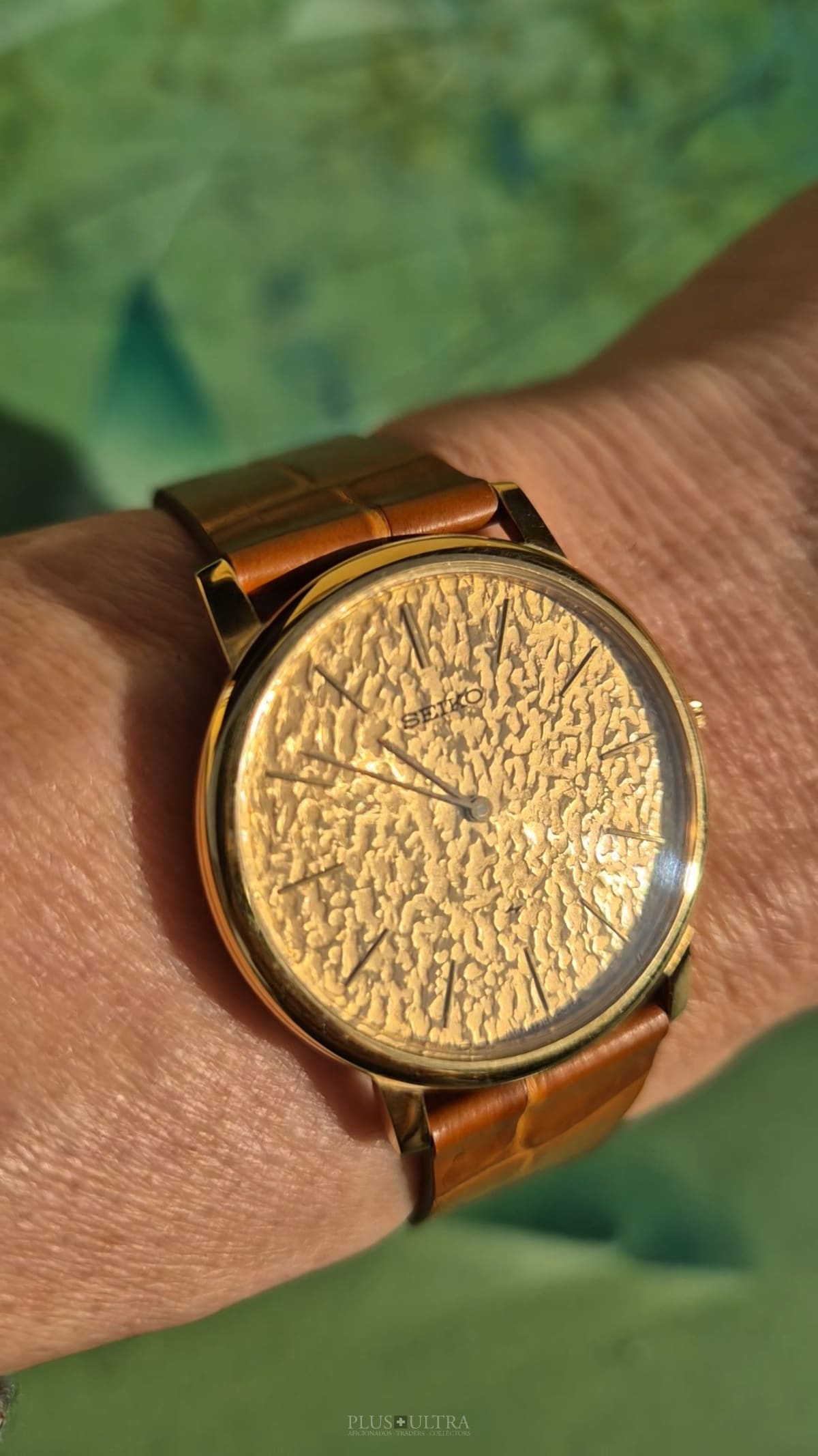 The golden dial with the naturalistic pattern is in very good condition and not only a joy to watch but also unobtrusively signed Seiko.