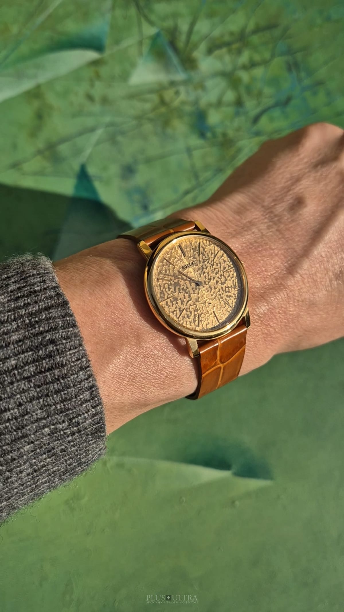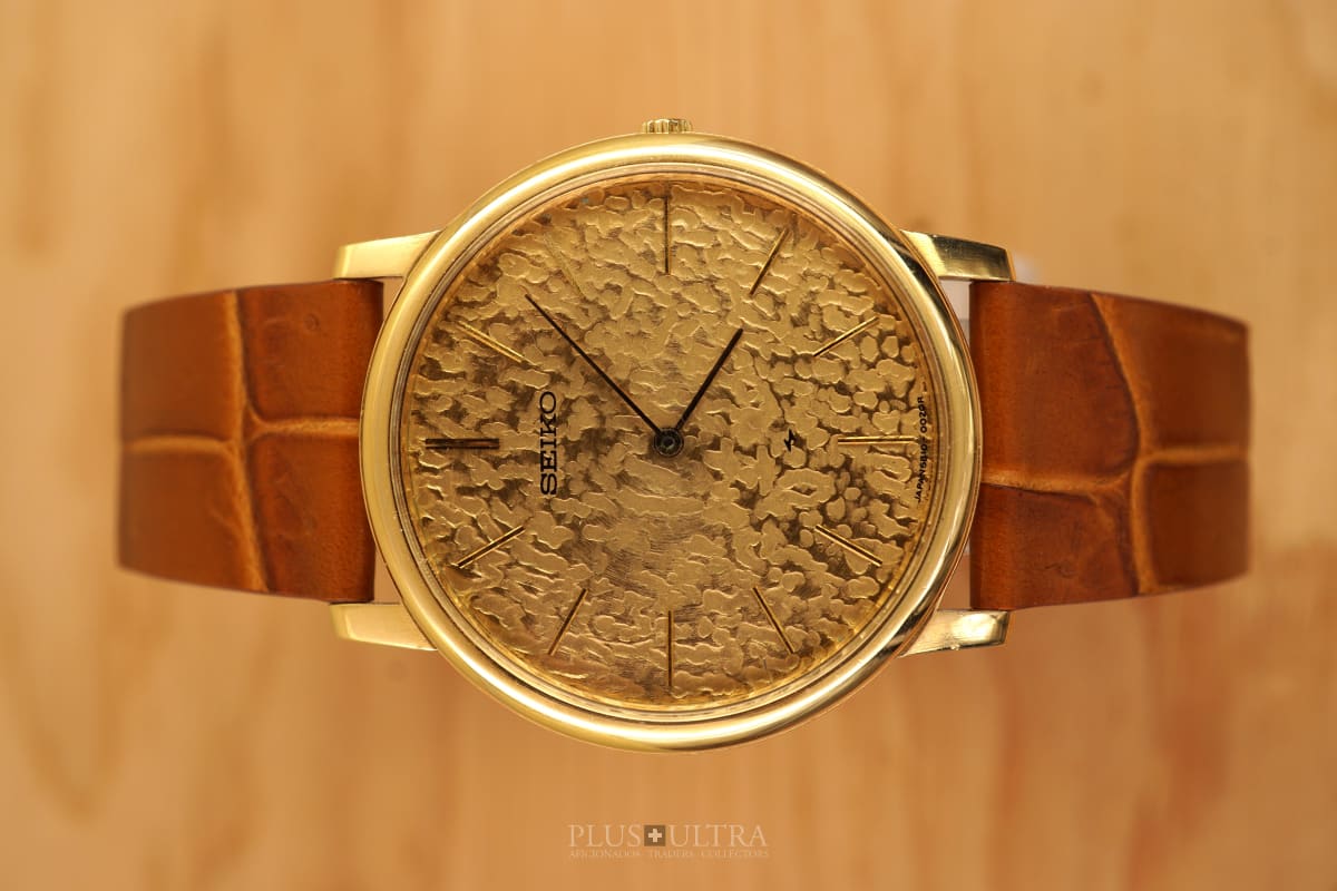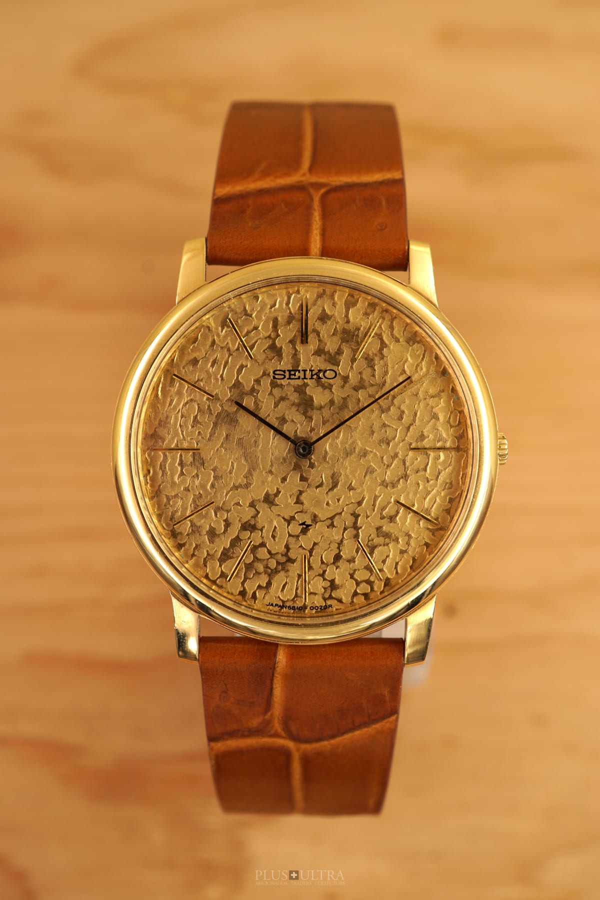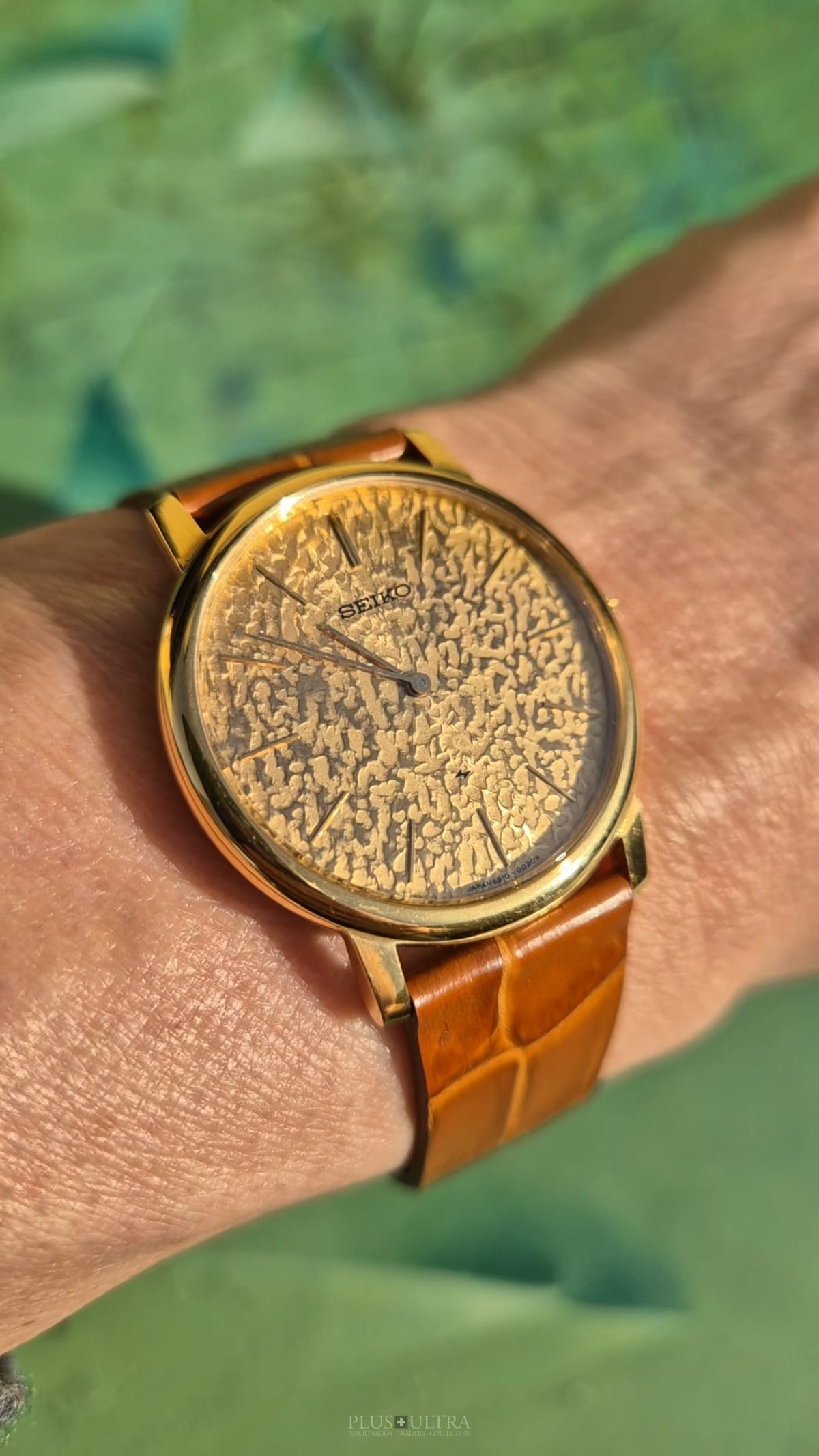 The golden dial with the naturalistic pattern is in very good condition and not only a joy to watch but also unobtrusively signed Seiko.