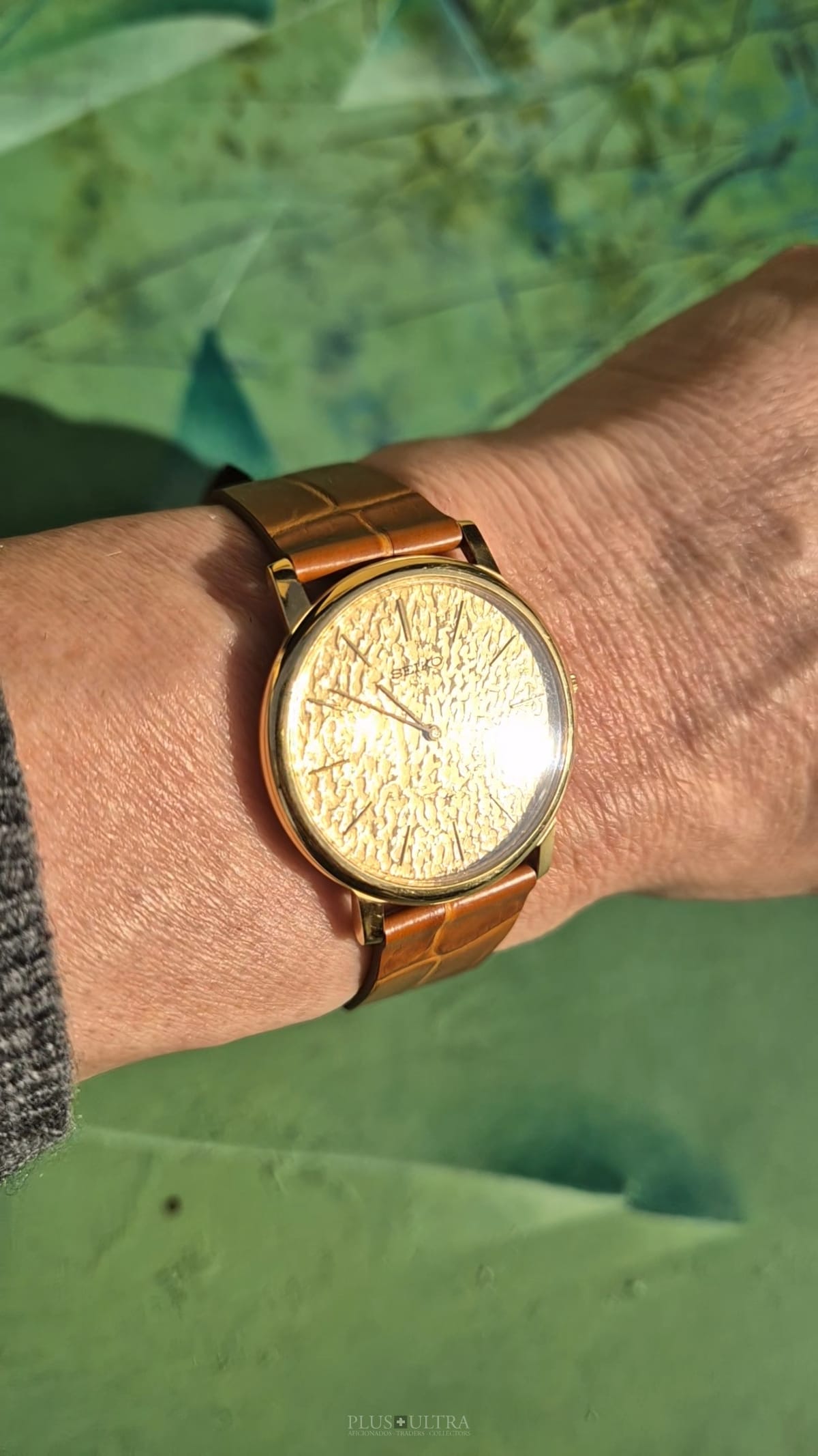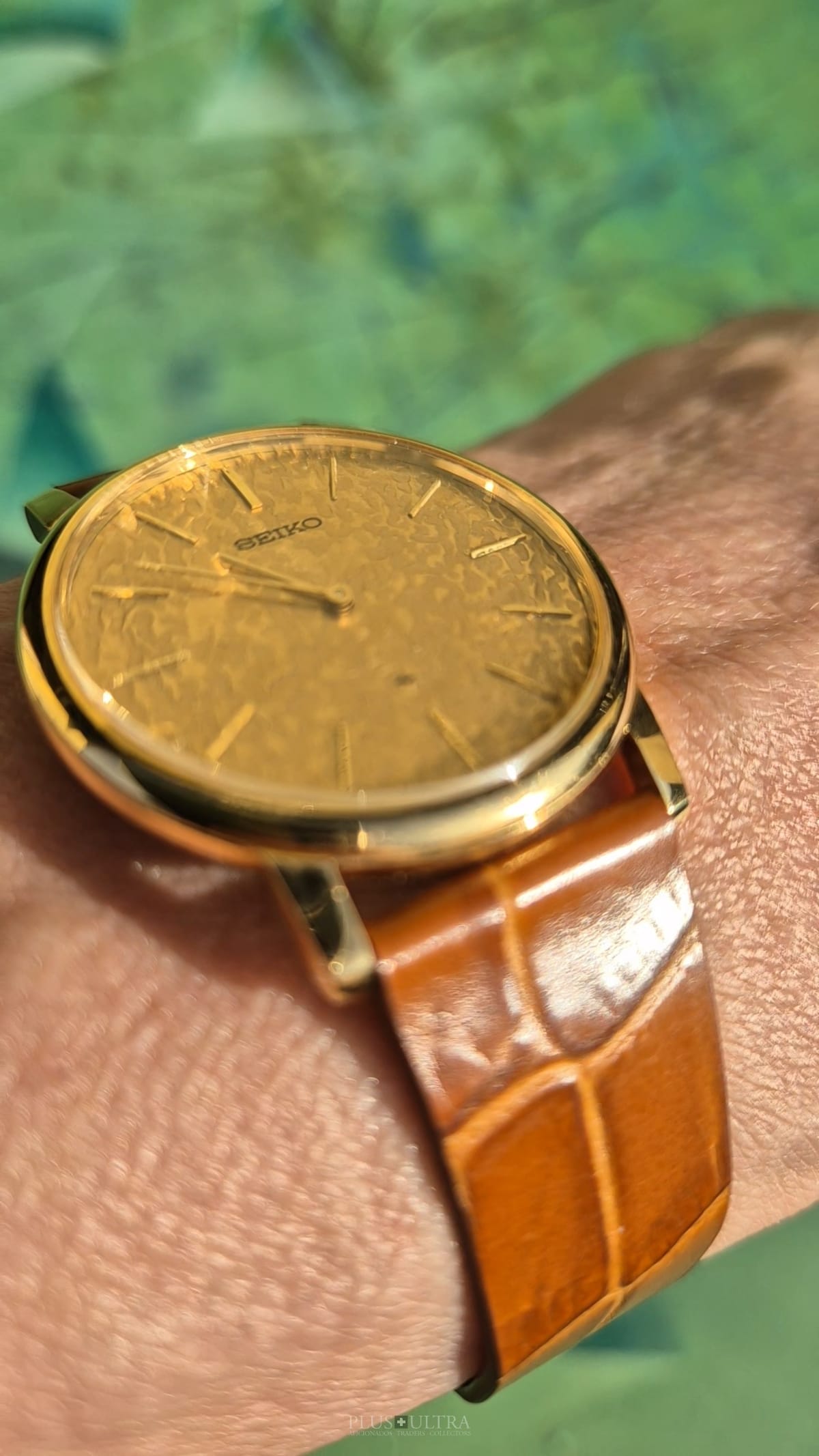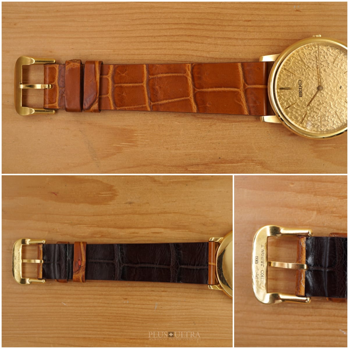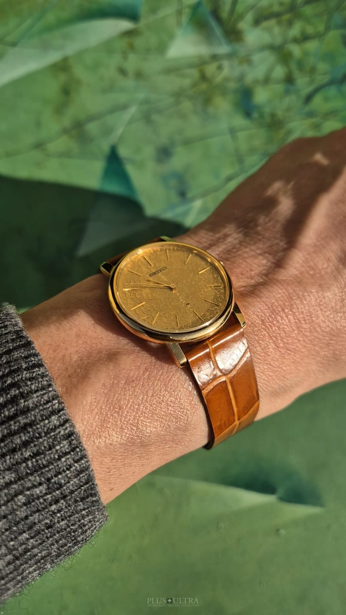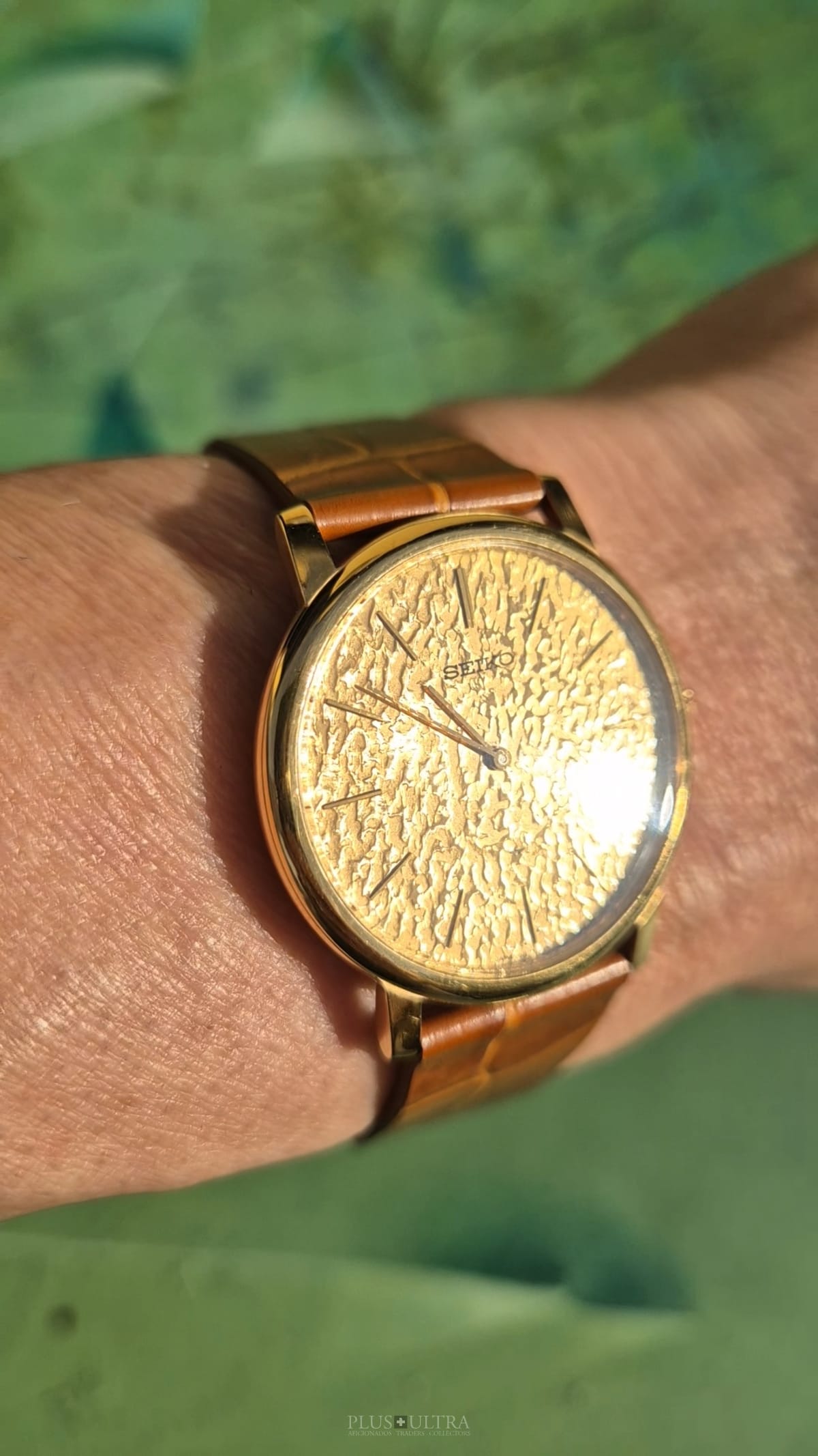 The golden dial with the naturalistic pattern is in very good condition and not only a joy to watch but also unobtrusively signed Seiko.